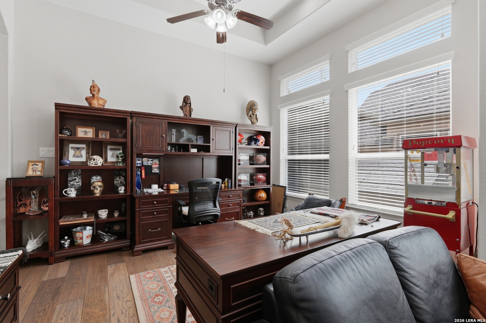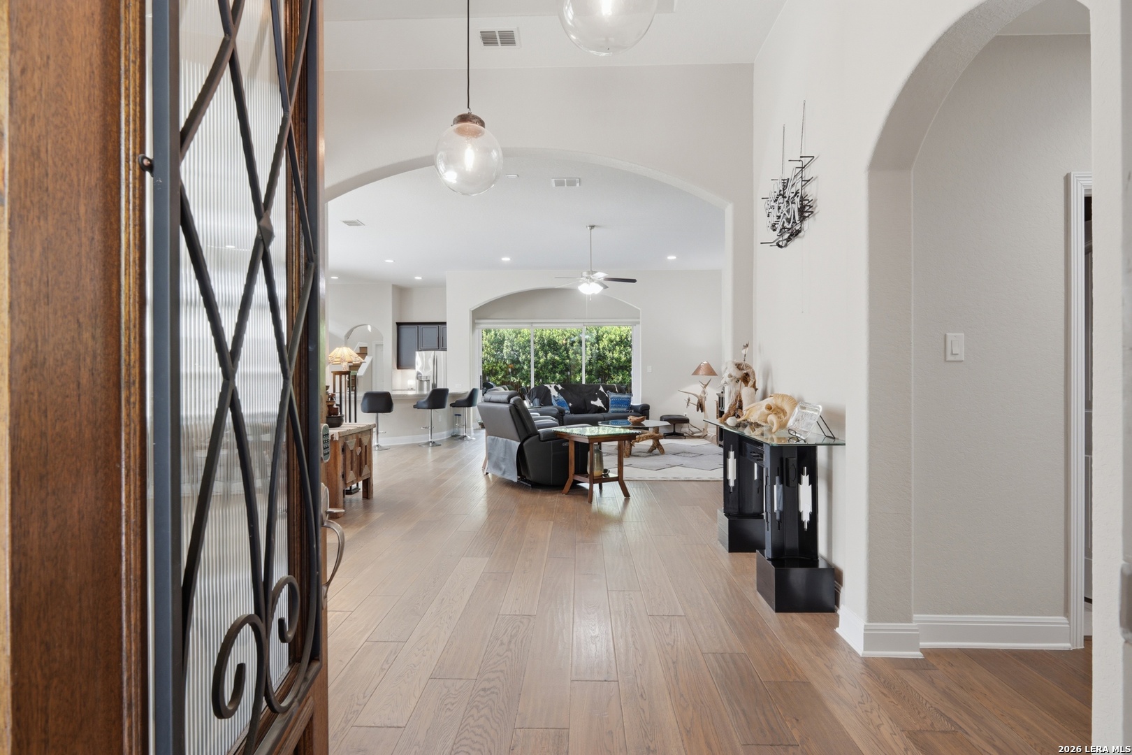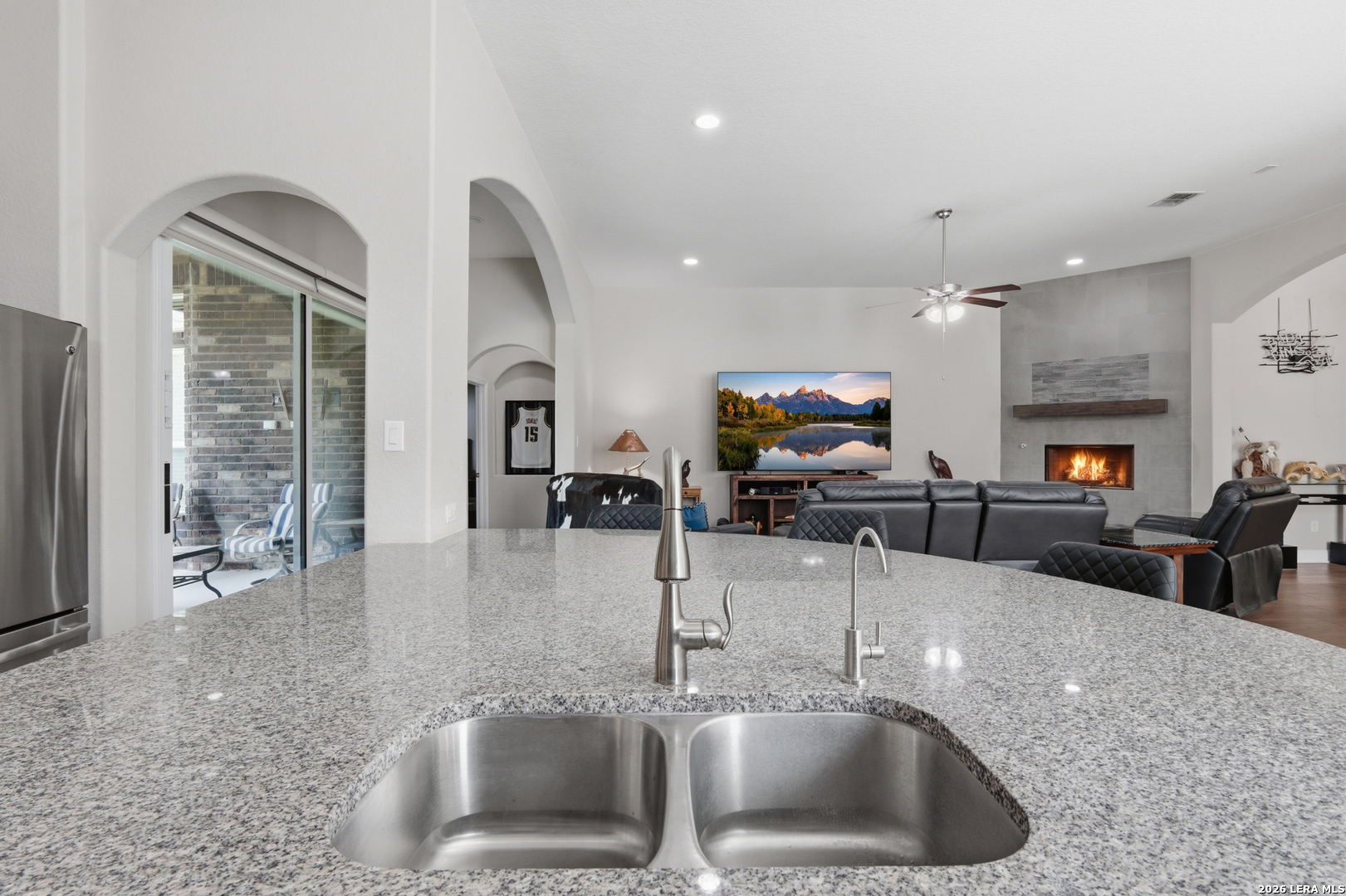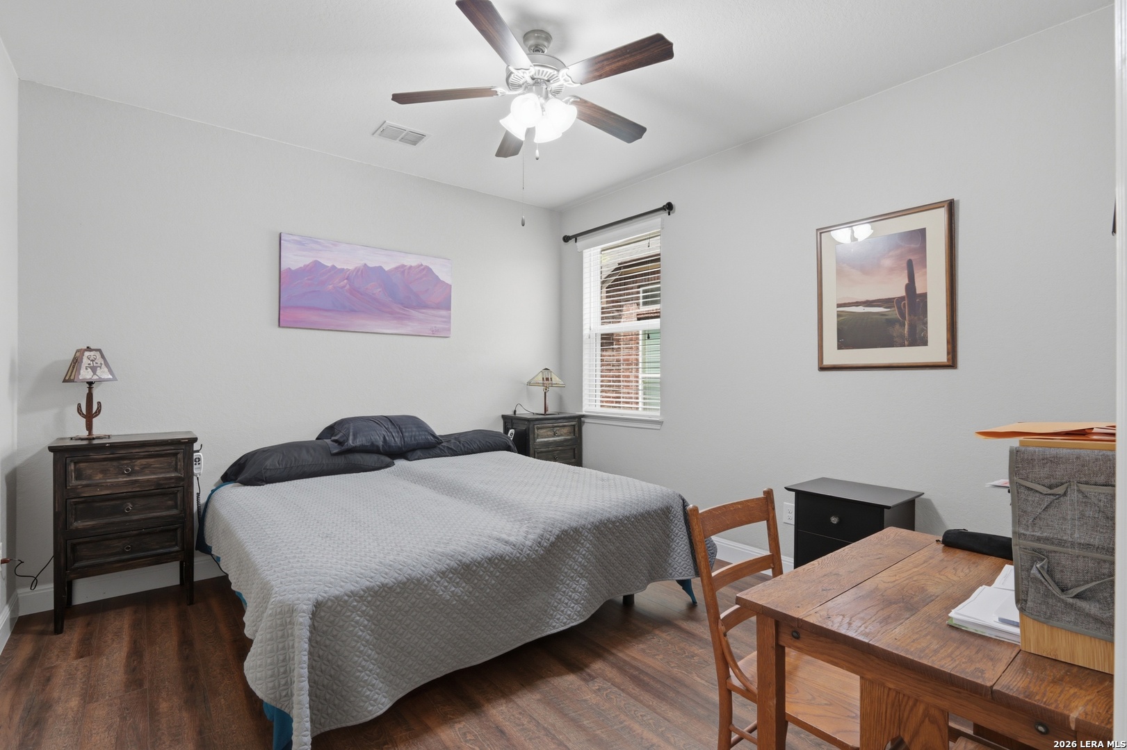 Nestled in the highly desirable gated community of Summit at Alamo Ranch, this exceptional property offers the ideal blend of comfort, style, and convenience. Located just minutes from HEB Plus, Loop 1604, and a wide variety of shopping and dining, everyday living is effortless. From the moment you arrive, the curb appeal makes a lasting impression. This four-sided masonry home showcases a beautiful blend of brick and stone, a spacious three-car garage, and an extended driveway with ample parking. A charming front patio invites you to enjoy peaceful mornings or relaxing evenings. Step inside to soaring 12-foot ceilings that set the tone for the open and airy layout. Natural light pours in through expansive windows and panoramic sliding glass doors that fully open, creating a seamless indoor-outdoor experience. French oak flooring flows throughout the main living areas, with luxury vinyl plank in the guest bedrooms, offering a completely carpet-free home. The living room is both spacious and inviting, featuring a modern gas fireplace accented by a stunning wood beam. Just off the living area, the formal dining room offers flexibility as a home office and is complemented by a bright breakfast nook nearby. The kitchen is truly a chef's dream, complete with an oversized island, granite countertops, soft-close custom cabinetry, and built-in appliances. A five-burner gas cooktop anchors the space, while a walk-in pantry leads to a generously sized laundry room with additional storage and a second refrigerator. Even better, all appliances convey with the home. This thoughtfully designed 1.5-story layout features three bedrooms on the main floor, including a private primary suite tucked away on one side of the home. The primary retreat offers high ceilings, abundant natural light, and a luxurious ensuite with dual vanities, a walk-in shower, and a spacious walk-in closet. Two secondary bedrooms are located on the opposite side, each with walk-in closets and access to a full bathroom with double sinks and a walk-in shower. A conveniently located half bath near the entry is perfect for guests. Upstairs, a large fourth bedroom with its own ensuite bathroom and walk-in closet provides incredible flexibility. With its generous size, it can easily function as a second primary suite, guest quarters, or a multi-generational living space. The three-car garage features high ceilings, overhead storage racks, a cooling fan system, and new garage doors installed in 2019. Step outside to an extended covered patio, ideal for entertaining, along with a spacious backyard featuring mature landscaping, a full sprinkler system, and an additional storage shed that will convey. Recent updates add even more value, including a roof replaced just three years ago, newer gutters, a water softener installed in 2022, a reverse osmosis water filtration system, and two water heaters replaced in 2023. The panoramic sliding doors are also equipped with automatic blinds for added convenience. Residents of Summit at Alamo Ranch enjoy access to fantastic community amenities, including a pool, playground, tennis courts, and basketball courts, all within a gated neighborhood zoned to top-rated schools. Come experience everything this incredible home has to offer and make it your own!