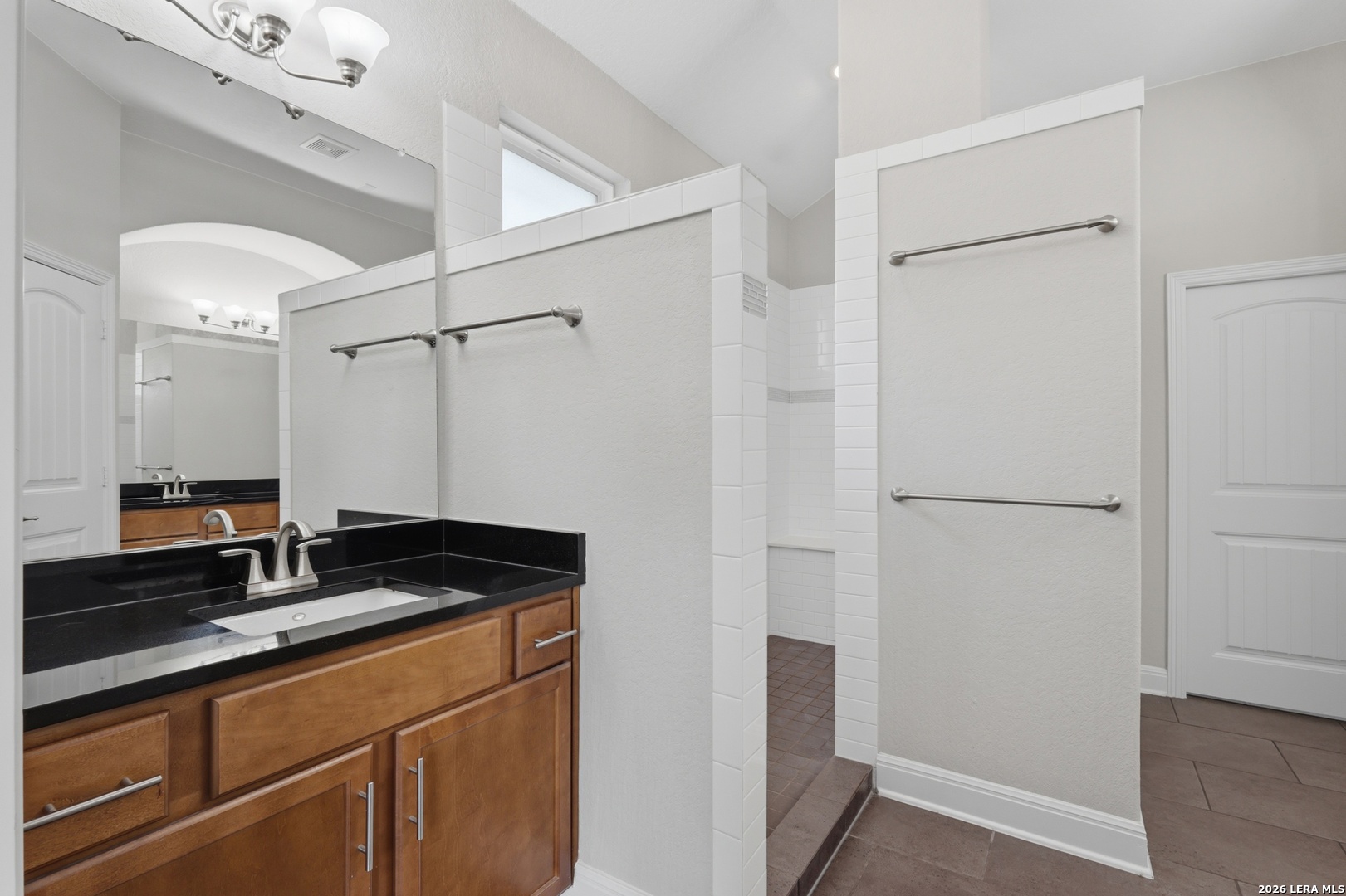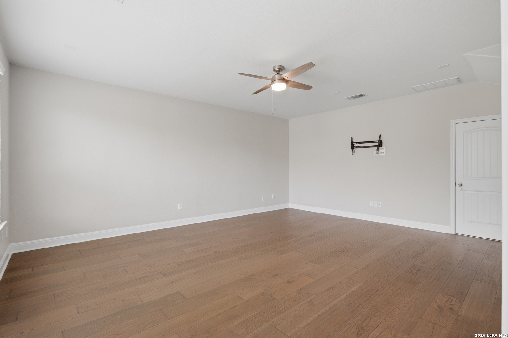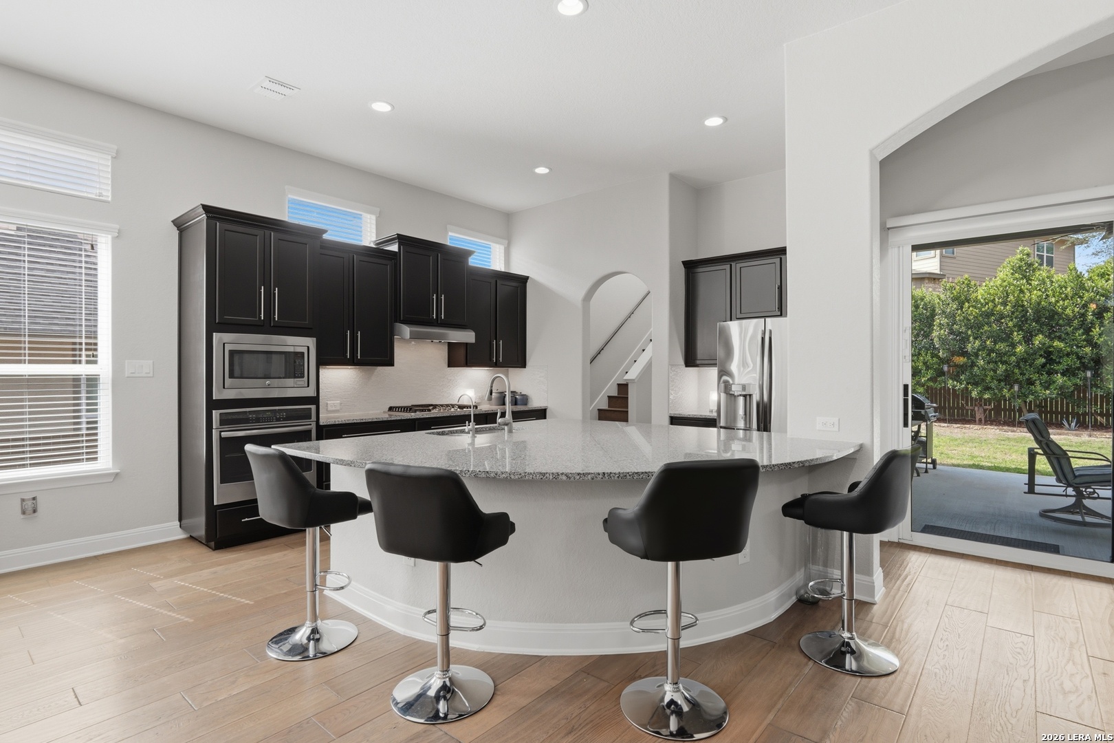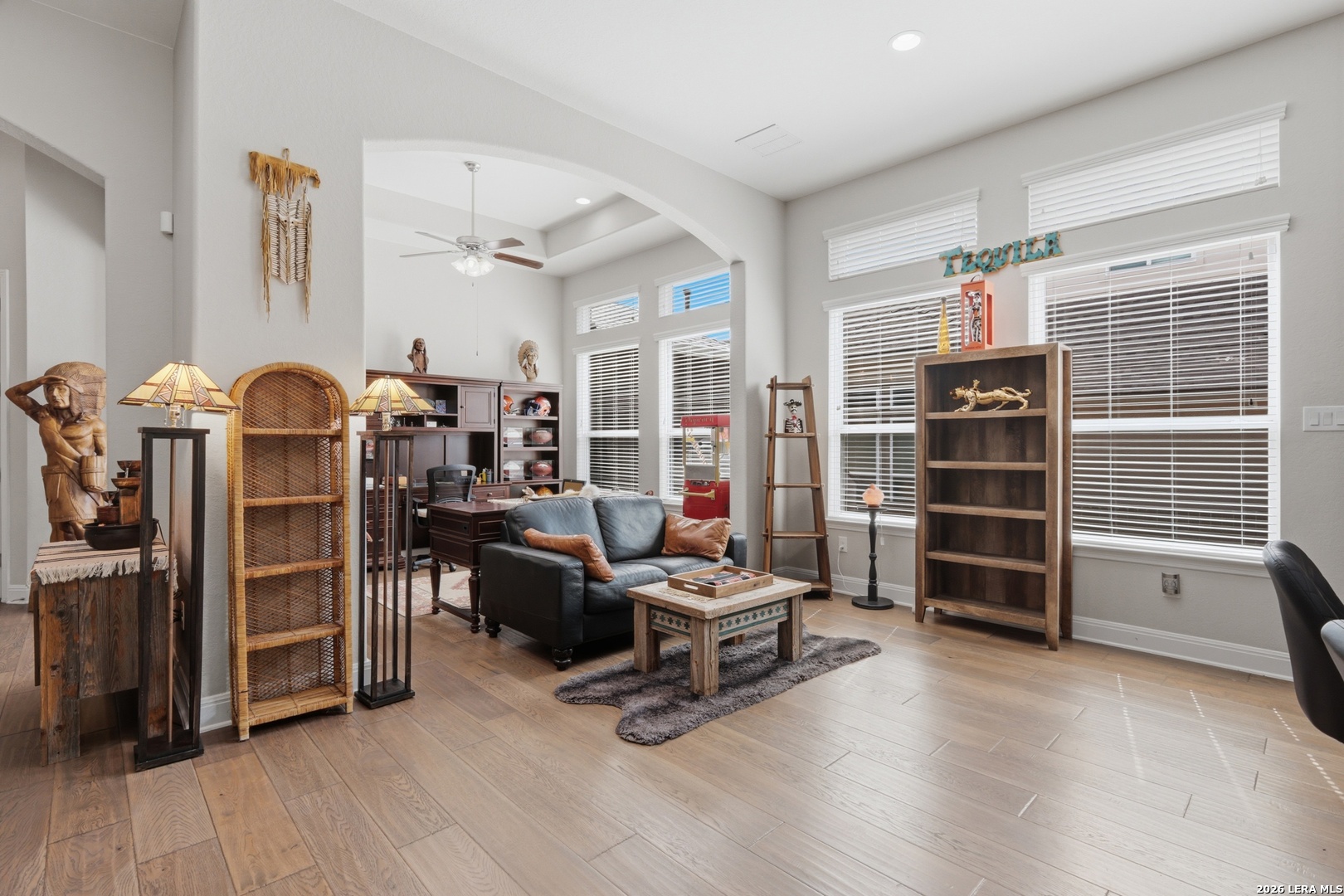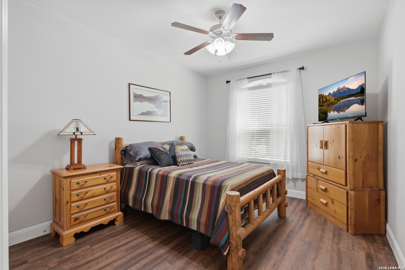 Nestled in the highly desirable gated community of Summit at Alamo Ranch, this exceptional property offers the ideal blend of comfort, style, and convenience. Located just minutes from HEB Plus, Loop 1604, and a wide variety of shopping and dining, everyday living is effortless. From the moment you arrive, the curb appeal makes a lasting impression. This four-sided masonry home showcases a beautiful blend of brick and stone, a spacious three-car garage, and an extended driveway with ample parking. A charming front patio invites you to enjoy peaceful mornings or relaxing evenings. Step inside to soaring 12-foot ceilings that set the tone for the open and airy layout. Natural light pours in through expansive windows and panoramic sliding glass doors that fully open, creating a seamless indoor-outdoor experience. French oak flooring flows throughout the main living areas, with luxury vinyl plank in the guest bedrooms, offering a completely carpet-free home. The living room is both spacious and inviting, featuring a modern gas fireplace accented by a stunning wood beam. Just off the living area, the formal dining room offers flexibility as a home office and is complemented by a bright breakfast nook nearby. The kitchen is truly a chef's dream, complete with an oversized island, granite countertops, soft-close custom cabinetry, and built-in appliances. A five-burner gas cooktop anchors the space, while a walk-in pantry leads to a generously sized laundry room with additional storage and a second refrigerator. Even better, all appliances convey with the home. This thoughtfully designed 1.5-story layout features three bedrooms on the main floor, including a private primary suite tucked away on one side of the home. The primary retreat offers high ceilings, abundant natural light, and a luxurious ensuite with dual vanities, a walk-in shower, and a spacious walk-in closet. Two secondary bedrooms are located on the opposite side, each with walk-in closets and access to a full bathroom with double sinks and a walk-in shower. A conveniently located half bath near the entry is perfect for guests. Upstairs, a large fourth bedroom with its own ensuite bathroom and walk-in closet provides incredible flexibility. With its generous size, it can easily function as a second primary suite, guest quarters, or a multi-generational living space. The three-car garage features high ceilings, overhead storage racks, a cooling fan system, and new garage doors installed in 2019. Step outside to an extended covered patio, ideal for entertaining, along with a spacious backyard featuring mature landscaping, a full sprinkler system, and an additional storage shed that will convey. Recent updates add even more value, including a roof replaced just three years ago, newer gutters, a water softener installed in 2022, a reverse osmosis water filtration system, and two water heaters replaced in 2023. The panoramic sliding doors are also equipped with automatic blinds for added convenience. Residents of Summit at Alamo Ranch enjoy access to fantastic community amenities, including a pool, playground, tennis courts, and basketball courts, all within a gated neighborhood zoned to top-rated schools. Come experience everything this incredible home has to offer and make it your own!