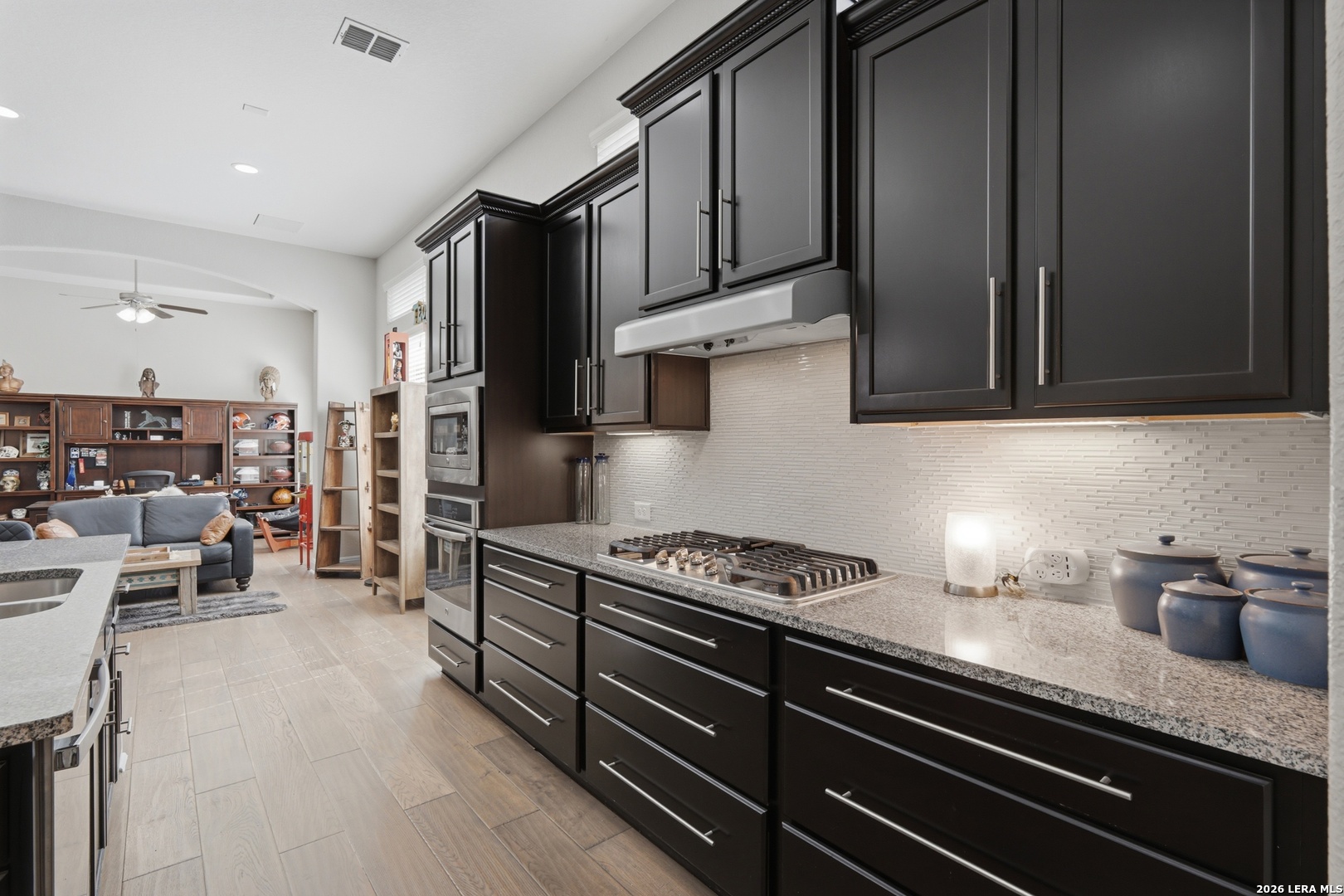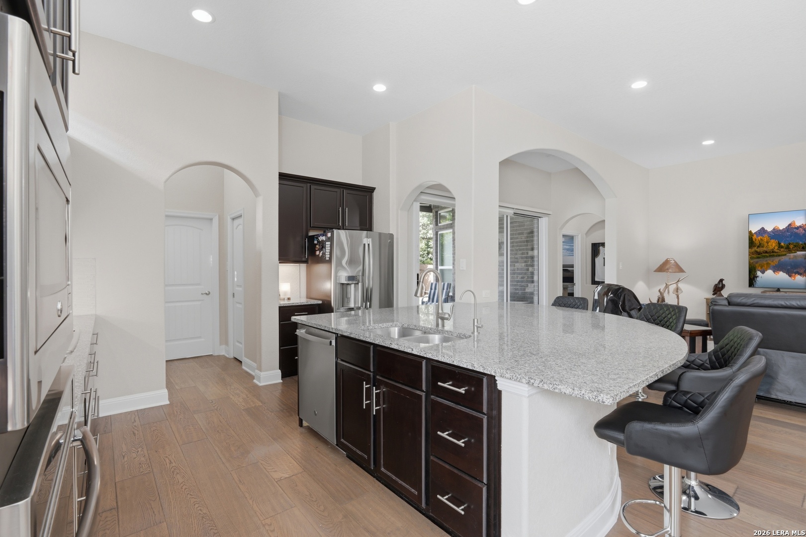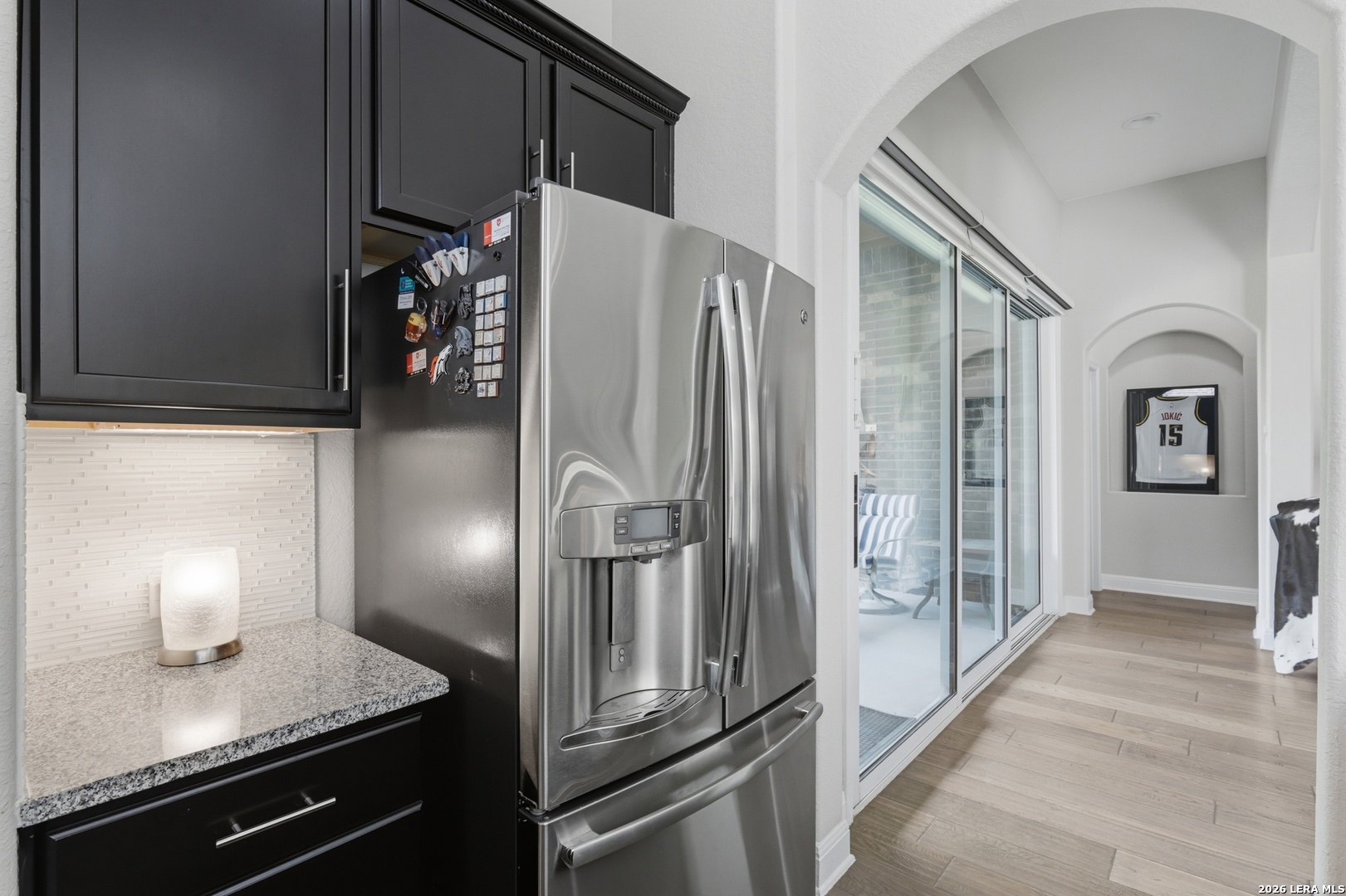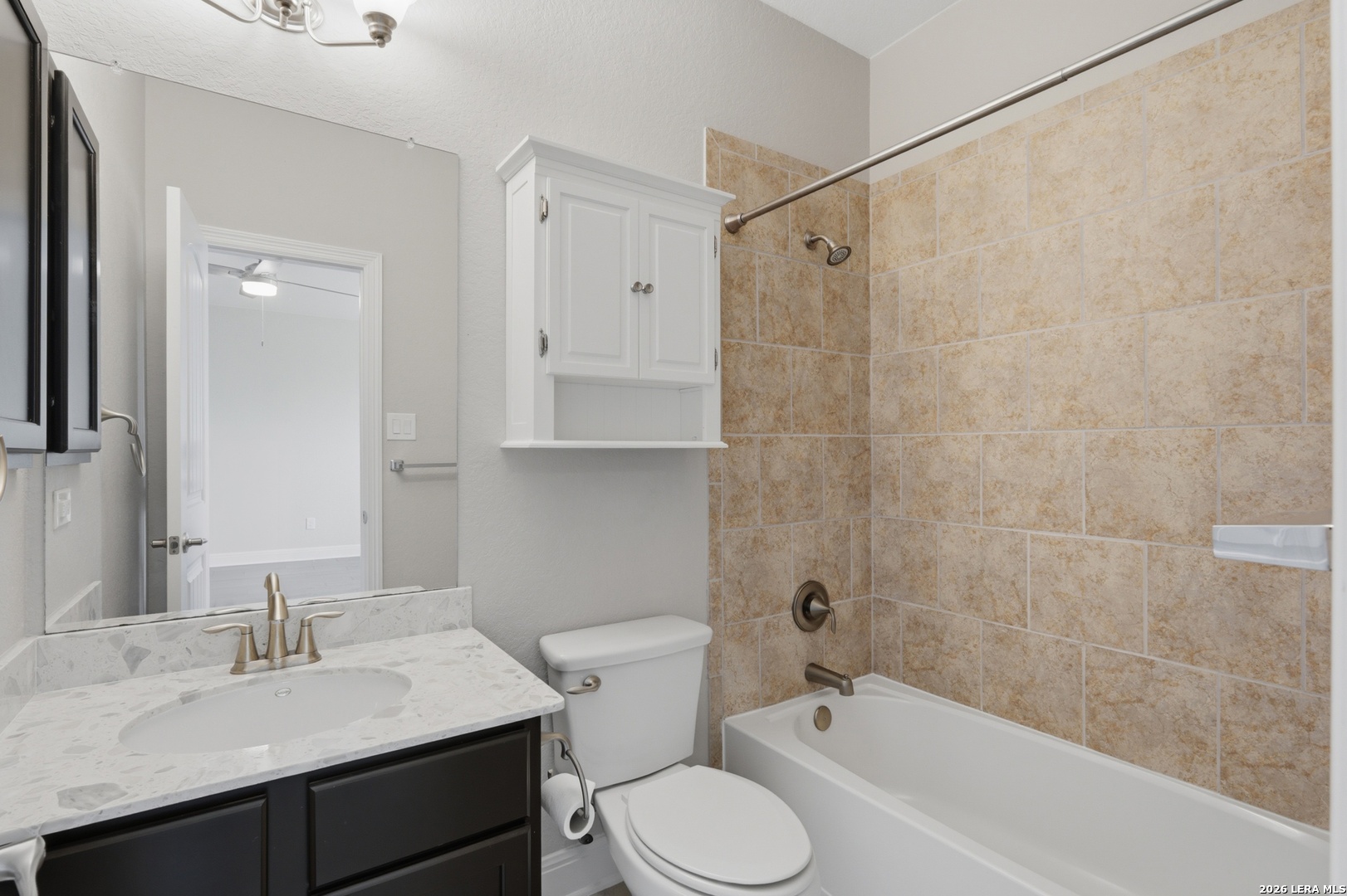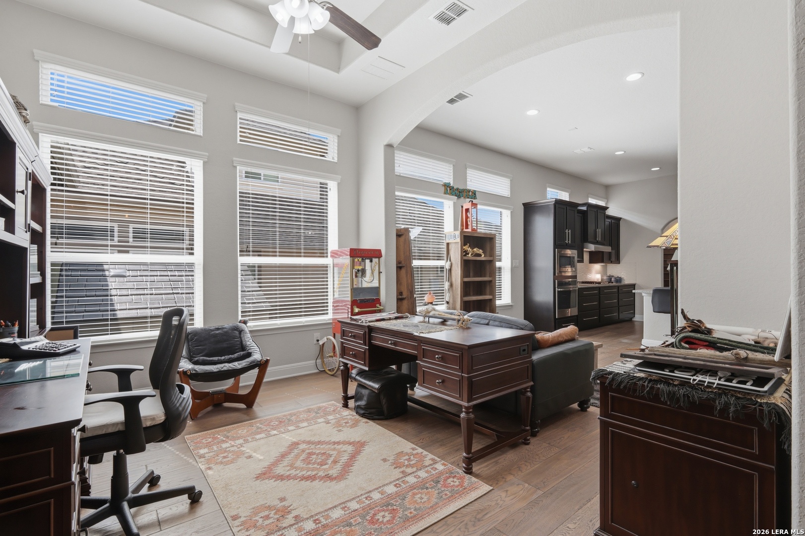 Nestled in the highly desirable gated community of Summit at Alamo Ranch, this exceptional property offers the ideal blend of comfort, style, and convenience. Located just minutes from HEB Plus, Loop 1604, and a wide variety of shopping and dining, everyday living is effortless. From the moment you arrive, the curb appeal makes a lasting impression. This four-sided masonry home showcases a beautiful blend of brick and stone, a spacious three-car garage, and an extended driveway with ample parking. A charming front patio invites you to enjoy peaceful mornings or relaxing evenings. Step inside to soaring 12-foot ceilings that set the tone for the open and airy layout. Natural light pours in through expansive windows and panoramic sliding glass doors that fully open, creating a seamless indoor-outdoor experience. French oak flooring flows throughout the main living areas, with luxury vinyl plank in the guest bedrooms, offering a completely carpet-free home. The living room is both spacious and inviting, featuring a modern gas fireplace accented by a stunning wood beam. Just off the living area, the formal dining room offers flexibility as a home office and is complemented by a bright breakfast nook nearby. The kitchen is truly a chef's dream, complete with an oversized island, granite countertops, soft-close custom cabinetry, and built-in appliances. A five-burner gas cooktop anchors the space, while a walk-in pantry leads to a generously sized laundry room with additional storage and a second refrigerator. Even better, all appliances convey with the home. This thoughtfully designed 1.5-story layout features three bedrooms on the main floor, including a private primary suite tucked away on one side of the home. The primary retreat offers high ceilings, abundant natural light, and a luxurious ensuite with dual vanities, a walk-in shower, and a spacious walk-in closet. Two secondary bedrooms are located on the opposite side, each with walk-in closets and access to a full bathroom with double sinks and a walk-in shower. A conveniently located half bath near the entry is perfect for guests. Upstairs, a large fourth bedroom with its own ensuite bathroom and walk-in closet provides incredible flexibility. With its generous size, it can easily function as a second primary suite, guest quarters, or a multi-generational living space. The three-car garage features high ceilings, overhead storage racks, a cooling fan system, and new garage doors installed in 2019. Step outside to an extended covered patio, ideal for entertaining, along with a spacious backyard featuring mature landscaping, a full sprinkler system, and an additional storage shed that will convey. Recent updates add even more value, including a roof replaced just three years ago, newer gutters, a water softener installed in 2022, a reverse osmosis water filtration system, and two water heaters replaced in 2023. The panoramic sliding doors are also equipped with automatic blinds for added convenience. Residents of Summit at Alamo Ranch enjoy access to fantastic community amenities, including a pool, playground, tennis courts, and basketball courts, all within a gated neighborhood zoned to top-rated schools. Come experience everything this incredible home has to offer and make it your own!