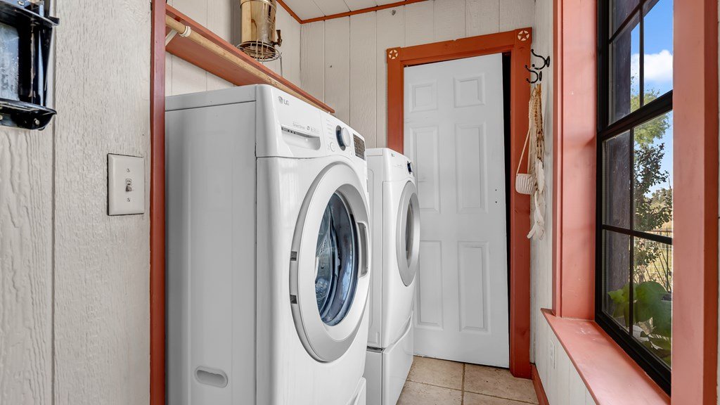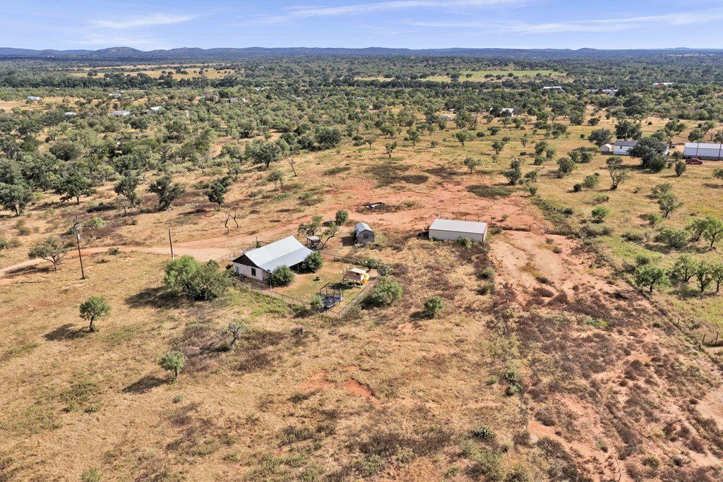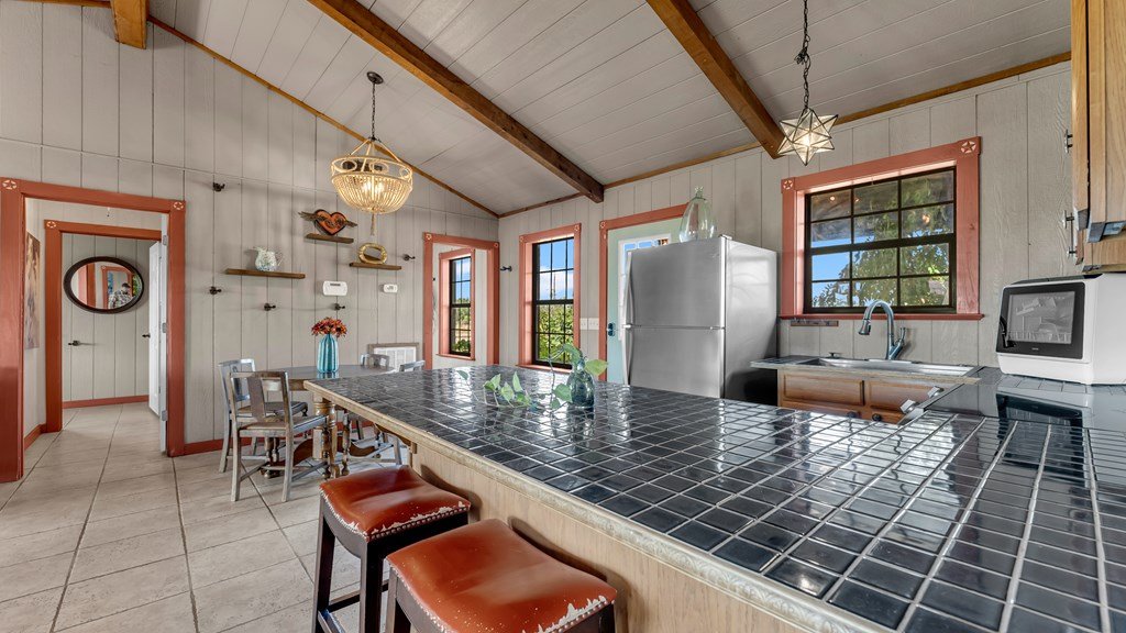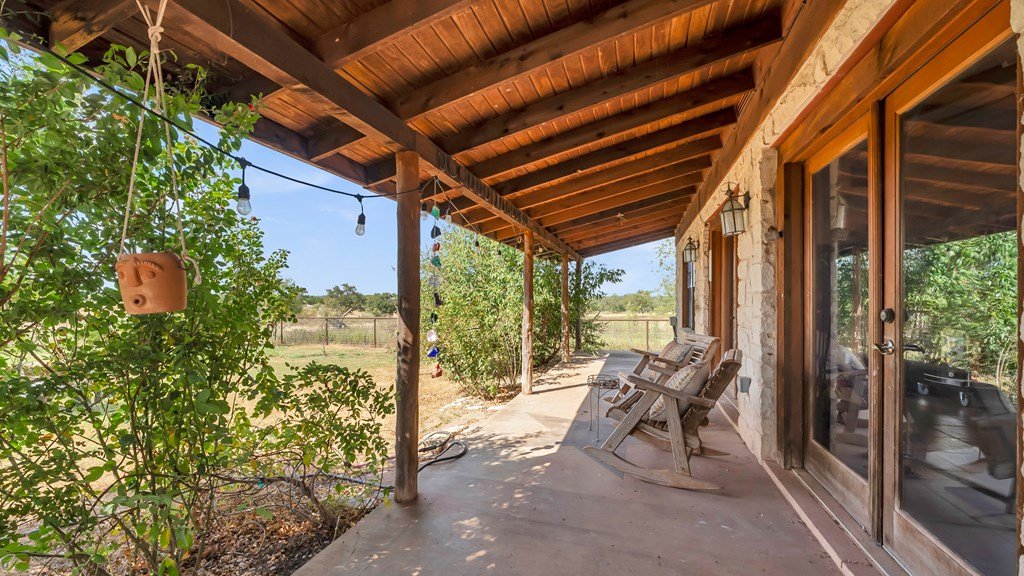 Set on over 10 scenic acres, this stylish white rock ranch home offers a perfect mix of rustic charm and modern ease. With an open layout, the 2-bedroom, 2-bath home features walk-in showers, durable tile flooring throughout, and a standing seam metal roof. A spacious covered back porch invites you to relax and take in the views, while the fenced backyard with a sprinkler-fed holding tank is ideal for pets, play, or gardening. Equestrian-ready, the property includes 4 horse stalls, a chicken coop, storage building, RV hookup, and full perimeter fencing for added privacy. A serene Hill Country retreat with thoughtful amenities for both living and leisure.