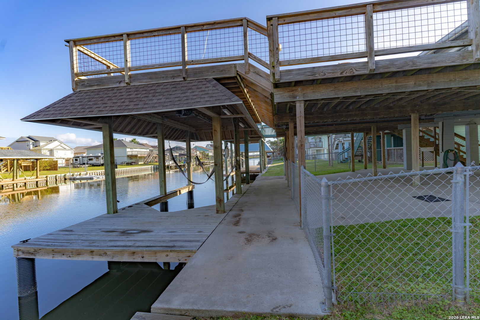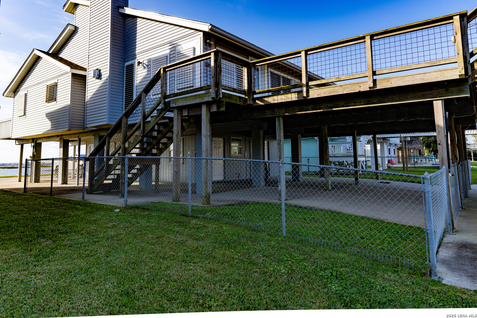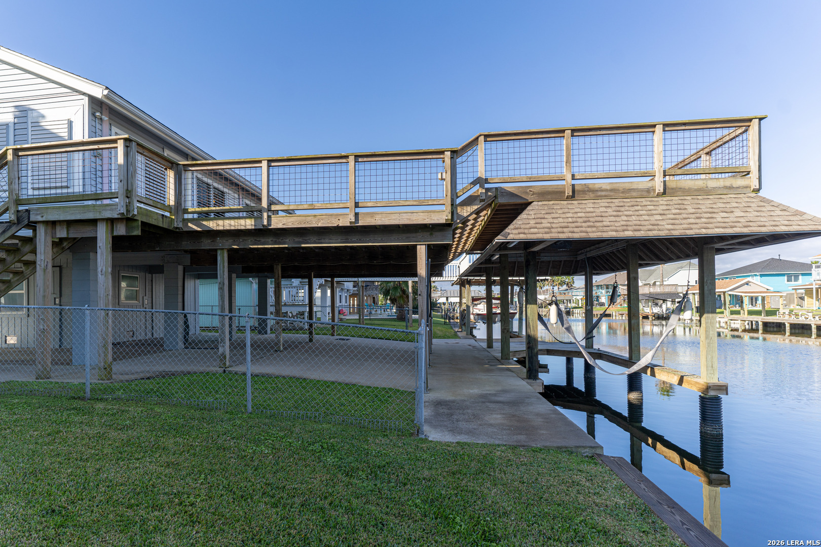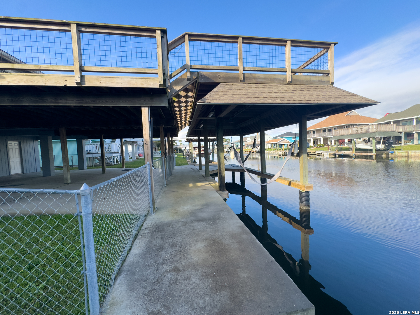 Among the best locations in Bayou Vista, this waterfront property offers the rare combination of canal frontage and unobstructed estuary views/access of Galveston Bay. Enjoy peaceful, wide-open water vistas from the estuary side, while also having protected canal access with a boat lift for easy days on the water. An expansive deck stretches from the house out over the boat lift-perfect for entertaining, relaxing, or taking in the coastal breeze. Fish, crab, or kayak from either side of the property (bay side or canal side). The fenced yard and downstairs patio offer convenience for pets and outdoor living. Upstairs, the open living area is filled with natural light, and the breakfast nook and two bedrooms feature double doors that open to the estuary, capturing the views and breeze. The layout includes three bedrooms, including a primary suite, plus a flexible nook off the living area ideal for bunk beds, a study, or additional sleeping space. Downstairs offers additional enclosed space with a full bath and mini-split system, providing versatility for guests, recreation, or storage (buyer to verify permitted uses and compliance with applicable regulations). Whether you're looking for a full-time residence or a weekend retreat, this property delivers a unique waterfront setting where location truly stands apart.