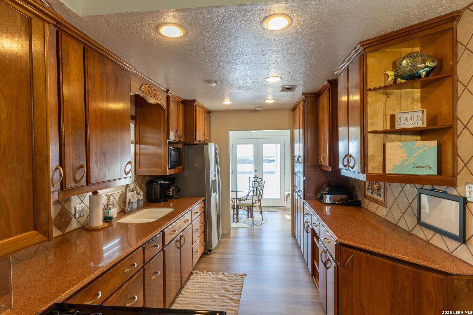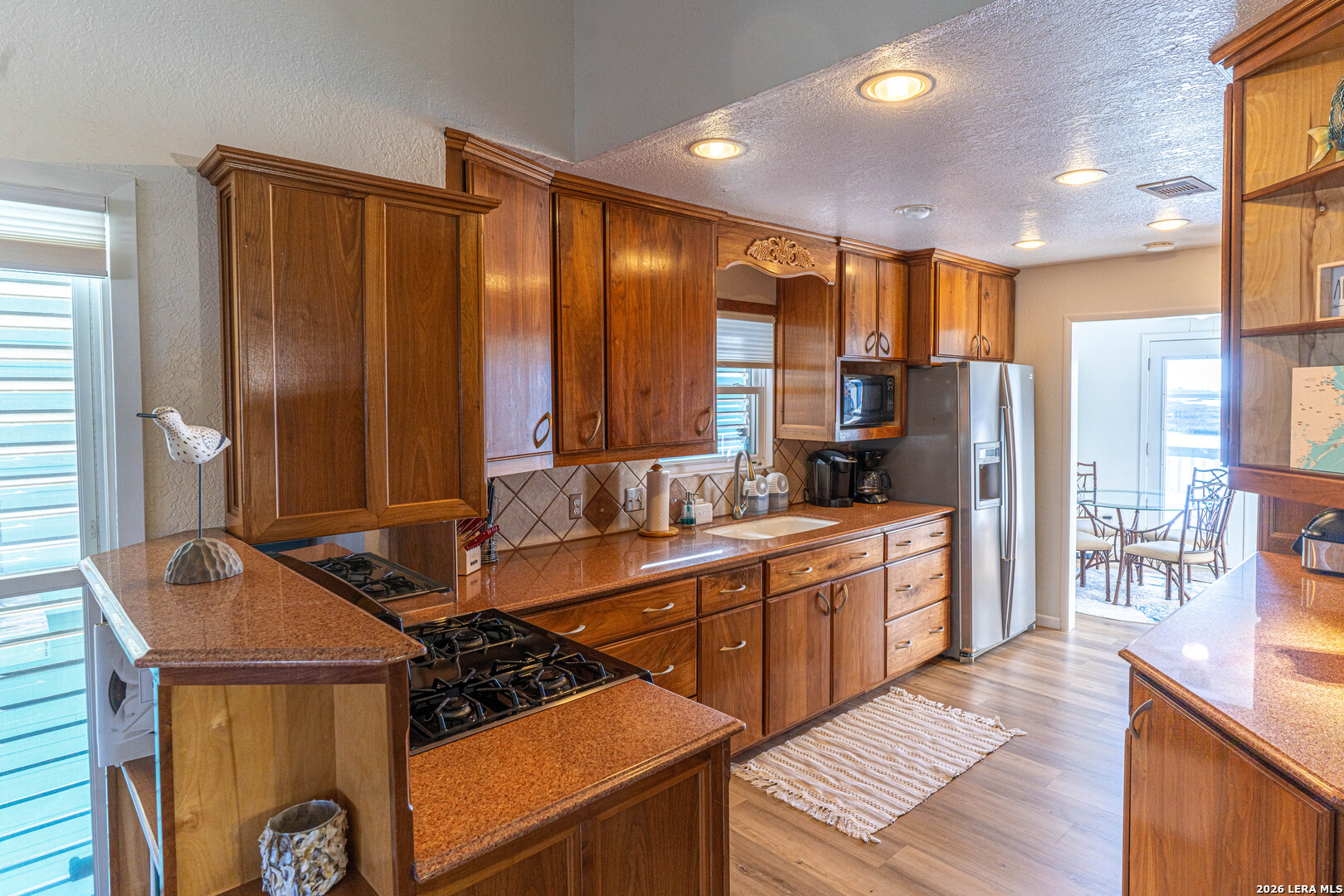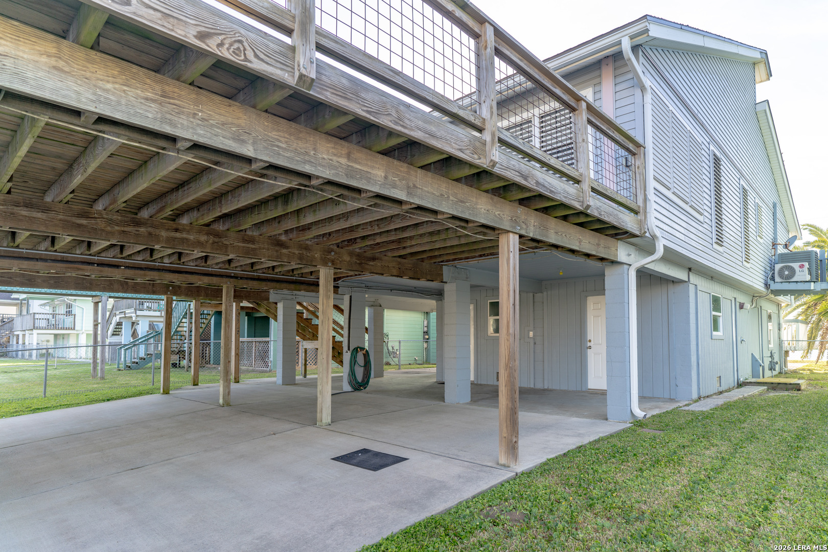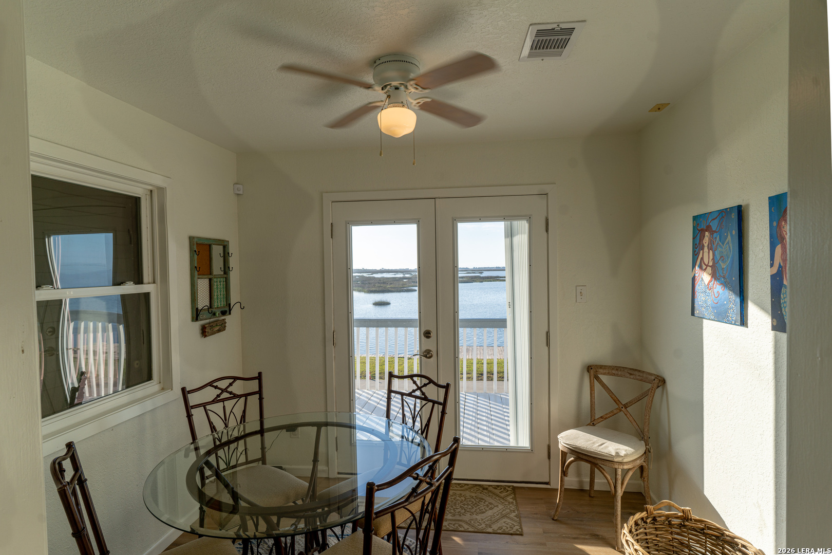 Among the best locations in Bayou Vista, this waterfront property offers the rare combination of canal frontage and unobstructed estuary views/access of Galveston Bay. Enjoy peaceful, wide-open water vistas from the estuary side, while also having protected canal access with a boat lift for easy days on the water. An expansive deck stretches from the house out over the boat lift-perfect for entertaining, relaxing, or taking in the coastal breeze. Fish, crab, or kayak from either side of the property (bay side or canal side). The fenced yard and downstairs patio offer convenience for pets and outdoor living. Upstairs, the open living area is filled with natural light, and the breakfast nook and two bedrooms feature double doors that open to the estuary, capturing the views and breeze. The layout includes three bedrooms, including a primary suite, plus a flexible nook off the living area ideal for bunk beds, a study, or additional sleeping space. Downstairs offers additional enclosed space with a full bath and mini-split system, providing versatility for guests, recreation, or storage (buyer to verify permitted uses and compliance with applicable regulations). Whether you're looking for a full-time residence or a weekend retreat, this property delivers a unique waterfront setting where location truly stands apart.
