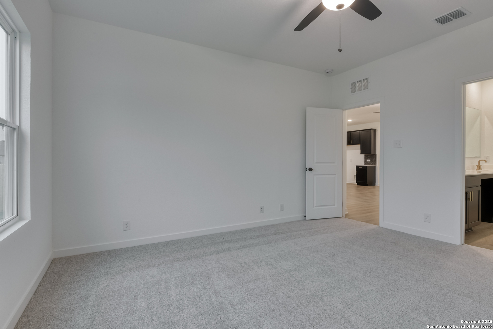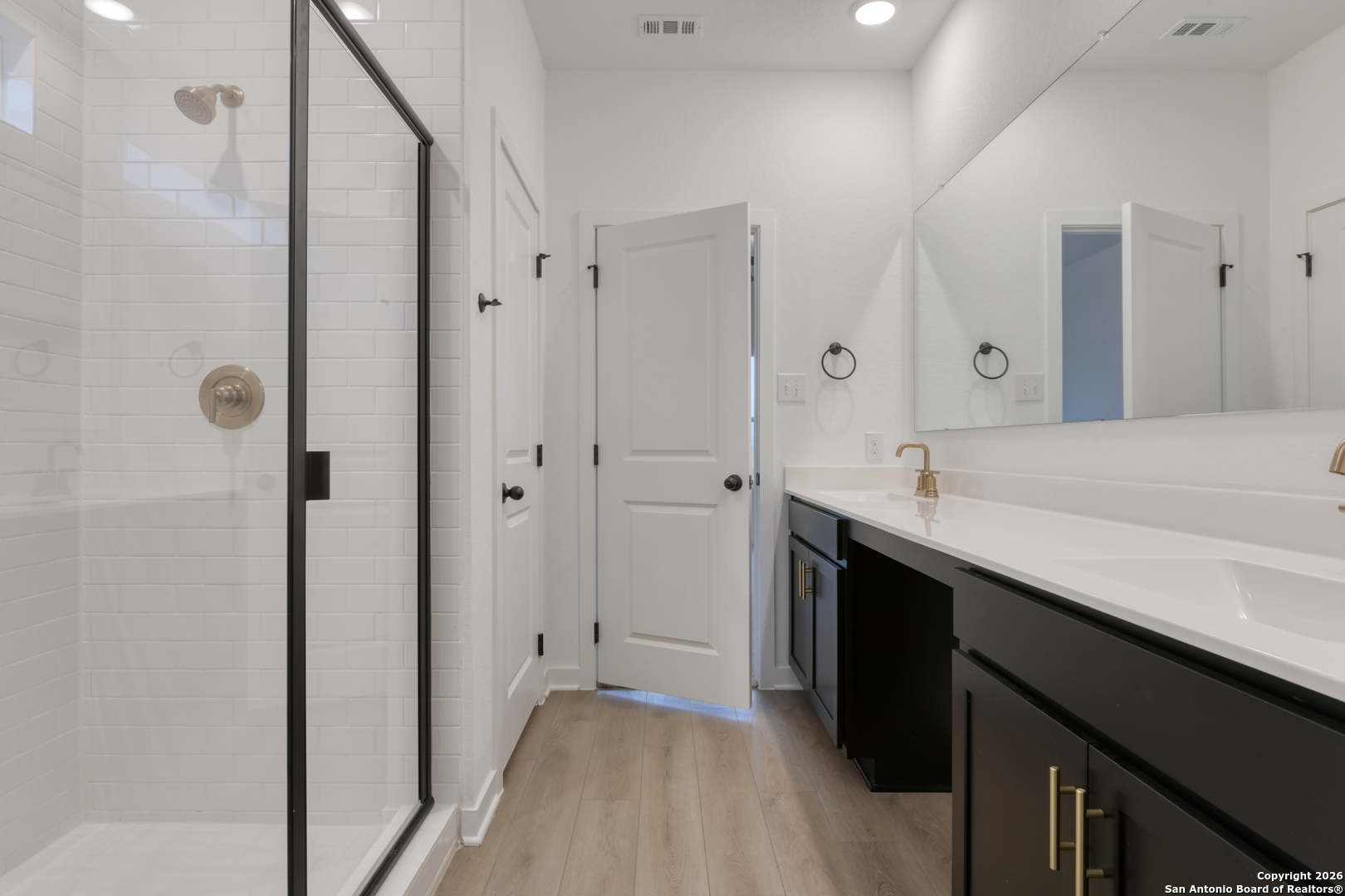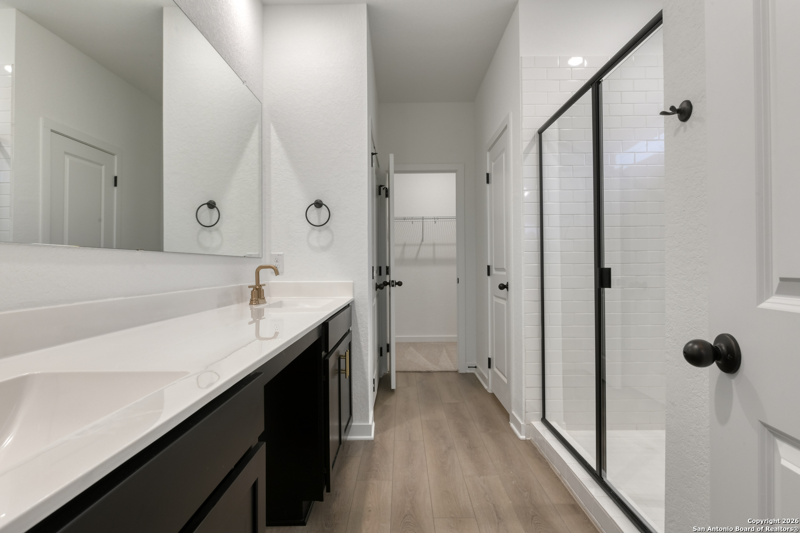This elegant one-story home blends modern style with everyday functionality, creating a space ideal for comfortable living and easy entertaining. The gourmet kitchen features quartz countertops, upgraded cabinetry, built-in appliances, and a spacious walk-in pantry, all opening seamlessly into the bright family room. Large windows fill the space with natural light and overlook the backyard, setting a warm tone for gatherings or quiet evenings at home. The private primary suite offers a well-appointed bath with a walk-in shower and double vanity, providing a relaxing retreat at the end of the day. With no rear neighbors, a long driveway for added convenience, and close proximity to future community amenities, this home offers privacy, comfort, and a lifestyle designed to grow with you. This home is part of our Noir Collection - designed with high contrasts, deep shadows, and an air of mystery. Charcoal and gold tones mix with textured woods, brass accents, and dramatic lighting to create an atmosphere that's both sophisticated and inviting. Noir is the soundtrack of clinking glasses, soft jazz, and rain on the window-a warm, alluring style that turns every day into an occasion. This home is in Saddlebrook Ranch, a master-planned community in Schertz, offering easy access to I-35, shopping, dining, Randolph AFB, a pool, playground, and top-rated schools.