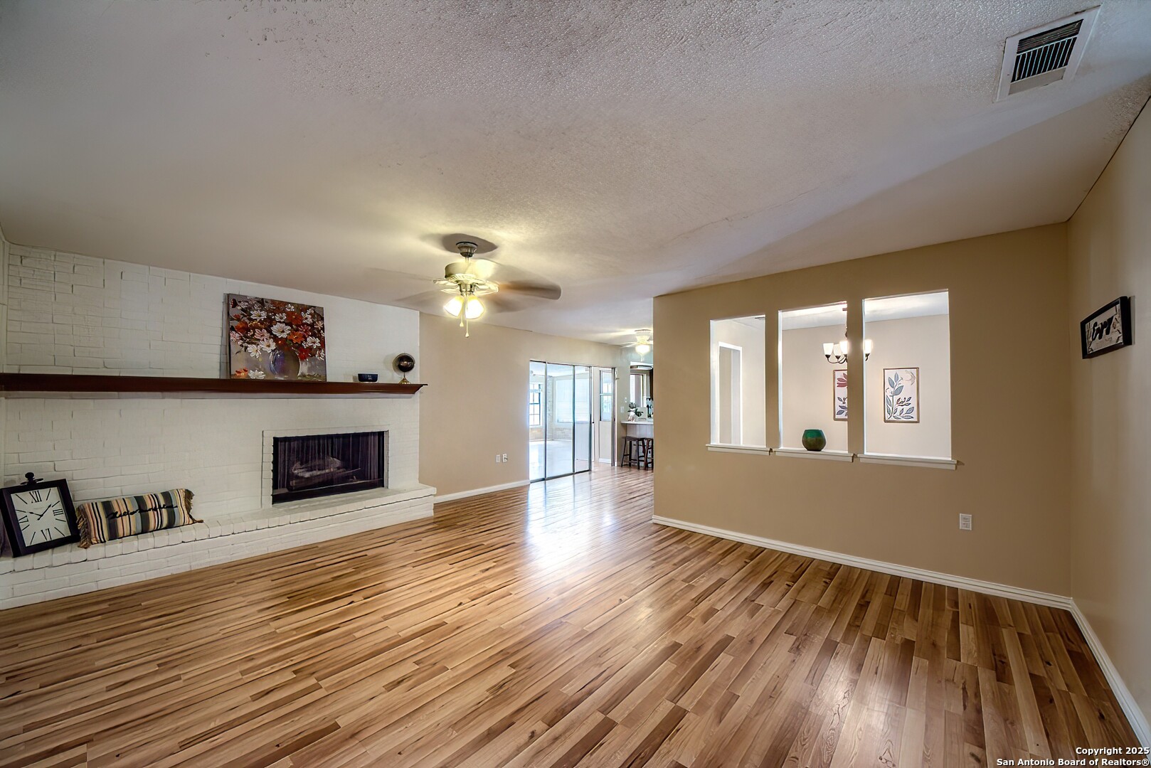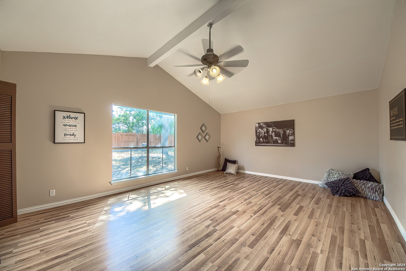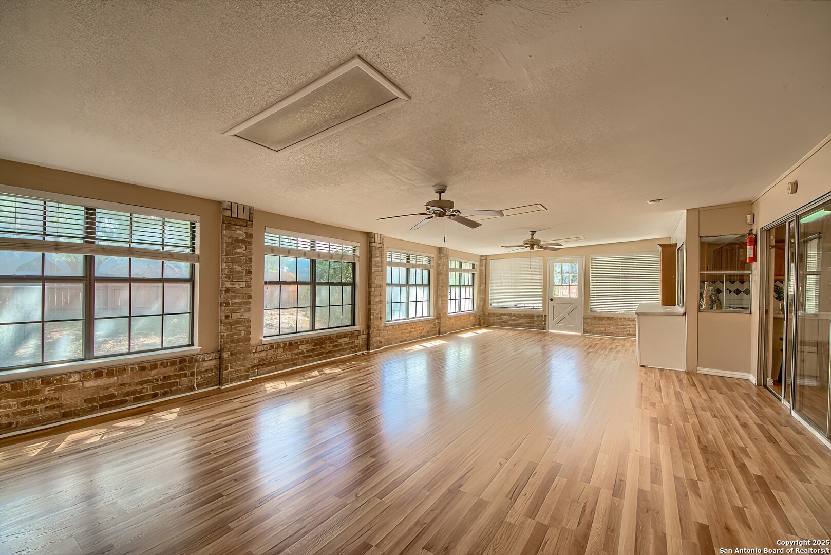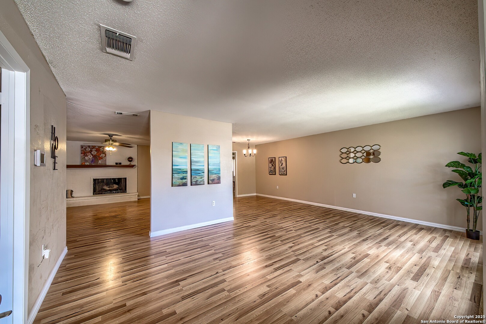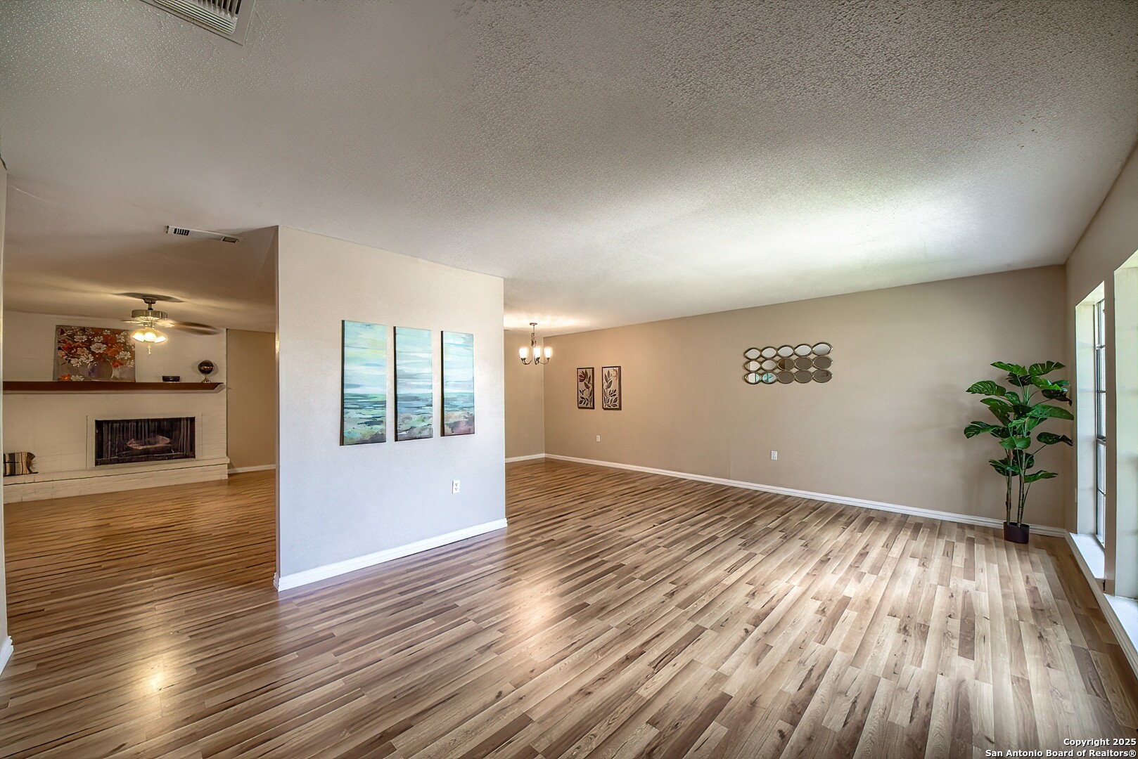 NEVER WANT FOR SPACE IN THIS AFFORDABLE SINGLE STORY BRICK RANCHER WITH NEW ROOF, FRESH PAINT, NEW LUXURY VINYL FLOORING AND A WORKSHOP! Well loved for decades by the same owners who raised their children here, this spacious single story is ready with open arms to welcome you in and turn all your possibilities into realities. Wind through the wide, tree-lined streets leading through Valley Forge and glide up to this charmer beneath mature trees and accented by smart xeriscaping and lawn. Open living is just a start to this traditional home modern comforts that offers more than you thought you could ask for at this price including a huge game room/sunroom and workshop on a slab, fully outfitted for all your projects! Step past the welcoming front porch and into the foyer to find a formal living room adjacent to a formal dining that is separate but still open to the family room and kitchen. A centerpiece, wood burning, brick fireplace with long hearth sets a cozy atmosphere in the family room that adjoins the breakfast nook. Offering original real wood cabinetry and plenty of countertop to work with, the kitchen is ready to go now or renovate to add your personal choices for upgrades. The adjacent laundry room includes cabinetry and shelving and leads into the two-car attached garage with pull-down attic access, storage cabinets and workbench. The primary suite is quite the production with one large room that hosts the adjacent ensuite bath, accessible with spacious walk-in shower with grab bars and no lip. But that's not all! Another doorway leads into the real retreat with beamed vaulted ceiling, two closets and tons of space for a third living area. Or, vice versa, use the first space as an office, exercise room or hobby room and this private enclave as your palatial bedroom. The secondary bedrooms share a guest bath in the hallway leading back to the rest of the house. Just off the family room is a giant air conditioned space to use as you will -- imagine entertaining with the outfitted bar with long counter top, wine nooks and glass shelves or work a business from this room as the owners did both over the years. Outside find a concrete walkway leading to the 18X13 workshop, on a slab, with electricity and work tables. Just add tools and get busy or turn into an office with exterior access if that is what you need! The owner added a concrete walkway from the gate to the shop for ease of use. The nice sized, level yard shaded by mature trees offers enough space for outdoor activities including gardening and playscape. Or, add a swimming pool and make this a real all-encompassing live, relax and work place you'd never have to leave! Located in an ultra-convenient, well established neighborhood -- right off I-35 at O'Connor near 1604 in NE San Antonio -- an easy commute to military bases to include RAFB, SAMMC and Fort Sam as well as all the cool things to do downtown at the Riverwalk. Shopping and restaurants are just minutes away as are the NEISD schools the home is zoned to attend. If you work from home and/or run a business from home, or if multi-generational living is what you need, this property checks every box. There is no HOA to worry about, just city regulations, so feel free to have chickens and other options usually governed by HOAs. The new architectural shingle roof with 30 year shingles will help keep your property insurance costs lower than other homes. Don't wait for another opportunity like this to come along, run and see this one and make it your own.
