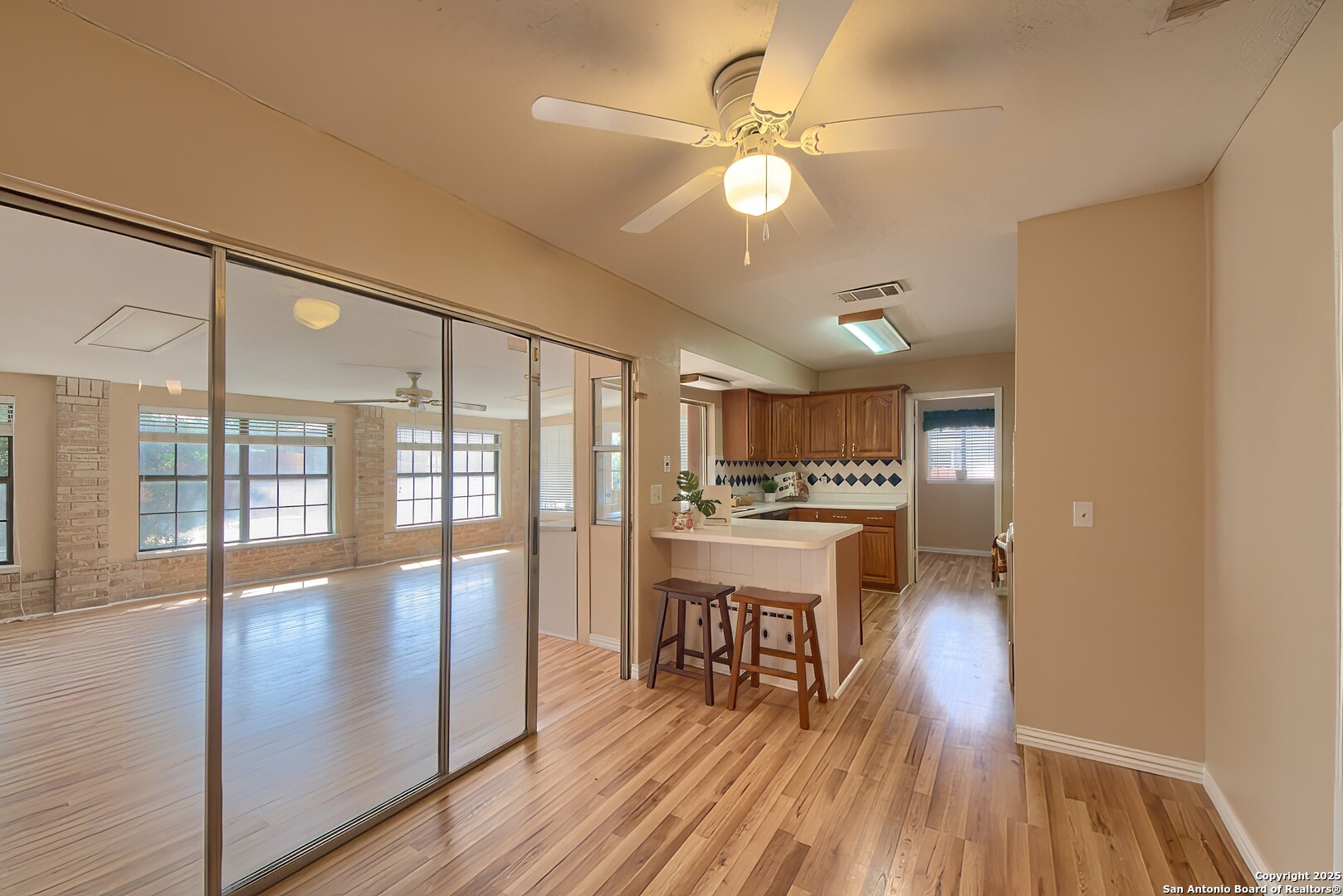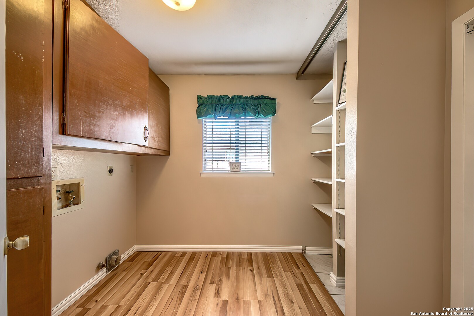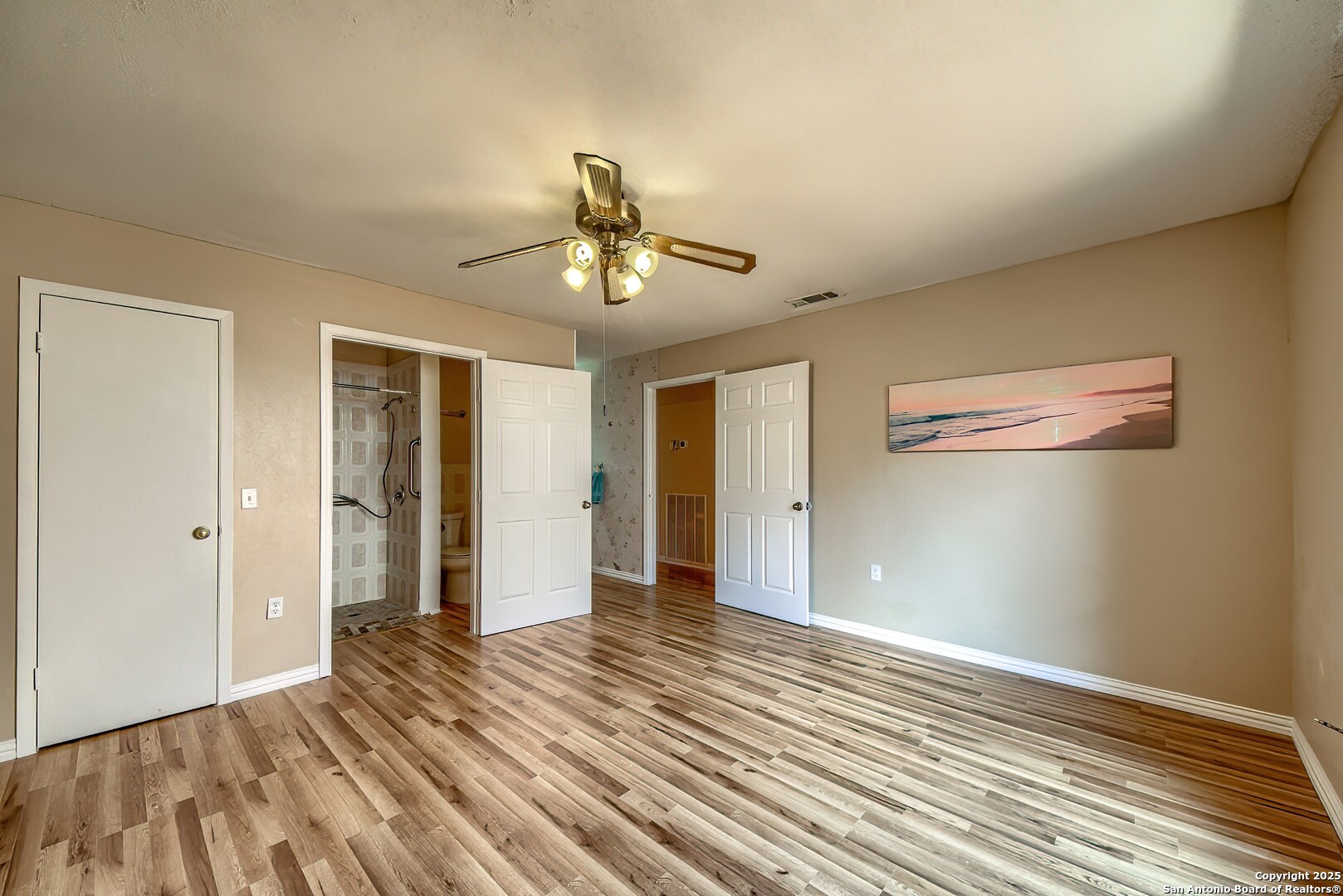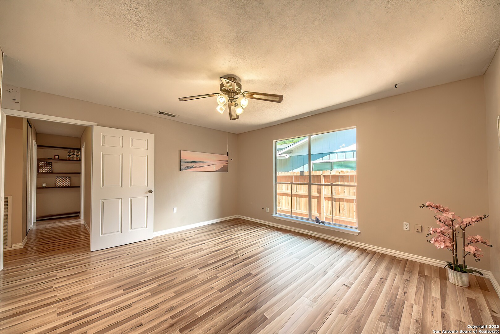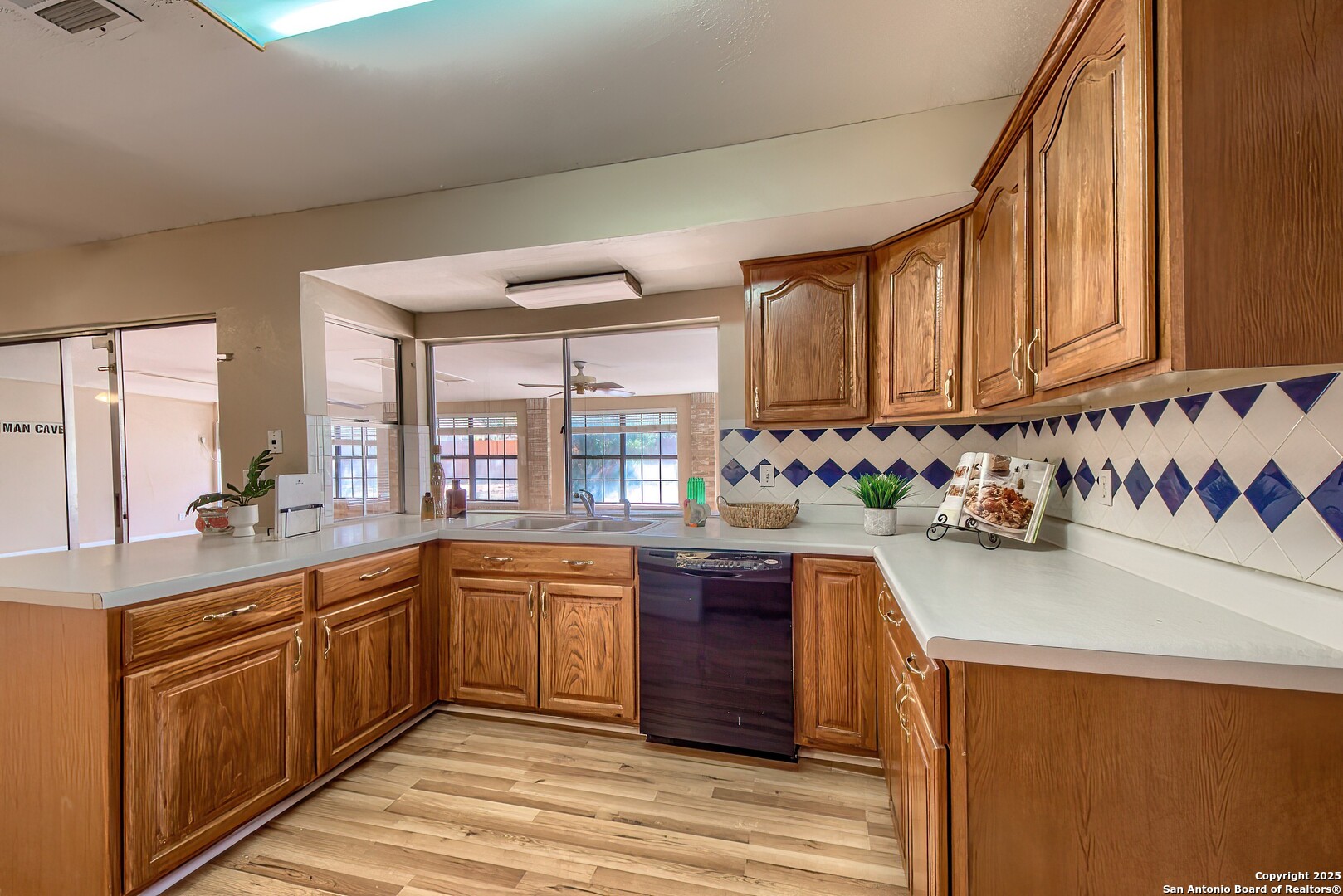 NEVER WANT FOR SPACE IN THIS AFFORDABLE SINGLE STORY BRICK RANCHER WITH NEW ROOF, FRESH PAINT, NEW LUXURY VINYL FLOORING AND A WORKSHOP! Well loved for decades by the same owners who raised their children here, this spacious single story is ready with open arms to welcome you in and turn all your possibilities into realities. Wind through the wide, tree-lined streets leading through Valley Forge and glide up to this charmer beneath mature trees and accented by smart xeriscaping and lawn. Open living is just a start to this traditional home modern comforts that offers more than you thought you could ask for at this price including a huge game room/sunroom and workshop on a slab, fully outfitted for all your projects! Step past the welcoming front porch and into the foyer to find a formal living room adjacent to a formal dining that is separate but still open to the family room and kitchen. A centerpiece, wood burning, brick fireplace with long hearth sets a cozy atmosphere in the family room that adjoins the breakfast nook. Offering original real wood cabinetry and plenty of countertop to work with, the kitchen is ready to go now or renovate to add your personal choices for upgrades. The adjacent laundry room includes cabinetry and shelving and leads into the two-car attached garage with pull-down attic access, storage cabinets and workbench. The primary suite is quite the production with one large room that hosts the adjacent ensuite bath, accessible with spacious walk-in shower with grab bars and no lip. But that's not all! Another doorway leads into the real retreat with beamed vaulted ceiling, two closets and tons of space for a third living area. Or, vice versa, use the first space as an office, exercise room or hobby room and this private enclave as your palatial bedroom. The secondary bedrooms share a guest bath in the hallway leading back to the rest of the house. Just off the family room is a giant air conditioned space to use as you will -- imagine entertaining with the outfitted bar with long counter top, wine nooks and glass shelves or work a business from this room as the owners did both over the years. Outside find a concrete walkway leading to the 18X13 workshop, on a slab, with electricity and work tables. Just add tools and get busy or turn into an office with exterior access if that is what you need! The owner added a concrete walkway from the gate to the shop for ease of use. The nice sized, level yard shaded by mature trees offers enough space for outdoor activities including gardening and playscape. Or, add a swimming pool and make this a real all-encompassing live, relax and work place you'd never have to leave! Located in an ultra-convenient, well established neighborhood -- right off I-35 at O'Connor near 1604 in NE San Antonio -- an easy commute to military bases to include RAFB, SAMMC and Fort Sam as well as all the cool things to do downtown at the Riverwalk. Shopping and restaurants are just minutes away as are the NEISD schools the home is zoned to attend. If you work from home and/or run a business from home, or if multi-generational living is what you need, this property checks every box. There is no HOA to worry about, just city regulations, so feel free to have chickens and other options usually governed by HOAs. The new architectural shingle roof with 30 year shingles will help keep your property insurance costs lower than other homes. Don't wait for another opportunity like this to come along, run and see this one and make it your own.
