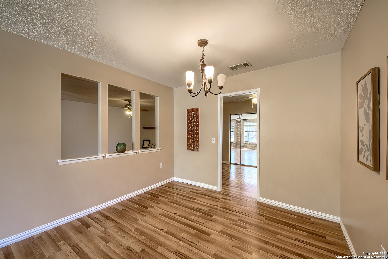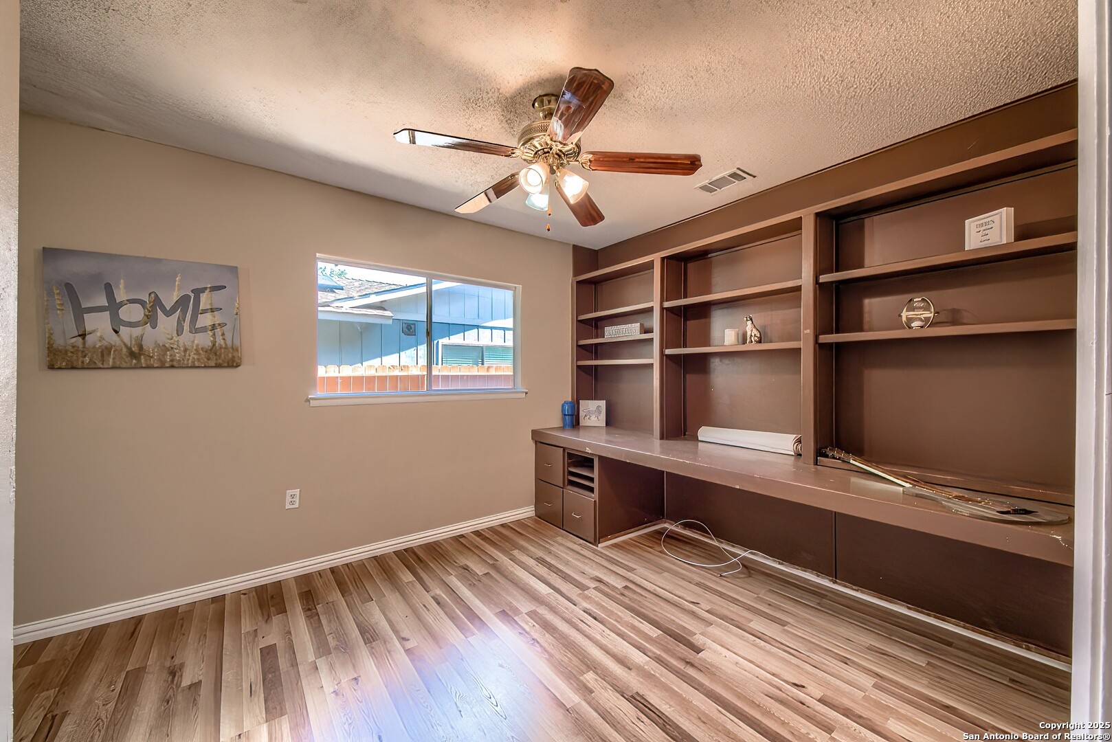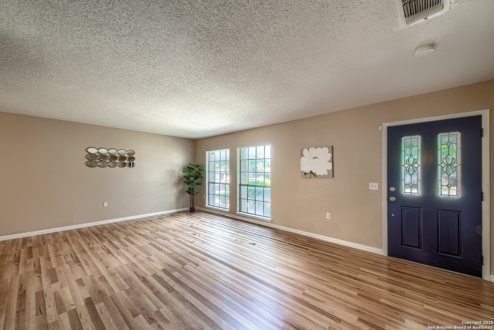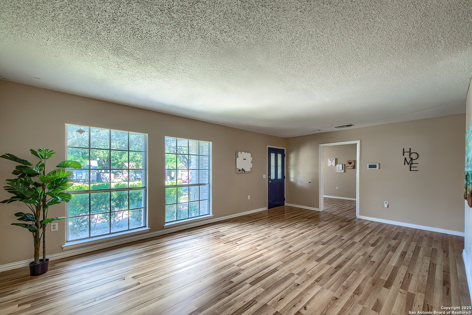 NEVER WANT FOR SPACE IN THIS AFFORDABLE SINGLE STORY BRICK RANCHER WITH NEW ROOF, FRESH PAINT, NEW LUXURY VINYL FLOORING AND A WORKSHOP! Well loved for decades by the same owners who raised their children here, this spacious single story is ready with open arms to welcome you in and turn all your possibilities into realities. Wind through the wide, tree-lined streets leading through Valley Forge and glide up to this charmer beneath mature trees and accented by smart xeriscaping and lawn. Open living is just a start to this traditional home modern comforts that offers more than you thought you could ask for at this price including a huge game room/sunroom and workshop on a slab, fully outfitted for all your projects! Step past the welcoming front porch and into the foyer to find a formal living room adjacent to a formal dining that is separate but still open to the family room and kitchen. A centerpiece, wood burning, brick fireplace with long hearth sets a cozy atmosphere in the family room that adjoins the breakfast nook. Offering original real wood cabinetry and plenty of countertop to work with, the kitchen is ready to go now or renovate to add your personal choices for upgrades. The adjacent laundry room includes cabinetry and shelving and leads into the two-car attached garage with pull-down attic access, storage cabinets and workbench. The primary suite is quite the production with one large room that hosts the adjacent ensuite bath, accessible with spacious walk-in shower with grab bars and no lip. But that's not all! Another doorway leads into the real retreat with beamed vaulted ceiling, two closets and tons of space for a third living area. Or, vice versa, use the first space as an office, exercise room or hobby room and this private enclave as your palatial bedroom. The secondary bedrooms share a guest bath in the hallway leading back to the rest of the house. Just off the family room is a giant air conditioned space to use as you will -- imagine entertaining with the outfitted bar with long counter top, wine nooks and glass shelves or work a business from this room as the owners did both over the years. Outside find a concrete walkway leading to the 18X13 workshop, on a slab, with electricity and work tables. Just add tools and get busy or turn into an office with exterior access if that is what you need! The owner added a concrete walkway from the gate to the shop for ease of use. The nice sized, level yard shaded by mature trees offers enough space for outdoor activities including gardening and playscape. Or, add a swimming pool and make this a real all-encompassing live, relax and work place you'd never have to leave! Located in an ultra-convenient, well established neighborhood -- right off I-35 at O'Connor near 1604 in NE San Antonio -- an easy commute to military bases to include RAFB, SAMMC and Fort Sam as well as all the cool things to do downtown at the Riverwalk. Shopping and restaurants are just minutes away as are the NEISD schools the home is zoned to attend. If you work from home and/or run a business from home, or if multi-generational living is what you need, this property checks every box. There is no HOA to worry about, just city regulations, so feel free to have chickens and other options usually governed by HOAs. The new architectural shingle roof with 30 year shingles will help keep your property insurance costs lower than other homes. Don't wait for another opportunity like this to come along, run and see this one and make it your own.