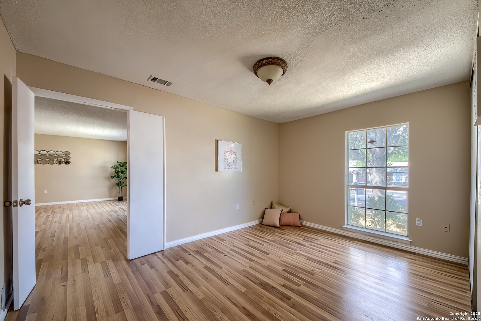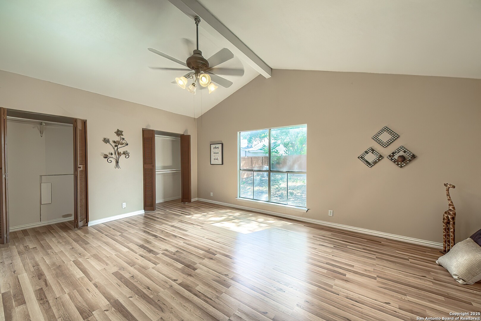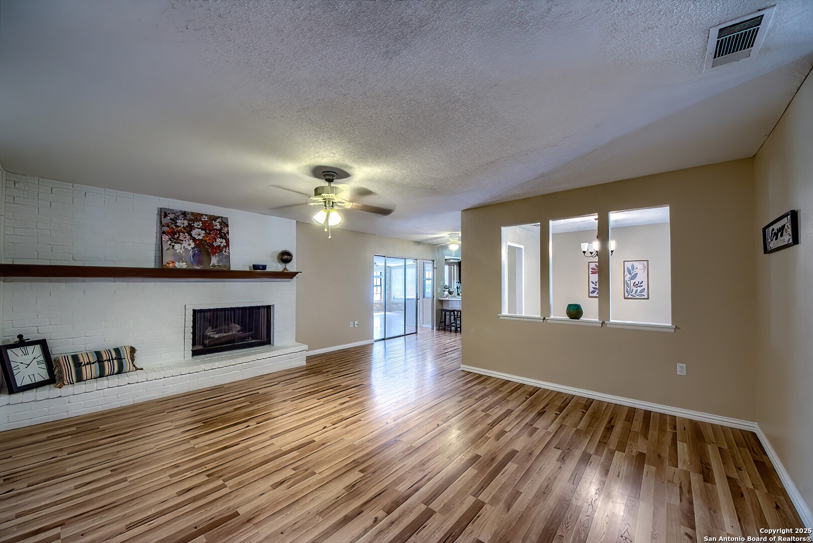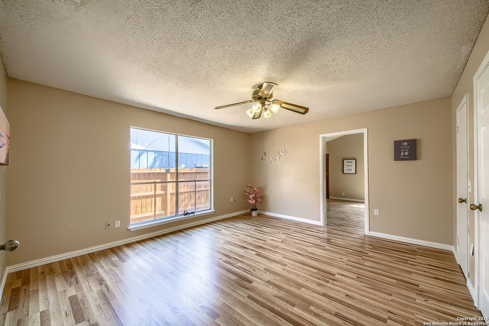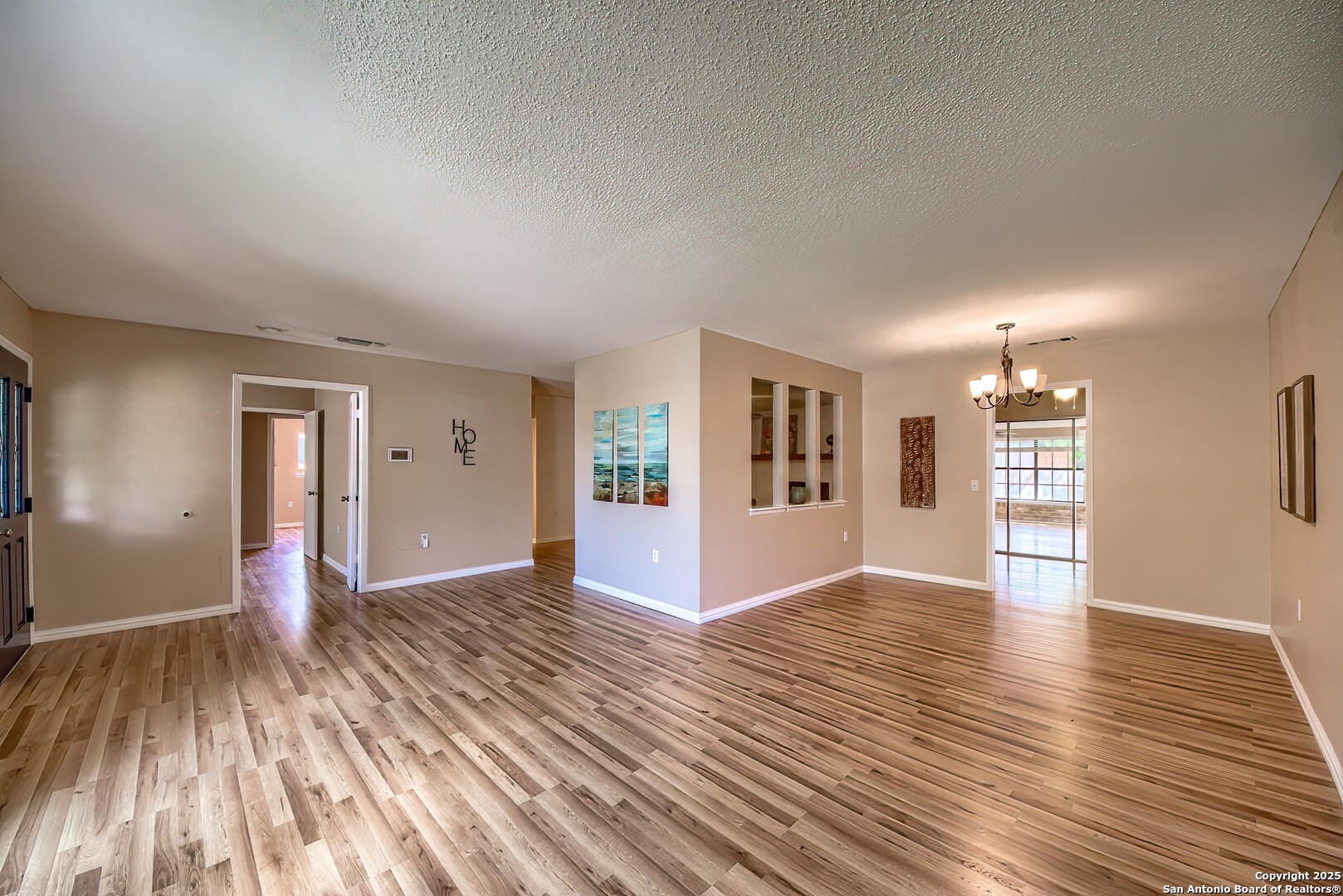 NEVER WANT FOR SPACE IN THIS AFFORDABLE SINGLE STORY BRICK RANCHER WITH NEW ROOF, FRESH PAINT, NEW LUXURY VINYL FLOORING AND A WORKSHOP! Well loved for decades by the same owners who raised their children here, this spacious single story is ready with open arms to welcome you in and turn all your possibilities into realities. Wind through the wide, tree-lined streets leading through Valley Forge and glide up to this charmer beneath mature trees and accented by smart xeriscaping and lawn. Open living is just a start to this traditional home modern comforts that offers more than you thought you could ask for at this price including a huge game room/sunroom and workshop on a slab, fully outfitted for all your projects! Step past the welcoming front porch and into the foyer to find a formal living room adjacent to a formal dining that is separate but still open to the family room and kitchen. A centerpiece, wood burning, brick fireplace with long hearth sets a cozy atmosphere in the family room that adjoins the breakfast nook. Offering original real wood cabinetry and plenty of countertop to work with, the kitchen is ready to go now or renovate to add your personal choices for upgrades. The adjacent laundry room includes cabinetry and shelving and leads into the two-car attached garage with pull-down attic access, storage cabinets and workbench. The primary suite is quite the production with one large room that hosts the adjacent ensuite bath, accessible with spacious walk-in shower with grab bars and no lip. But that's not all! Another doorway leads into the real retreat with beamed vaulted ceiling, two closets and tons of space for a third living area. Or, vice versa, use the first space as an office, exercise room or hobby room and this private enclave as your palatial bedroom. The secondary bedrooms share a guest bath in the hallway leading back to the rest of the house. Just off the family room is a giant air conditioned space to use as you will -- imagine entertaining with the outfitted bar with long counter top, wine nooks and glass shelves or work a business from this room as the owners did both over the years. Outside find a concrete walkway leading to the 18X13 workshop, on a slab, with electricity and work tables. Just add tools and get busy or turn into an office with exterior access if that is what you need! The owner added a concrete walkway from the gate to the shop for ease of use. The nice sized, level yard shaded by mature trees offers enough space for outdoor activities including gardening and playscape. Or, add a swimming pool and make this a real all-encompassing live, relax and work place you'd never have to leave! Located in an ultra-convenient, well established neighborhood -- right off I-35 at O'Connor near 1604 in NE San Antonio -- an easy commute to military bases to include RAFB, SAMMC and Fort Sam as well as all the cool things to do downtown at the Riverwalk. Shopping and restaurants are just minutes away as are the NEISD schools the home is zoned to attend. If you work from home and/or run a business from home, or if multi-generational living is what you need, this property checks every box. There is no HOA to worry about, just city regulations, so feel free to have chickens and other options usually governed by HOAs. The new architectural shingle roof with 30 year shingles will help keep your property insurance costs lower than other homes. Don't wait for another opportunity like this to come along, run and see this one and make it your own.
