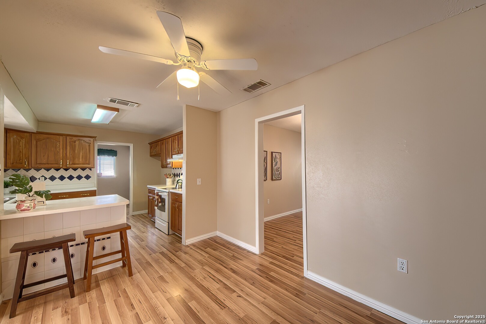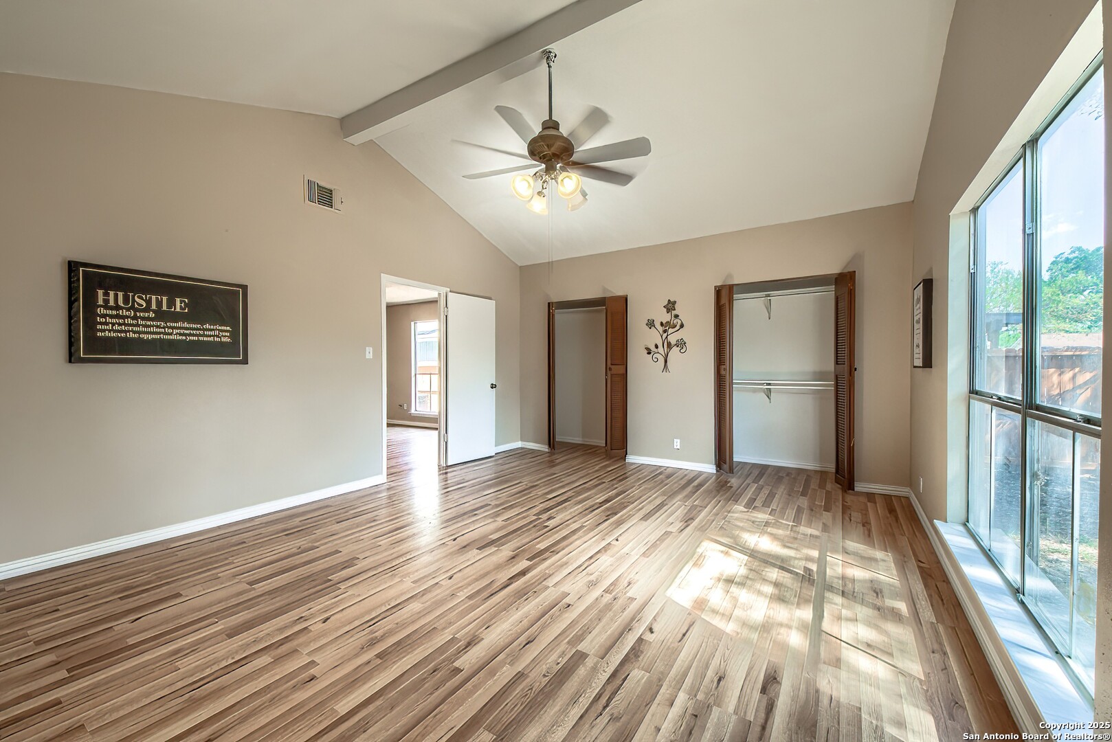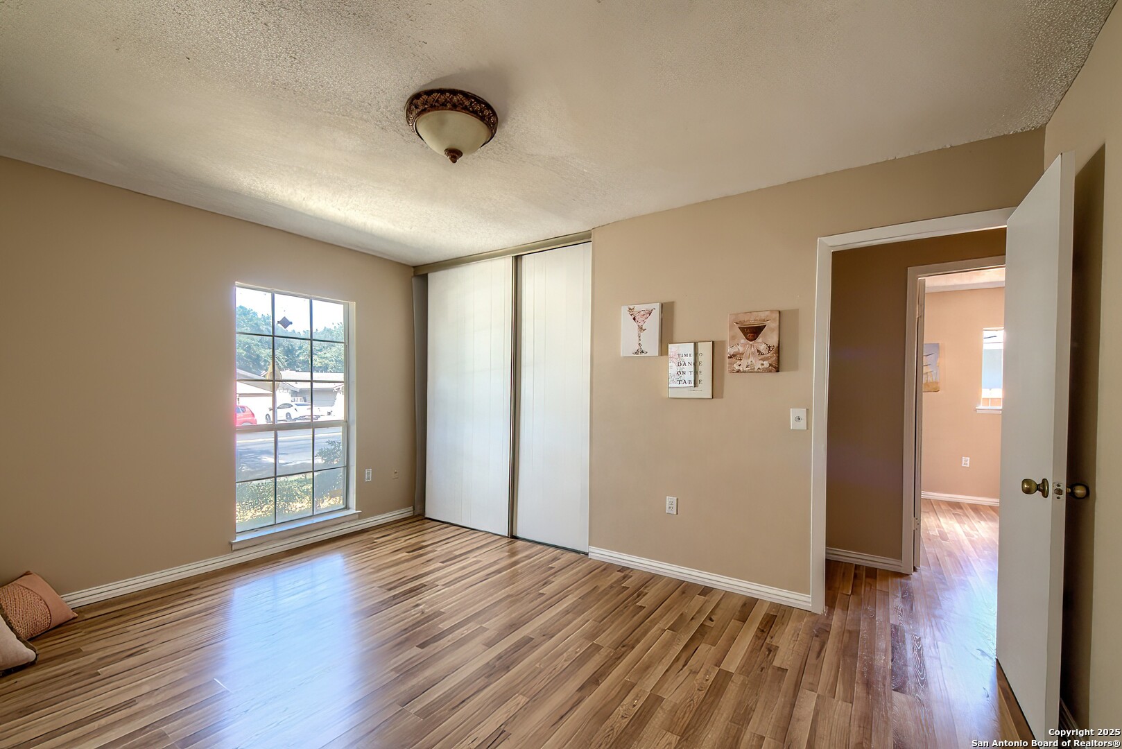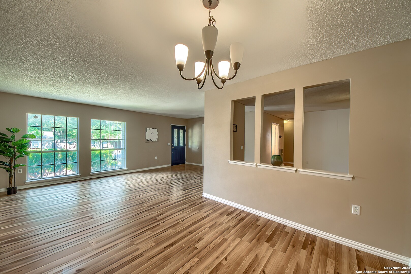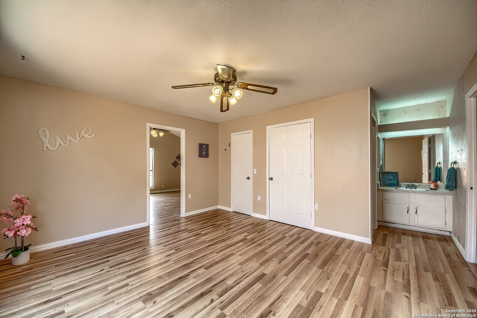 NEVER WANT FOR SPACE IN THIS AFFORDABLE SINGLE STORY BRICK RANCHER WITH NEW ROOF, FRESH PAINT, NEW LUXURY VINYL FLOORING AND A WORKSHOP! Well loved for decades by the same owners who raised their children here, this spacious single story is ready with open arms to welcome you in and turn all your possibilities into realities. Wind through the wide, tree-lined streets leading through Valley Forge and glide up to this charmer beneath mature trees and accented by smart xeriscaping and lawn. Open living is just a start to this traditional home modern comforts that offers more than you thought you could ask for at this price including a huge game room/sunroom and workshop on a slab, fully outfitted for all your projects! Step past the welcoming front porch and into the foyer to find a formal living room adjacent to a formal dining that is separate but still open to the family room and kitchen. A centerpiece, wood burning, brick fireplace with long hearth sets a cozy atmosphere in the family room that adjoins the breakfast nook. Offering original real wood cabinetry and plenty of countertop to work with, the kitchen is ready to go now or renovate to add your personal choices for upgrades. The adjacent laundry room includes cabinetry and shelving and leads into the two-car attached garage with pull-down attic access, storage cabinets and workbench. The primary suite is quite the production with one large room that hosts the adjacent ensuite bath, accessible with spacious walk-in shower with grab bars and no lip. But that's not all! Another doorway leads into the real retreat with beamed vaulted ceiling, two closets and tons of space for a third living area. Or, vice versa, use the first space as an office, exercise room or hobby room and this private enclave as your palatial bedroom. The secondary bedrooms share a guest bath in the hallway leading back to the rest of the house. Just off the family room is a giant air conditioned space to use as you will -- imagine entertaining with the outfitted bar with long counter top, wine nooks and glass shelves or work a business from this room as the owners did both over the years. Outside find a concrete walkway leading to the 18X13 workshop, on a slab, with electricity and work tables. Just add tools and get busy or turn into an office with exterior access if that is what you need! The owner added a concrete walkway from the gate to the shop for ease of use. The nice sized, level yard shaded by mature trees offers enough space for outdoor activities including gardening and playscape. Or, add a swimming pool and make this a real all-encompassing live, relax and work place you'd never have to leave! Located in an ultra-convenient, well established neighborhood -- right off I-35 at O'Connor near 1604 in NE San Antonio -- an easy commute to military bases to include RAFB, SAMMC and Fort Sam as well as all the cool things to do downtown at the Riverwalk. Shopping and restaurants are just minutes away as are the NEISD schools the home is zoned to attend. If you work from home and/or run a business from home, or if multi-generational living is what you need, this property checks every box. There is no HOA to worry about, just city regulations, so feel free to have chickens and other options usually governed by HOAs. The new architectural shingle roof with 30 year shingles will help keep your property insurance costs lower than other homes. Don't wait for another opportunity like this to come along, run and see this one and make it your own.