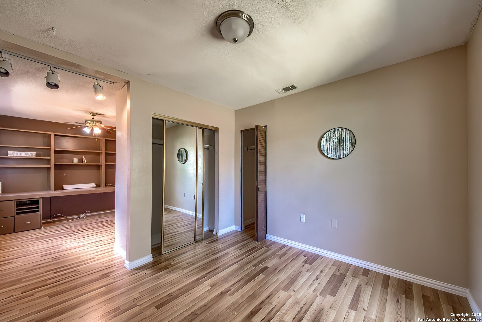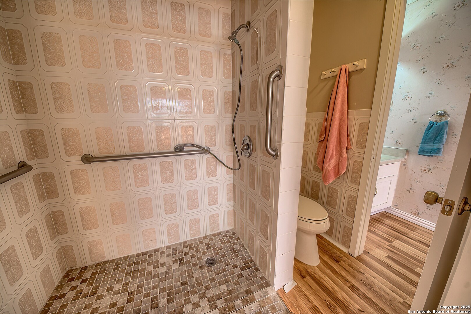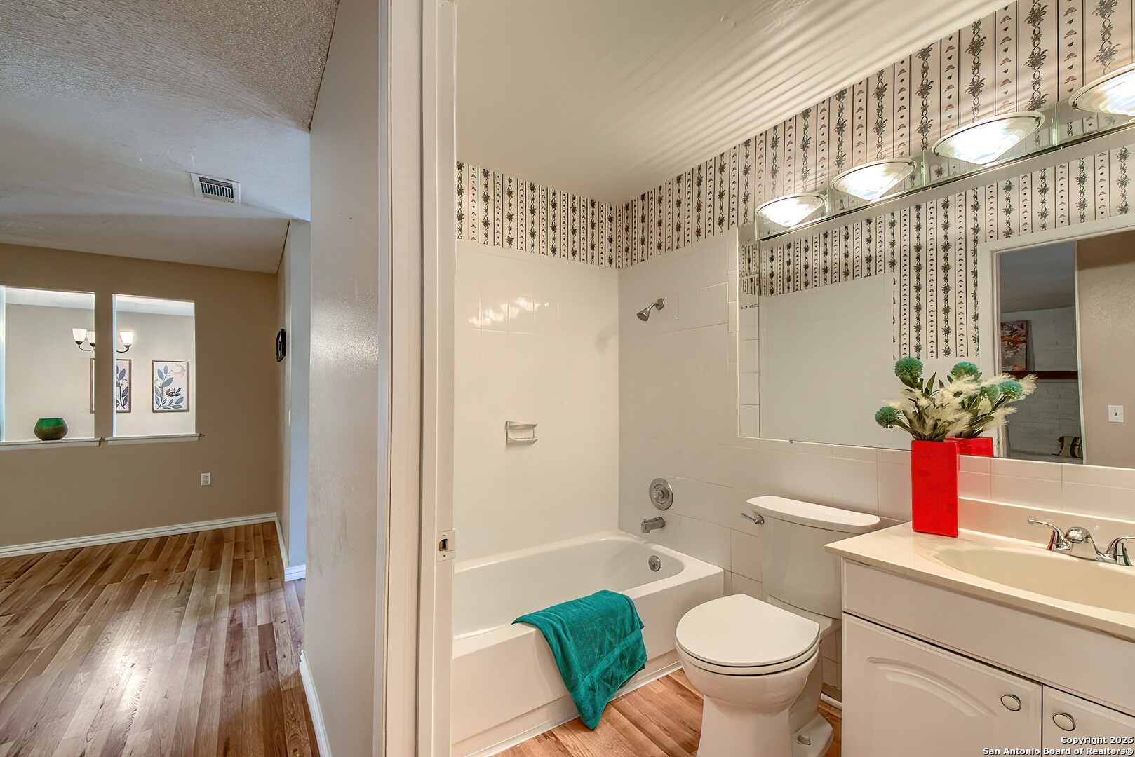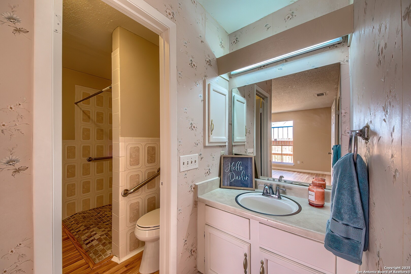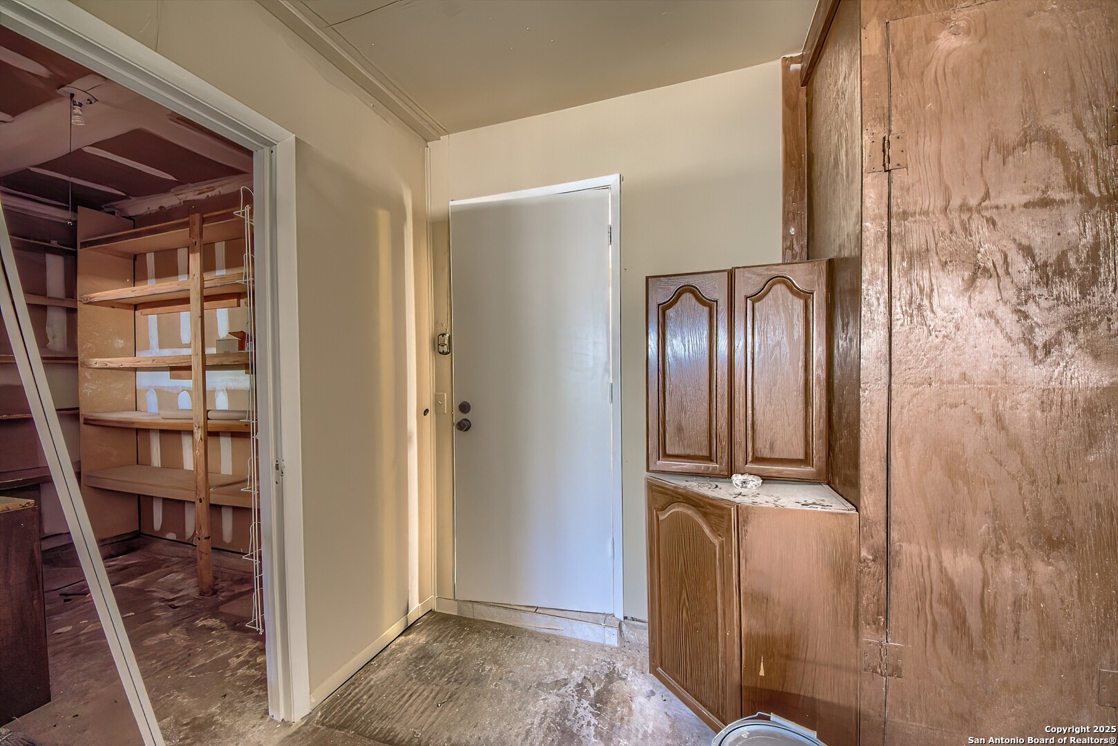 NEVER WANT FOR SPACE IN THIS AFFORDABLE SINGLE STORY BRICK RANCHER WITH NEW ROOF, FRESH PAINT, NEW LUXURY VINYL FLOORING AND A WORKSHOP! Well loved for decades by the same owners who raised their children here, this spacious single story is ready with open arms to welcome you in and turn all your possibilities into realities. Wind through the wide, tree-lined streets leading through Valley Forge and glide up to this charmer beneath mature trees and accented by smart xeriscaping and lawn. Open living is just a start to this traditional home modern comforts that offers more than you thought you could ask for at this price including a huge game room/sunroom and workshop on a slab, fully outfitted for all your projects! Step past the welcoming front porch and into the foyer to find a formal living room adjacent to a formal dining that is separate but still open to the family room and kitchen. A centerpiece, wood burning, brick fireplace with long hearth sets a cozy atmosphere in the family room that adjoins the breakfast nook. Offering original real wood cabinetry and plenty of countertop to work with, the kitchen is ready to go now or renovate to add your personal choices for upgrades. The adjacent laundry room includes cabinetry and shelving and leads into the two-car attached garage with pull-down attic access, storage cabinets and workbench. The primary suite is quite the production with one large room that hosts the adjacent ensuite bath, accessible with spacious walk-in shower with grab bars and no lip. But that's not all! Another doorway leads into the real retreat with beamed vaulted ceiling, two closets and tons of space for a third living area. Or, vice versa, use the first space as an office, exercise room or hobby room and this private enclave as your palatial bedroom. The secondary bedrooms share a guest bath in the hallway leading back to the rest of the house. Just off the family room is a giant air conditioned space to use as you will -- imagine entertaining with the outfitted bar with long counter top, wine nooks and glass shelves or work a business from this room as the owners did both over the years. Outside find a concrete walkway leading to the 18X13 workshop, on a slab, with electricity and work tables. Just add tools and get busy or turn into an office with exterior access if that is what you need! The owner added a concrete walkway from the gate to the shop for ease of use. The nice sized, level yard shaded by mature trees offers enough space for outdoor activities including gardening and playscape. Or, add a swimming pool and make this a real all-encompassing live, relax and work place you'd never have to leave! Located in an ultra-convenient, well established neighborhood -- right off I-35 at O'Connor near 1604 in NE San Antonio -- an easy commute to military bases to include RAFB, SAMMC and Fort Sam as well as all the cool things to do downtown at the Riverwalk. Shopping and restaurants are just minutes away as are the NEISD schools the home is zoned to attend. If you work from home and/or run a business from home, or if multi-generational living is what you need, this property checks every box. There is no HOA to worry about, just city regulations, so feel free to have chickens and other options usually governed by HOAs. The new architectural shingle roof with 30 year shingles will help keep your property insurance costs lower than other homes. Don't wait for another opportunity like this to come along, run and see this one and make it your own.