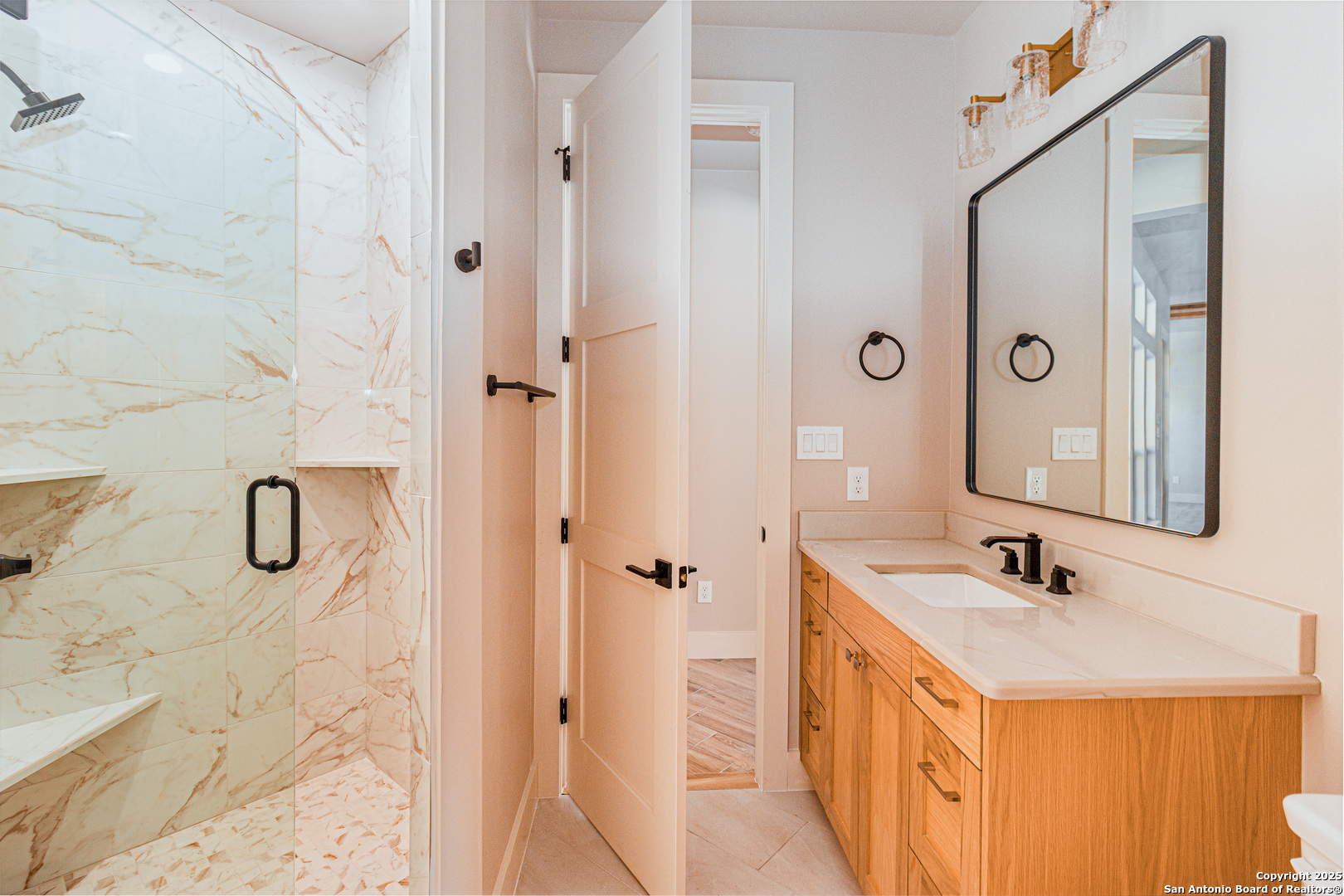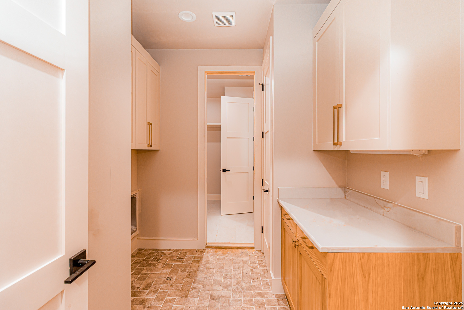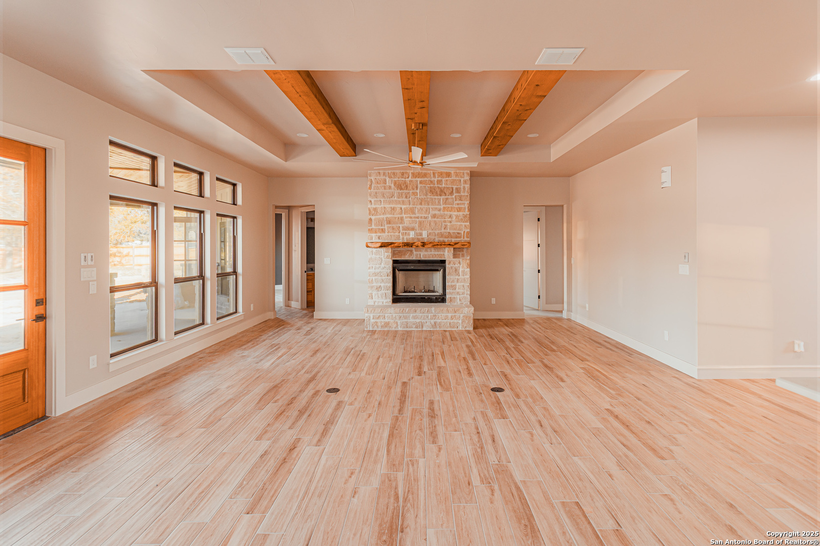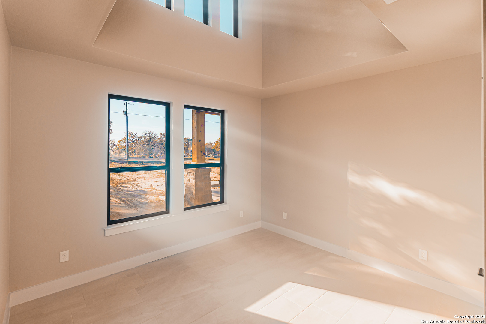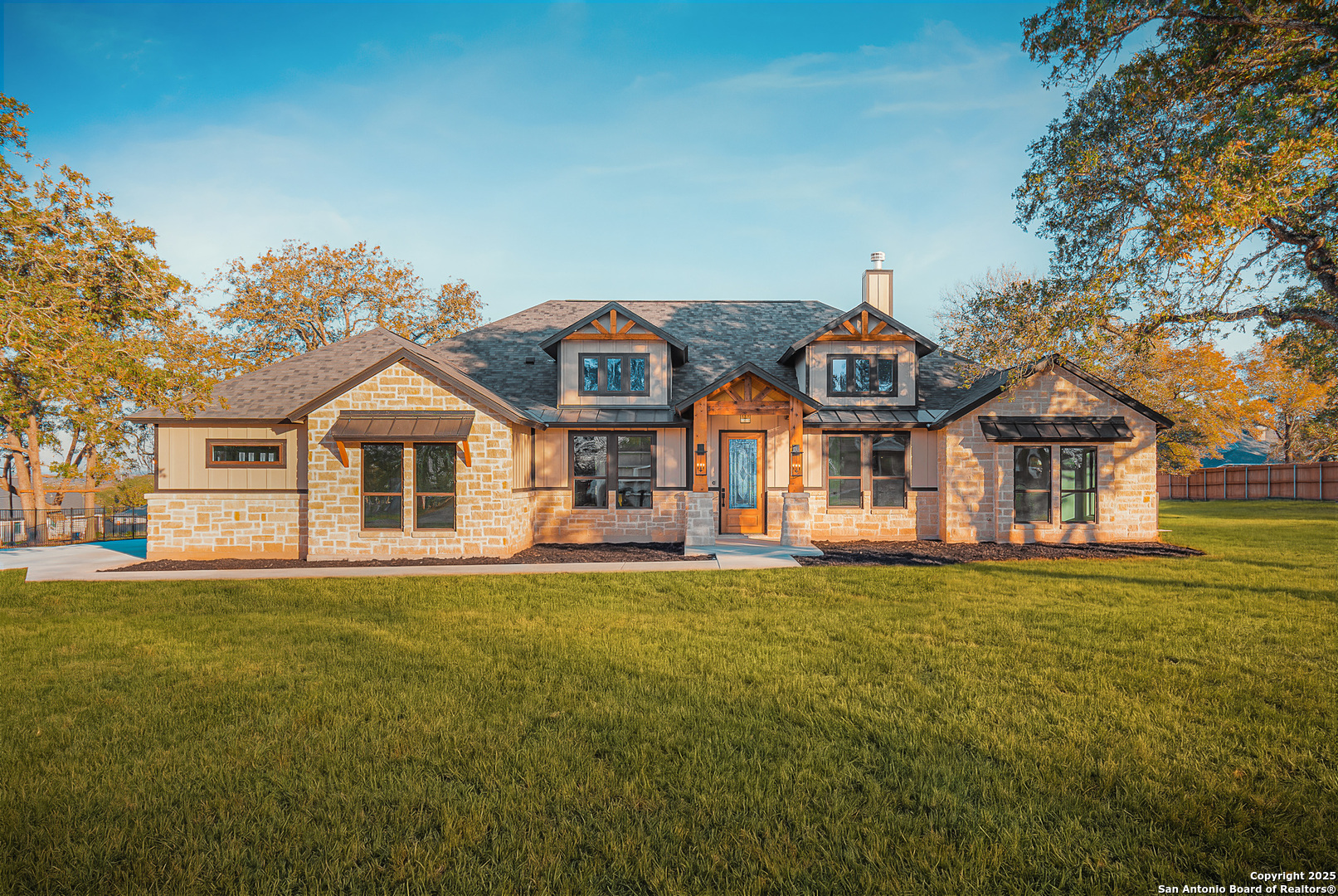 Stunning. Spectacular. Sublime. This Newly Crafted Home w/3-car garage is situated on 1 Acre of countryside, with Exceptional Long-Distance views all the way to downtown San Antonio! Tucked into wooded surroundings, less than 10 minutes to the amenities of La Vernia, and within 35 minutes to SA. The Entry Foyer beckons you inside, where you will discover chic stylish finishes throughout a thoughtful layout. The main living expanse encompasses the generous living room, dining room, and kitchen, with an airy and open ambiance. Elevated ceilings are graced by rustic wood beams, and elegant lighting fixtures offer designer flair. Dreamy tones illuminate the Gourmet Kitchen, showcasing sleek European-Style Cabinetry w/Champagne Bronze Hardware, Quartzite Counters, and state-of-the-art stainless steel KitchenAid Appliances! Don't miss the Fabulous Pantry w/fun brick-tile floor, extra cabinetry & counter space, plus ample shelving. Journey into the stately 2nd Living / Study / Office (which could even be a 5th bedroom) and find handsome charcoal walls, abundant windows, and a vaulted shiplap-lined ceiling. The Fashionable Master Retreat features transom windows, a soaring stepped ceiling, and luxurious bath w/freestanding tub + spacious dual-head shower! One of the master closets connects conveniently to the Laundry Room. The secondary bedrooms will not disappoint, with the front bedroom featuring a high ceiling w/bountiful natural light. The hall bath offers double vanities, and the 3rd full bath features a walk-in shower. Tile & wood-tile flooring throughout for easy care (no carpet!), 1-2-10 year Bonded Warranty, Fiber Optic Internet available, custom Pecan Mantel at fireplace, Framed Mirrors, Hand-Troweled Wall Texture, and So Much More!