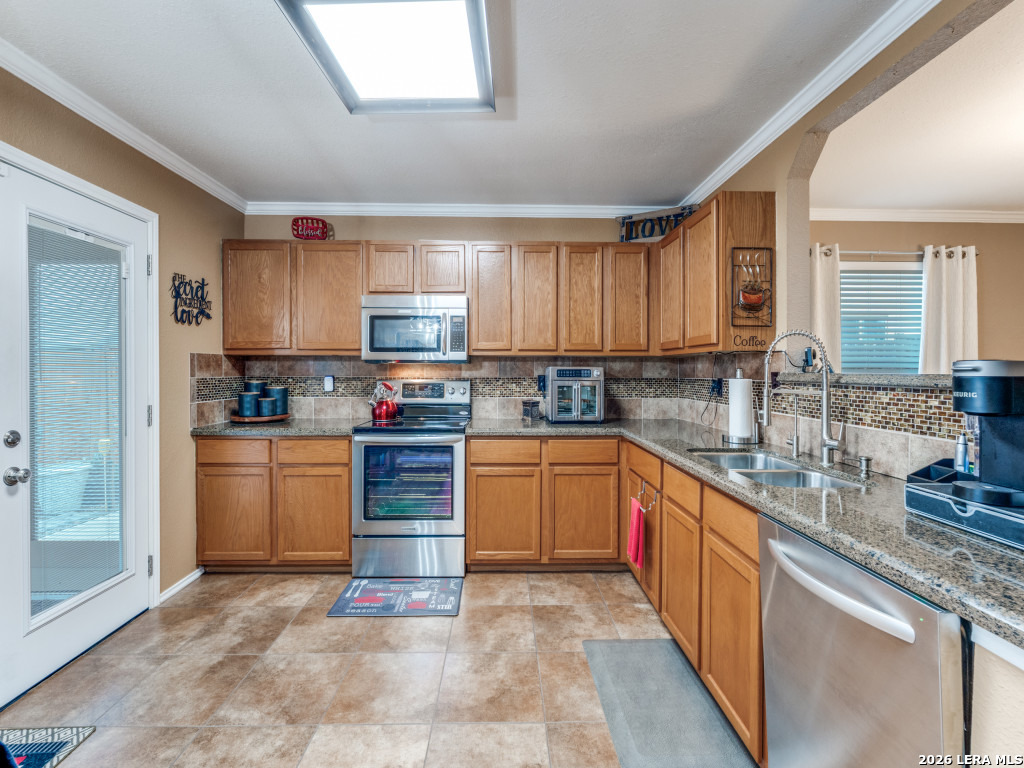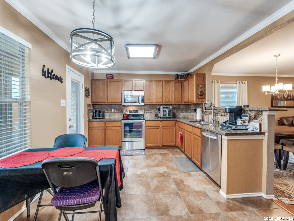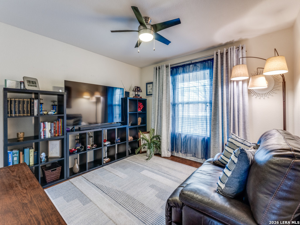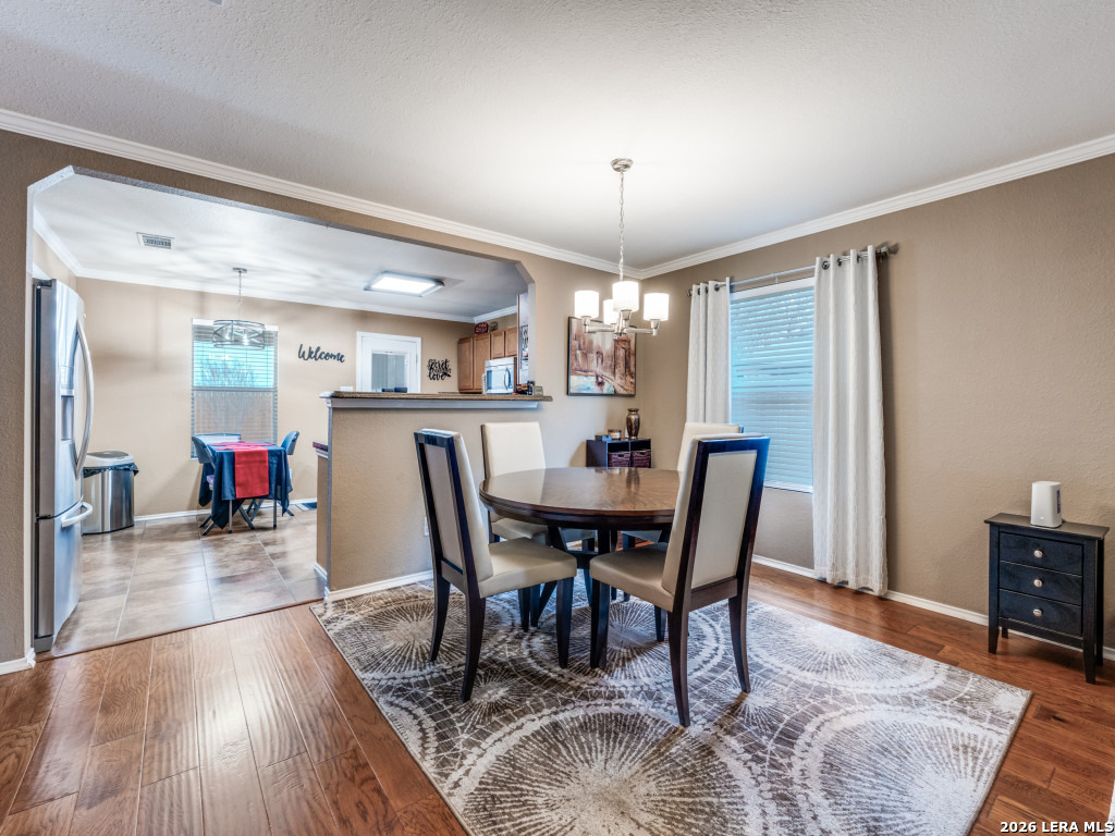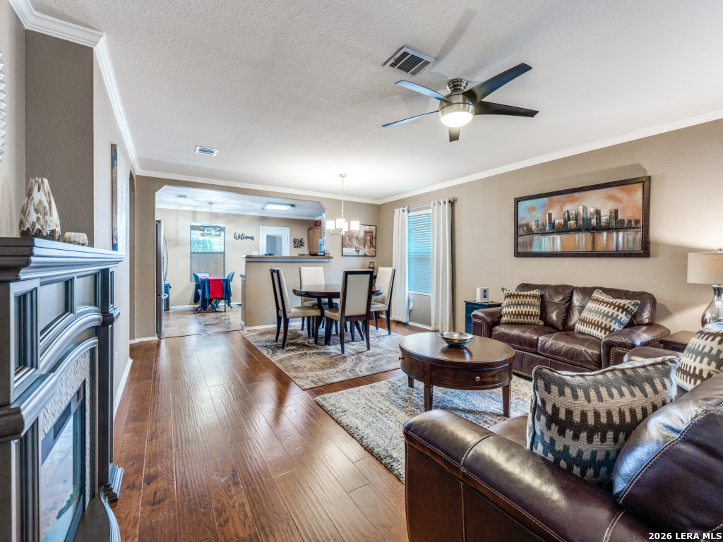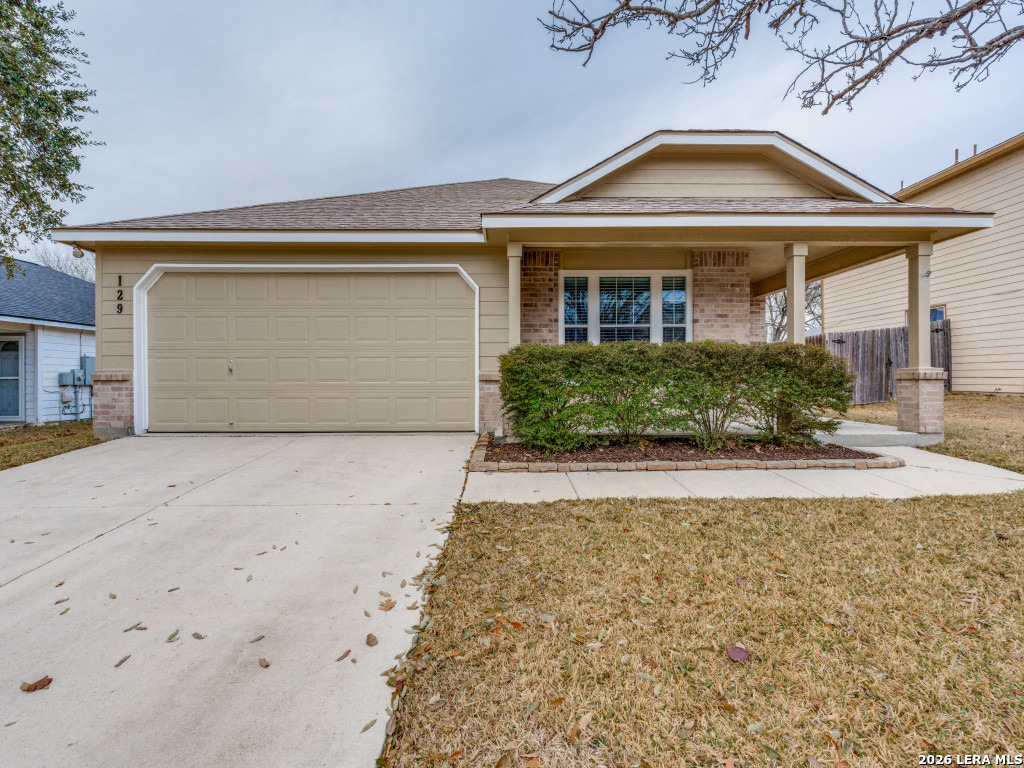 Impeccably maintained one-story brick home backing to a private greenbelt. A charming front porch welcomes you into refined interior featuring engineered wood floors, crown molding, 2-inch faux wood blinds, and updated lighting. The oversized family room opens seamlessly to the dining and kitchen with recently installed appliances, abundant cabinets and counter space, and adjacent laundry. The split primary suite offers raised ceilings and a bath with dual vanities, garden tub, and separate shower. The enclosed sunroom provides year-round enjoyment of the backyard, complete with raised beds, recently stained privacy fence, and tranquil greenbelt views. Major improvements include exterior paint (2025), HVAC (2021), and roof (2018). Added comforts include a sprinkler system, water softener, reverse osmosis, and Ecobee thermostat. Located in sought-after Schertz-Cibolo ISD. Stainless refrigerator and mock fireplace convey.