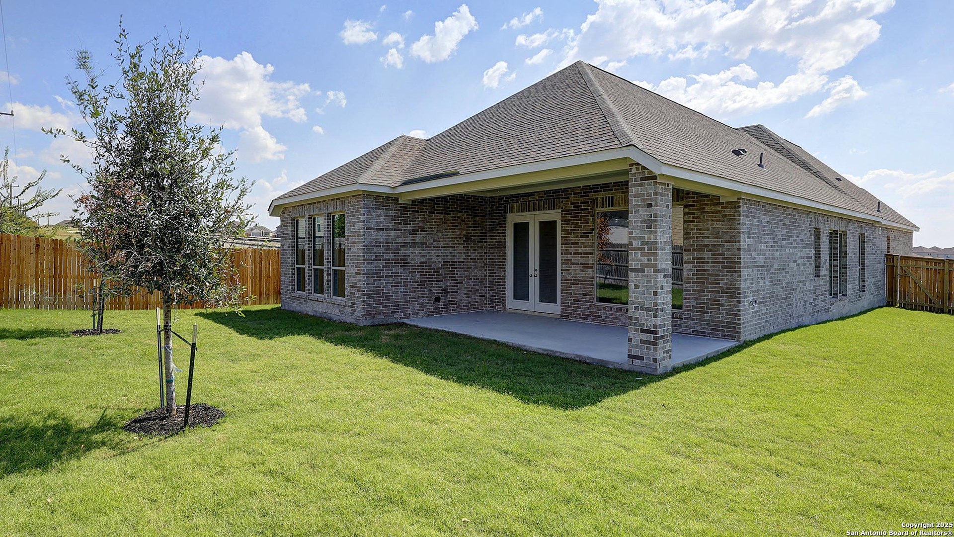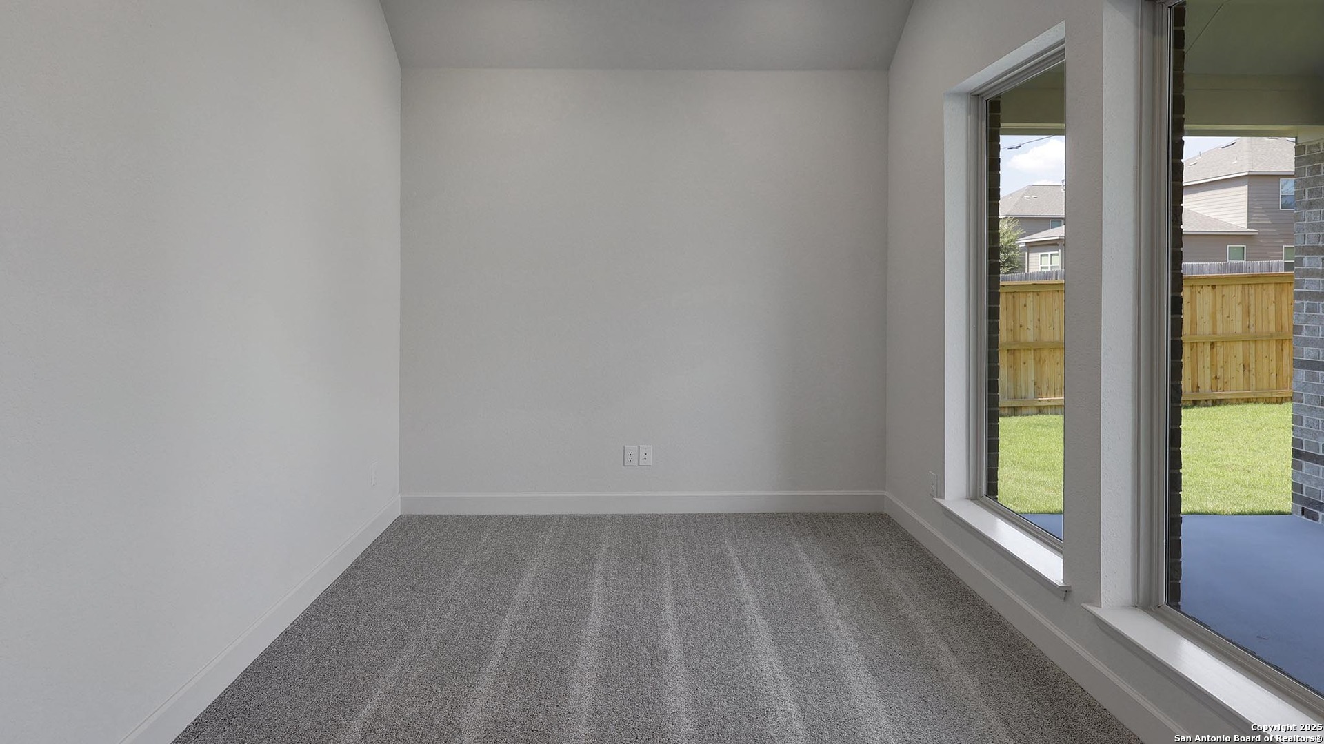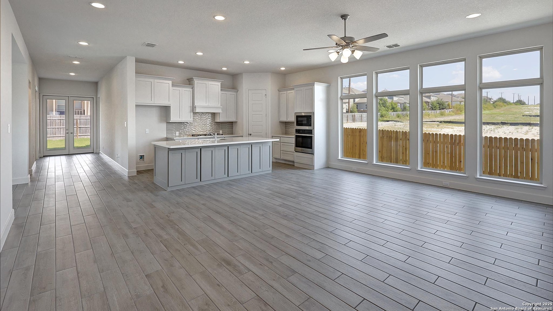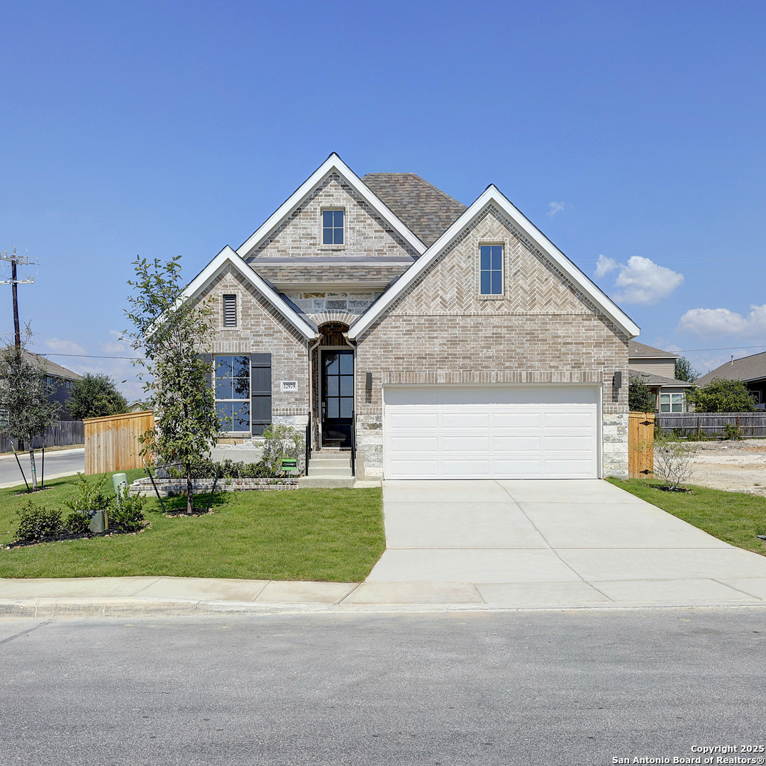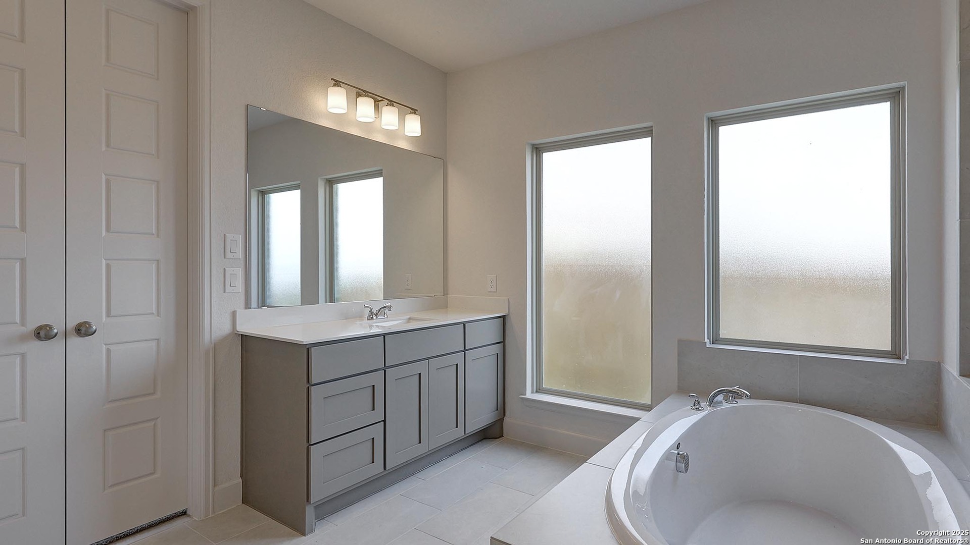 Entry leads to open family room with wall of windows. Kitchen features corner walk-in pantry and generous island with built-in seating space. Dining area set just across from kitchen. Primary suite includes bedroom with wall of windows. Double doors lead to primary bath with dual vanities, corner garden tub, separate glass-enclosed shower and walk-in closet. Home office with French doors set at back entrance. Secondary bedrooms feature walk-in closets. Extended covered backyard patio. Two-car garage.
