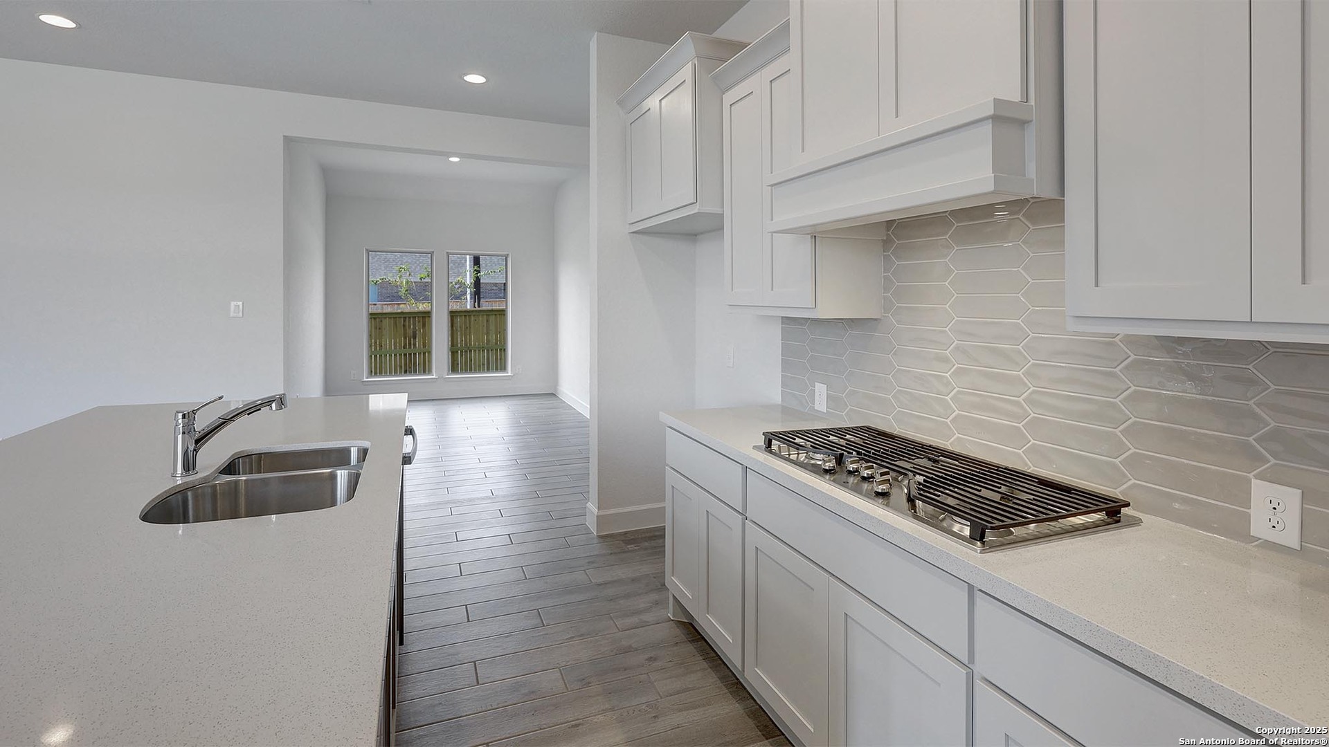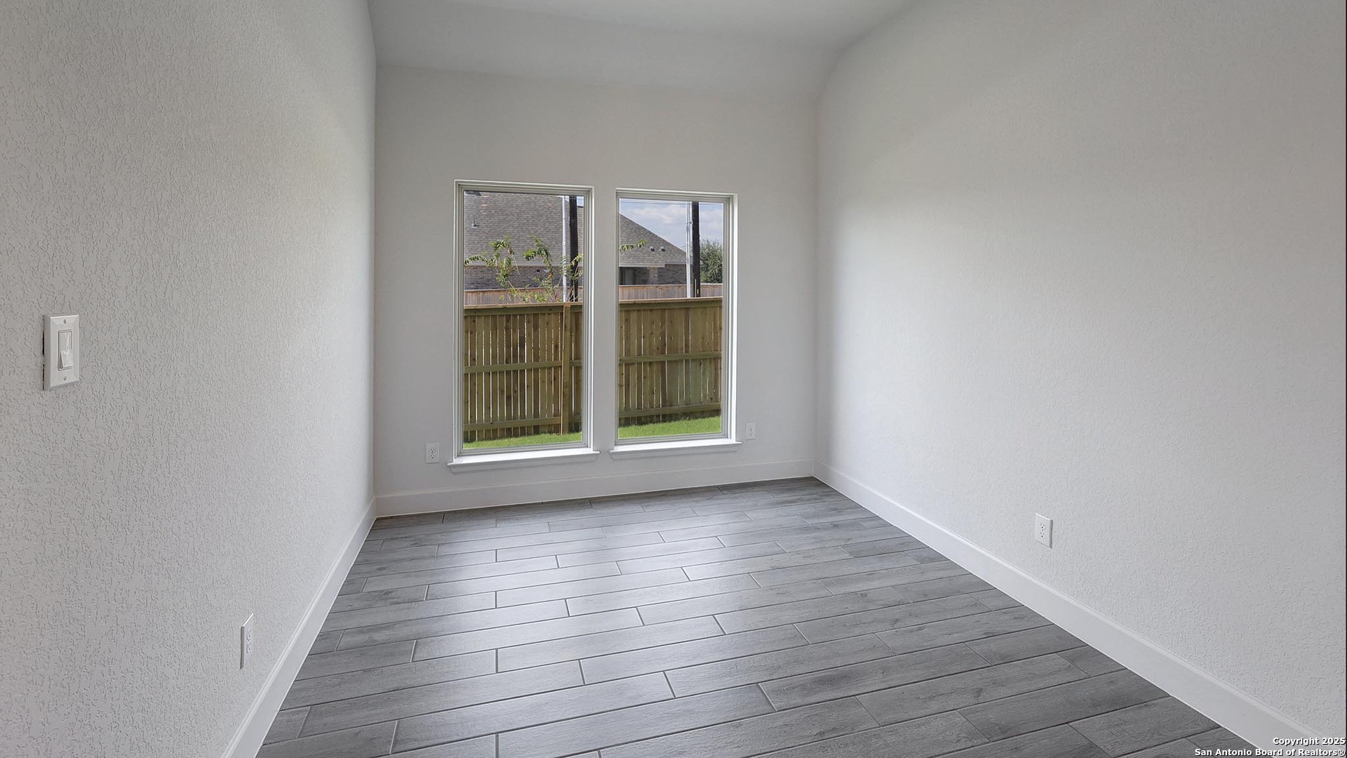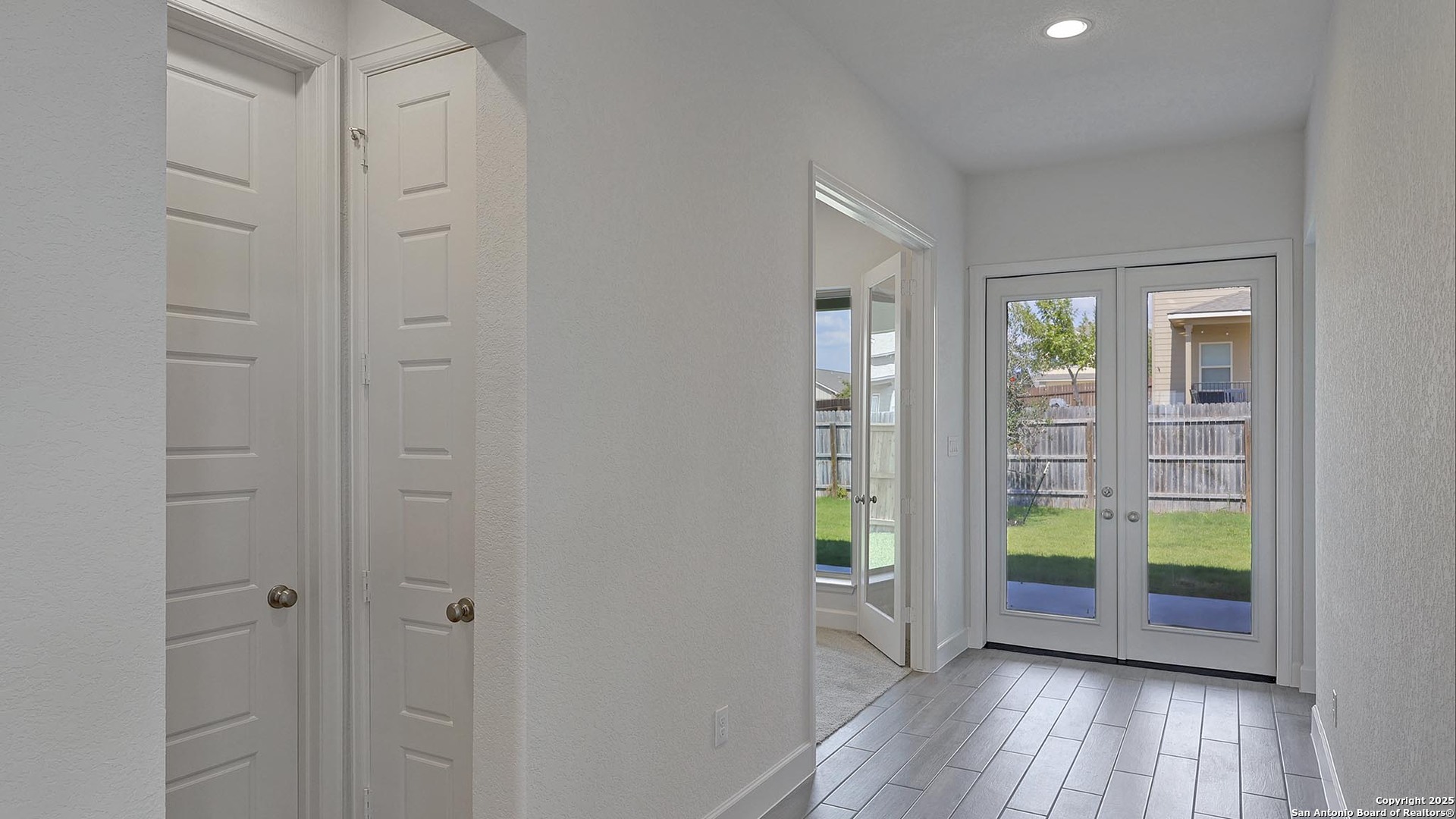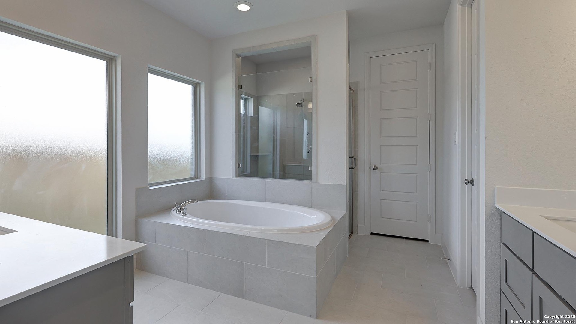 Entry leads to open family room with wall of windows. Kitchen features corner walk-in pantry and generous island with built-in seating space. Dining area set just across from kitchen. Primary suite includes bedroom with wall of windows. Double doors lead to primary bath with dual vanities, corner garden tub, separate glass-enclosed shower and walk-in closet. Home office with French doors set at back entrance. Secondary bedrooms feature walk-in closets. Extended covered backyard patio. Two-car garage.