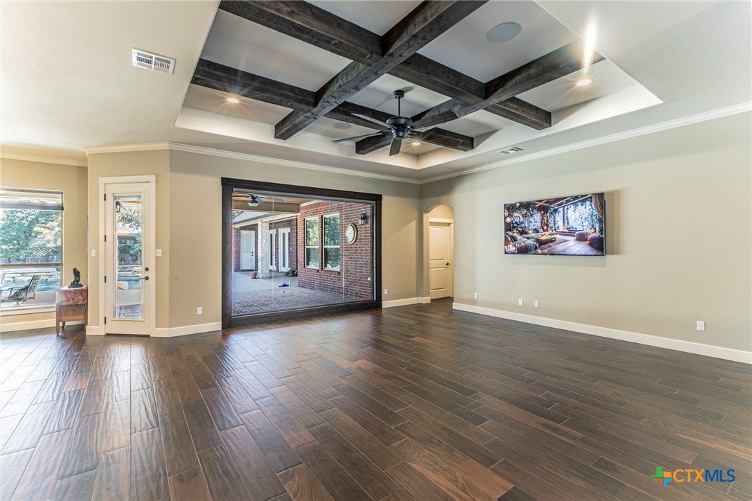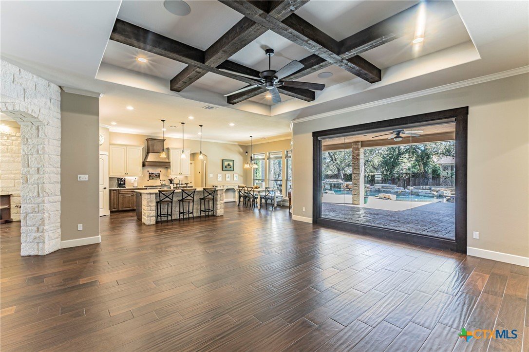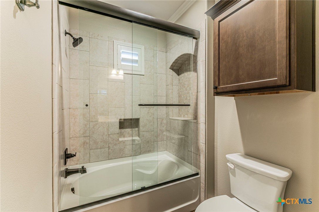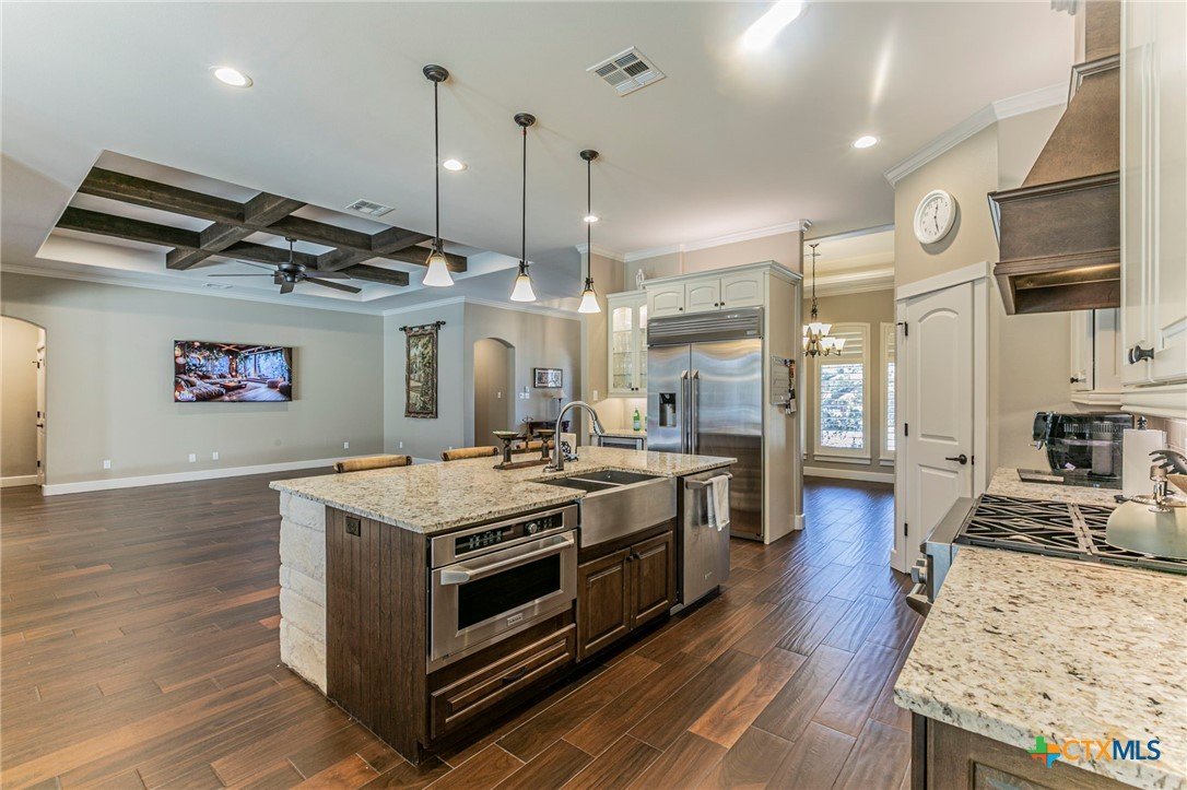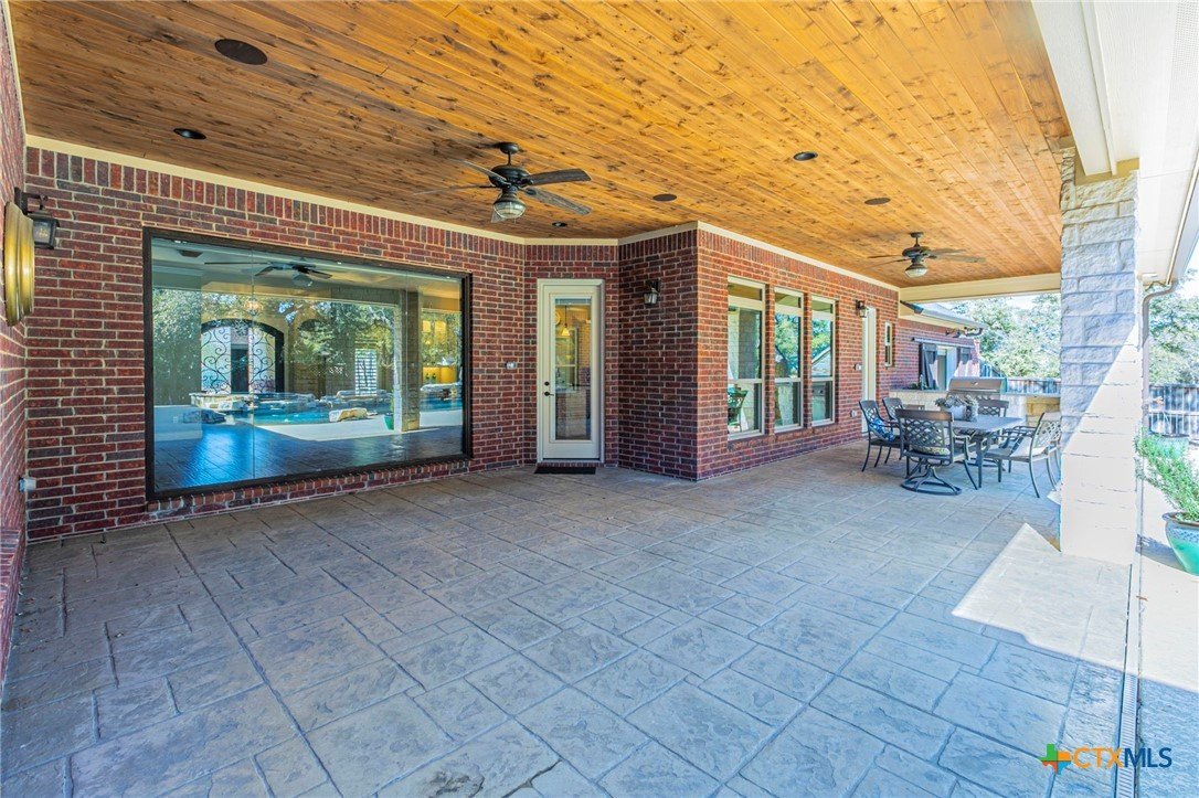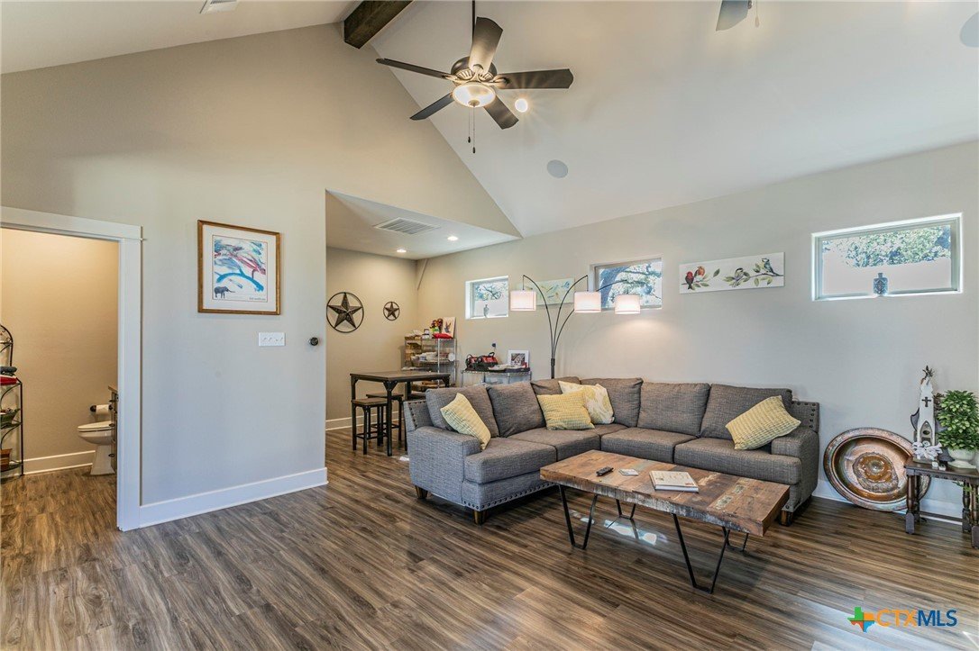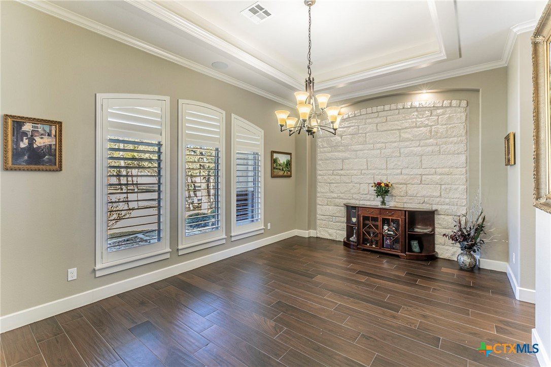 This showstopper checks all the boxes! Enjoy the beautiful open floor plan with picture windows, wood look tile, and view of stellar pool, waterfall, and spa. Gas range, wine frig, KraftMaid custom cabinets, deep sink, and high end appliances make up the open kitchen with spacious breakfast area. The formal dining room/flex room will accommodate large furniture. Front windows have plantation shutters and the back picture windows have remote controlled shades for your convenience. The spacious bedrooms include an ensuite bedroom with shower/soaking tub unit. The master offers exterior French doors, windows wired for electric shades, two vanities, and rain shower. Need a workout? Space for a home gym off of the 3 car garage with its own roll up door to the back yard. Need a guest house or home office? The 500+sf guest house with kitchen and bath is separated by a breezeway. And there's more ... generator, full gutters, surround sound in main house, guest house and outdoors, pool automation system controlled by phone app, and 2024 roof. Beautiful gated subdivision near Lake Belton.