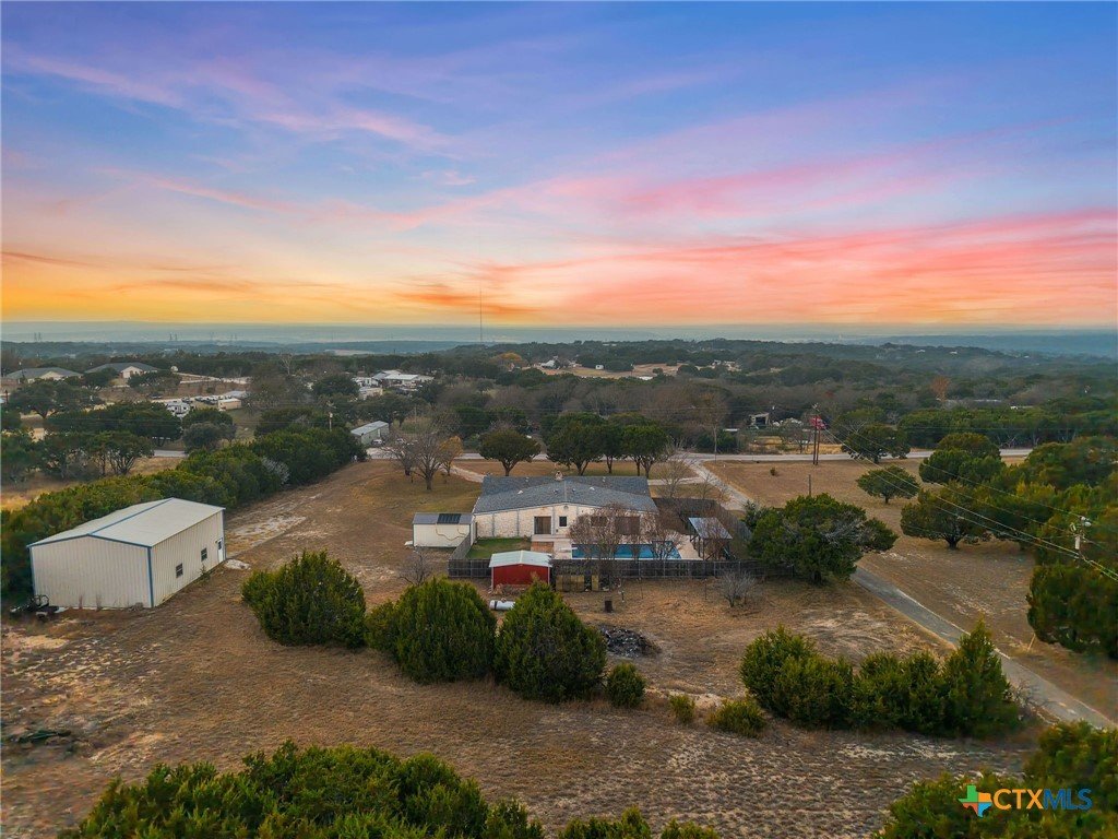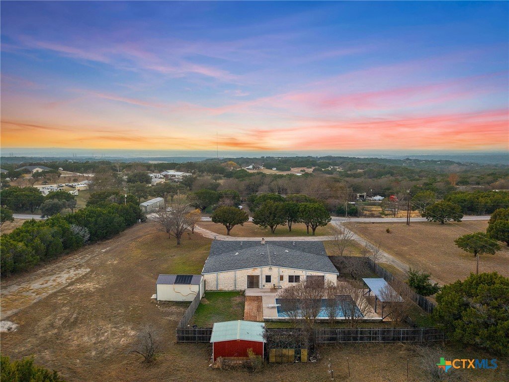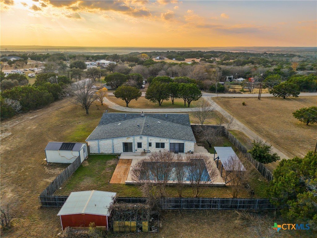 Welcome to this exceptional Texas retreat nestled on 2.037 acres right outside of Copperas Cove! This spacious 3,443 sqft home offers 3 bedrooms and 2.5 bathrooms with no carpet throughout, providing comfort and easy maintenance. The expansive primary suite is a true sanctuary, featuring beautiful wood beams, a generous sitting area, multiple closets and a luxurious en-suite with double vanities and walk in shower. The home is designed for both entertaining and everyday living with a large living room, generous dining area and a spacious flex room ideal for a game room, or additional living space. Outdoors, enjoy your private oasis with an in-ground pool with a diving board and brand-new liner, plus a shaded poolside lounging area perfect for relaxing. The property also includes a 1200 sqft workshop with electricity and an automatic garage door opener, perfect for hobbies, storage, or business use, along with additional storage sheds for tools and equipment. Take in the peaceful setting and beautiful Texas sunsets, offering space, privacy, and incredible amenities. This one-of-a-kind property offers the best of country living with room to enjoy it all.