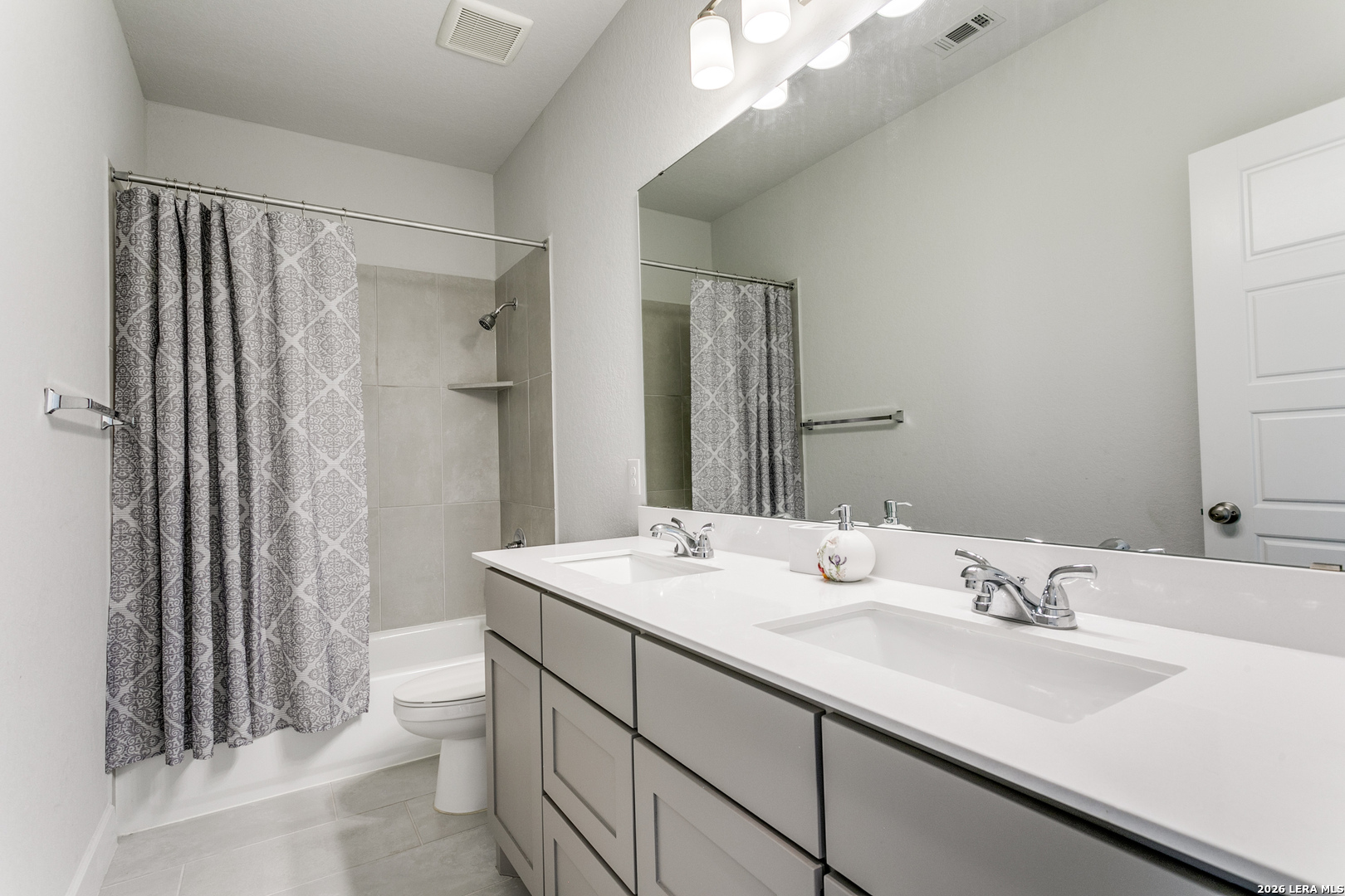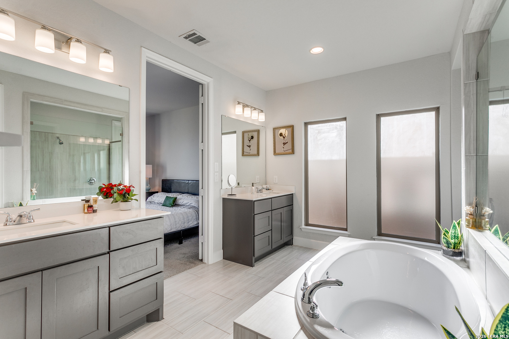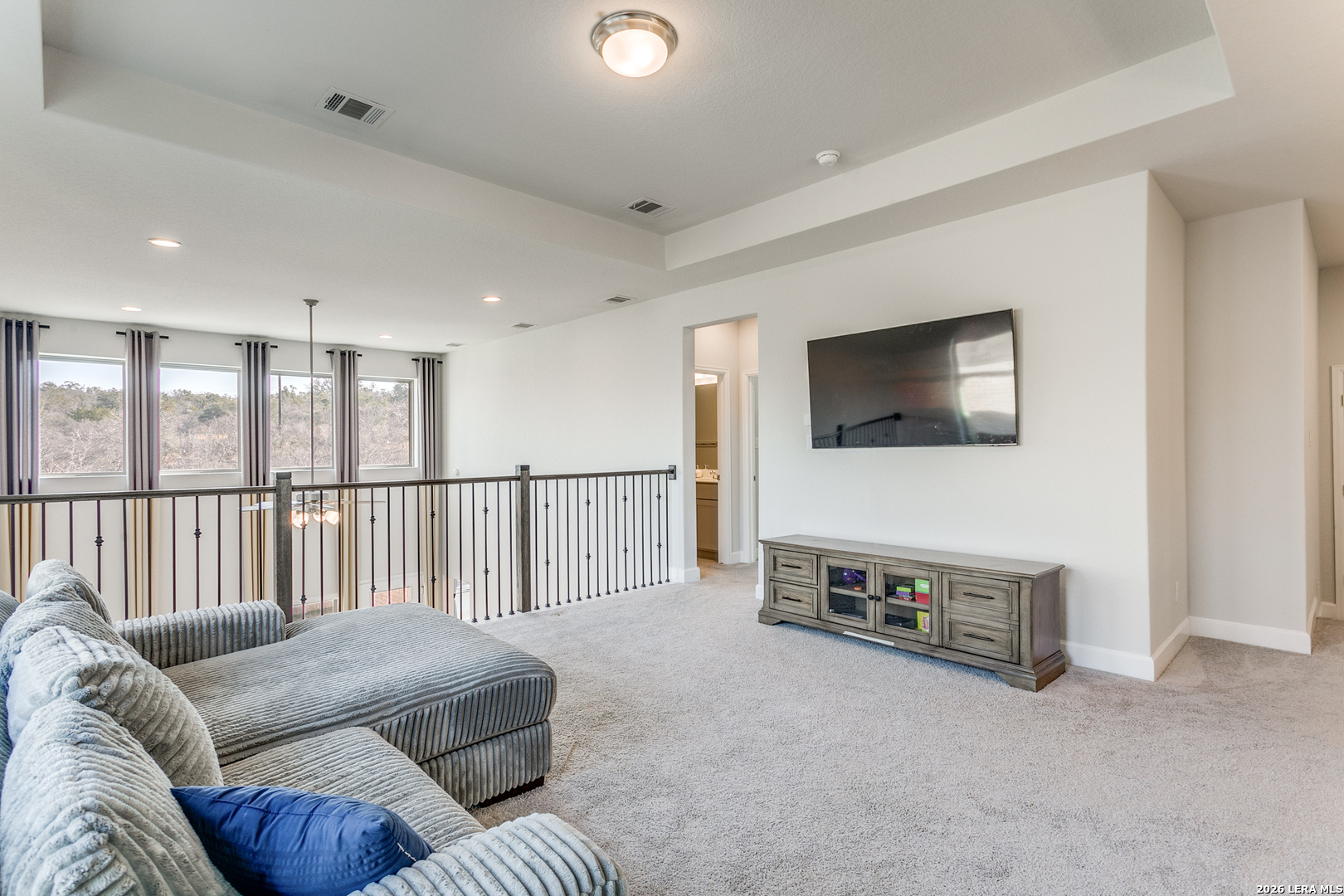 Stunning 2 story Perry Home in Arcadia Ridge, only 2 years old, offering 4 bedrooms plus a private office and an ideal layout for both everyday living and entertaining. Two bedrooms are located downstairs, including the spacious primary suite with a large soaking tub, separate shower, and dual vanities. The open floor plan is filled with incredible natural light, highlighted by soaring double ceilings and extra windows. The dream kitchen features a large island, built in appliances, and gas cooking, all overlooking the main living and dining areas. Upstairs you will find two additional bedrooms, a full bath, and a generous playroom or second living space. Situated at the entrance of a cul-de-sac, this greenbelt lot offers added privacy with minimal traffic. Enjoy the large, covered patio and peaceful outdoor setting. Built by Perry Homes, one of the most sought-after builders in the subdivision, known for quality construction and elevated design. Quick commute to shopping, restaurants and Lackland AFB.