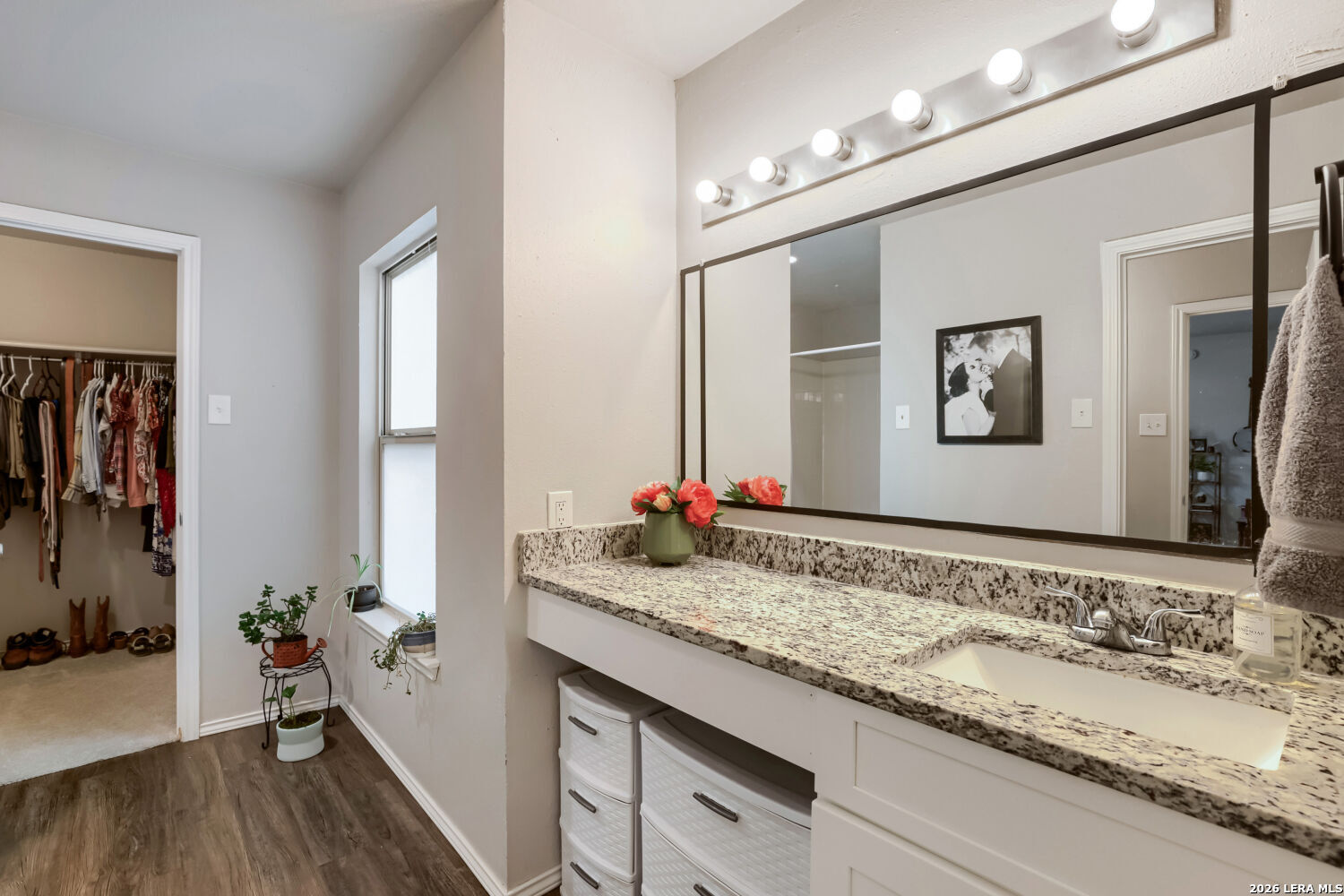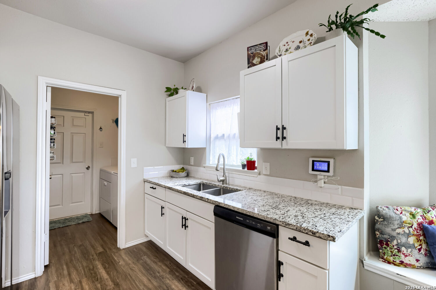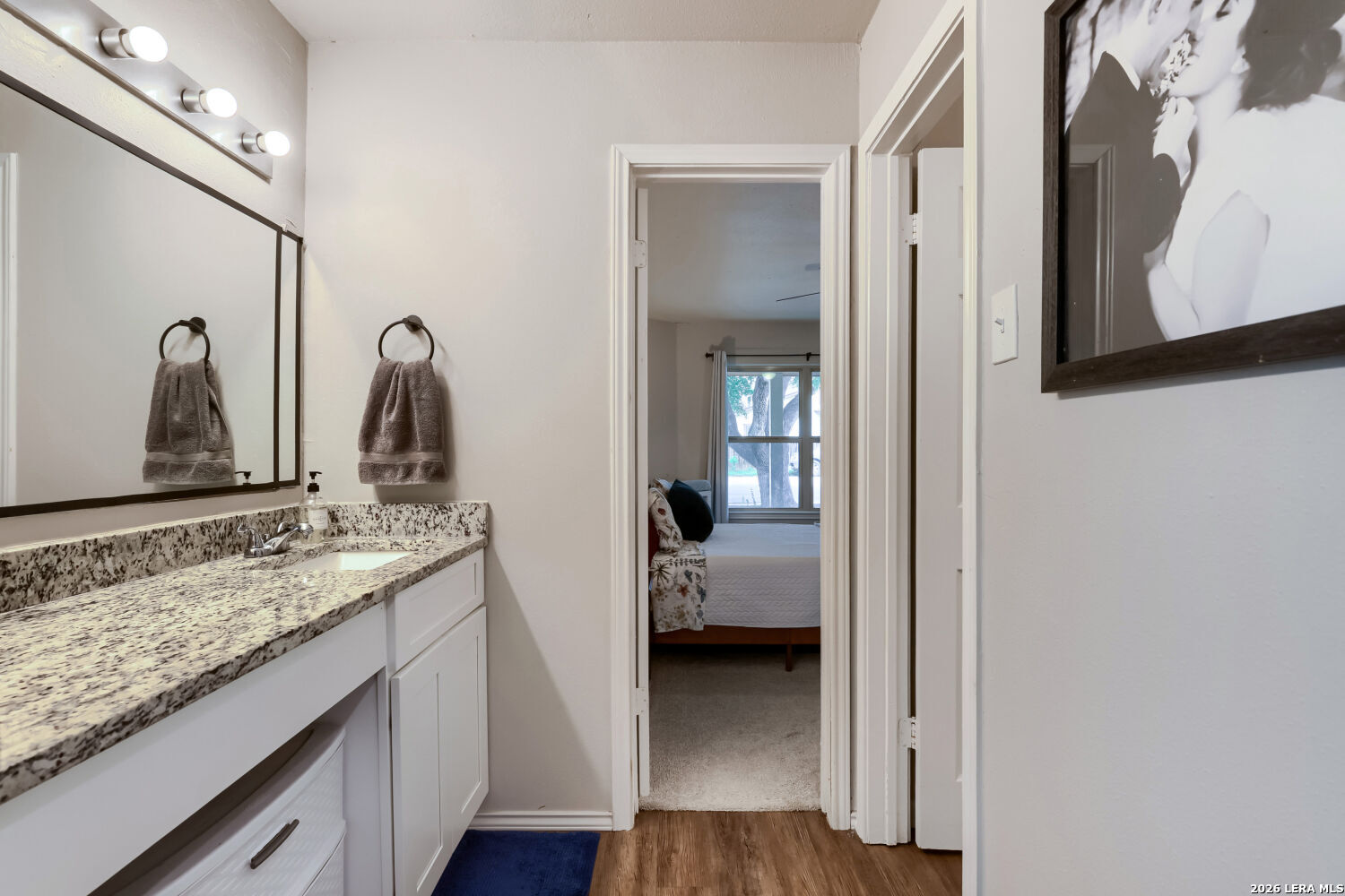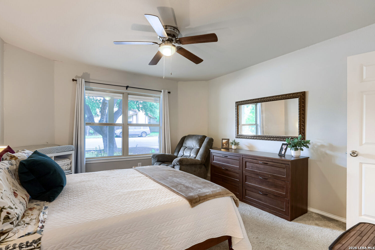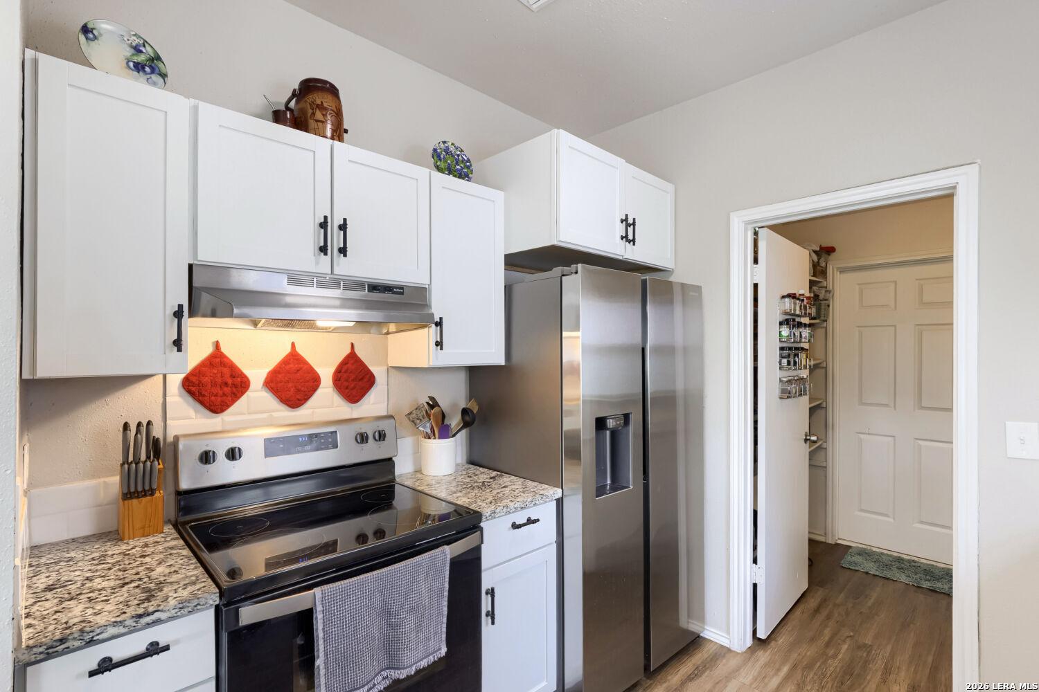 Discover comfort, convenience, and modern updates at 13043 Feather Ridge, a charming San Antonio home located right next door to a beautiful city park with no back neighbors. This move in ready property features a primary bedroom on the main level, a woodburning fireplace, and stylish luxury vinyl plank flooring. The functional galley kitchen is designed for efficiency and style, offering granite countertops, newer cabinetry, stainless steel appliances, and a classic subway tile backsplash. A large utility room/pantry provides exceptional storage space rarely found at this price point. Additional highlights include a large closet under the stairs, digital thermostat, some updated plumbing, warranty on the roof and foundation, and a 2 year old water heater for added peace of mind. The home also features a 2 car garage and a spacious covered patio, perfect for outdoor dining, entertaining, or relaxing in the shade. The backyard is set up for both fun and function with a sandbox, thornless blackberry bushes, and an already producing vegetable and flower garden. The front yard is beautifully landscaped with drought tolerant established perennials for easy upkeep and curb appeal. With direct access to the city park, this home offers a lifestyle of convenience and outdoor enjoyment while still being close to IH35, Sams Club, Ikea, restaurants, and a beautiful library.
