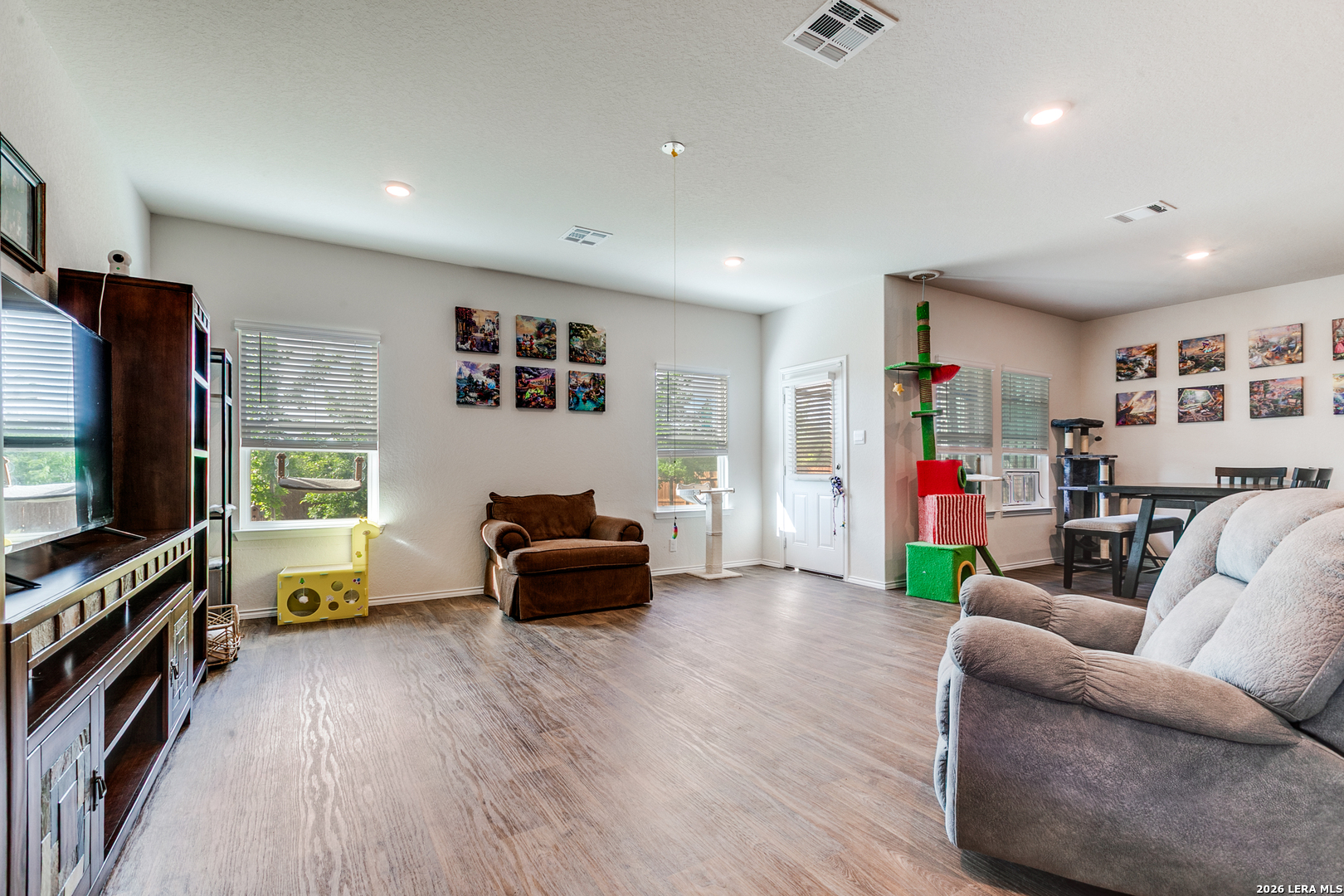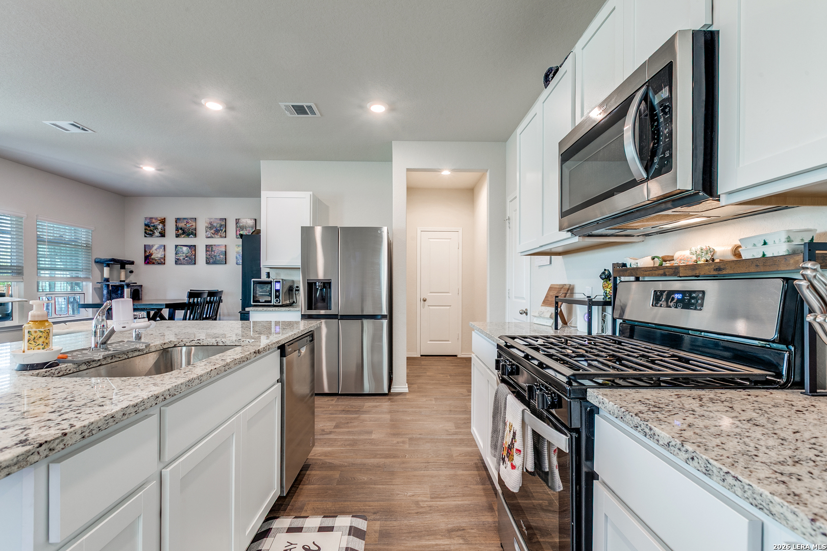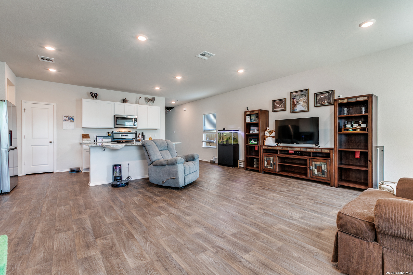 Open House: April 18 & 19, from 2PM to 5PM. Spacious two-story home with 4 bedrooms, 2.5 baths, and a 2-car garage. The open-concept layout features a gourmet kitchen with granite countertops, stainless steel appliances, a large island, and corner pantry, all overlooking the dining area and family room. A powder room is conveniently located downstairs. Upstairs includes a versatile game room, private primary suite with ensuite bath, all secondary bedrooms, a full bathroom, and utility room. Enjoy covered patios (per plan) at the front and back. This home sits right behind a community fishing pond with a trail accessible straight from the backyard-there's even a gate in the fence for easy access. Whoever buys this house... some kid is going to have the best summer ever! Additional features include vinyl flooring in main and wet areas, granite in all bathrooms, full yard landscaping with irrigation, and a smart home package to control lights, thermostat, and locks from your phone.