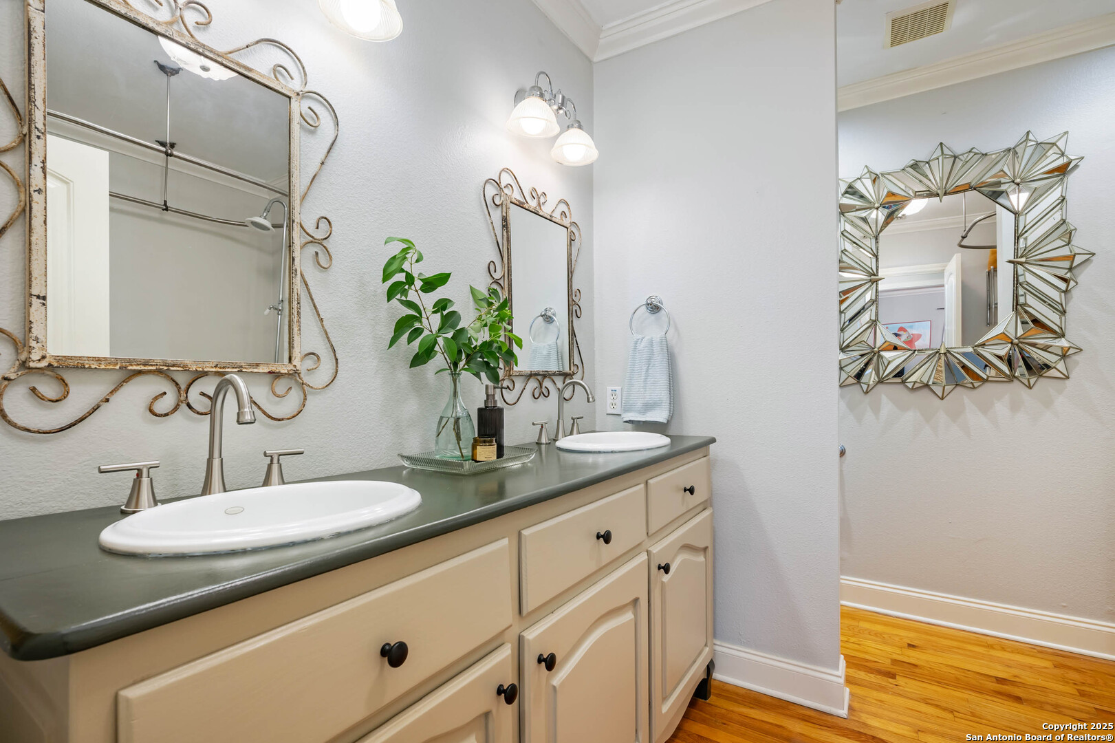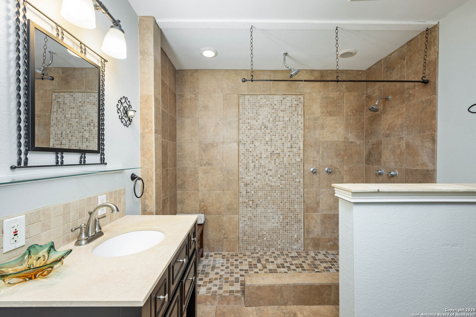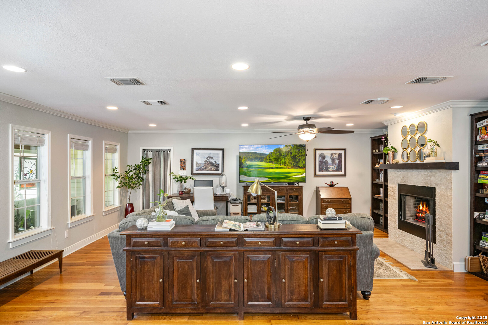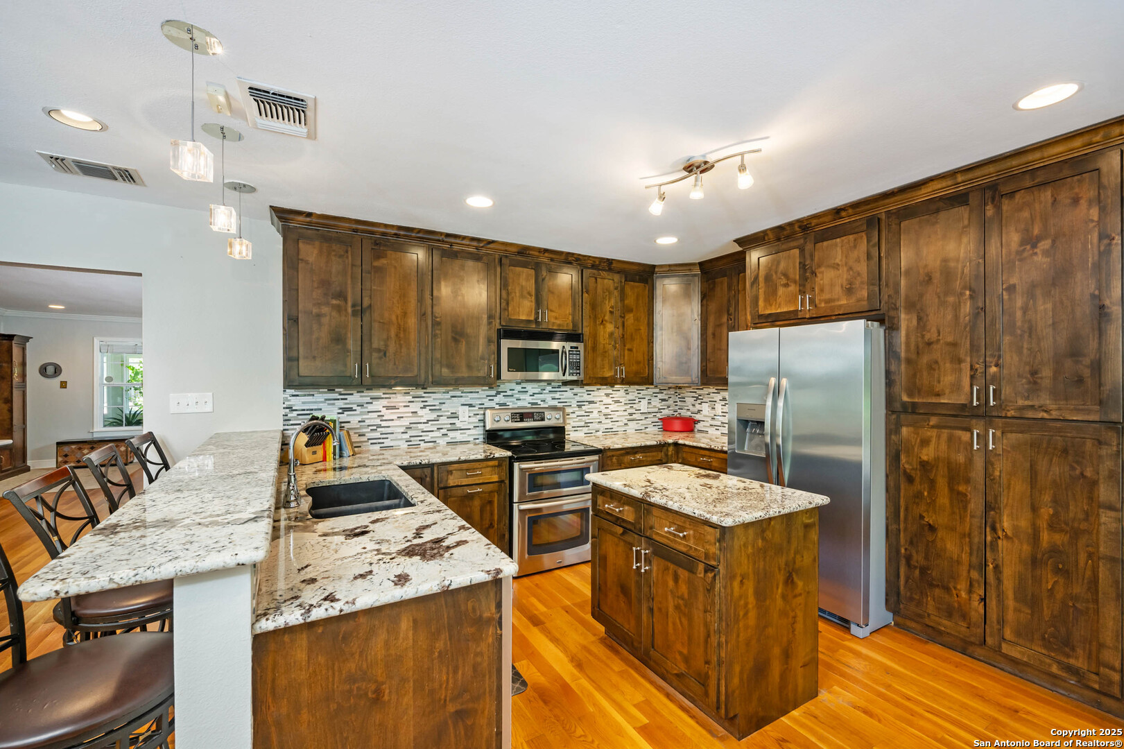 ***ASSUMABLE VA LOAN 2.78 % with $319,000 balance to qualified VA buyers*** Nestled in the highly desirable Terrell Hills neighborhood, this stunning single-story home offers 4 bedrooms and 3 bathrooms on a generous 1/3-acre lot. An enclosed front porch welcomes you into the home, providing a charming entrance. The large entry foyer opens into the living room, which features beautiful wood flooring and a cozy fireplace, creating a warm and inviting atmosphere. The open dining room is perfectly positioned next to the kitchen, with easy access to the back patio for seamless indoor-outdoor living. The kitchen is a chef's dream, with abundant cabinetry, granite countertops, stainless steel appliances, an island for extra prep space and storage, and a breakfast bar for casual dining. The kitchen's many windows offer views into the expansive backyard, allowing natural light to fill the space. The private primary bedroom suite provides a peaceful retreat with a double vanity, tub/shower combo, and a spacious walk-in closet. Nicely sized secondary bedrooms offer comfort and flexibility, with guest bathrooms conveniently located nearby. Step outside to the oversized covered deck, built in hot tub / spa ideal for entertaining or relaxing, which leads to a level backyard with lush greenery. A garden shed offers additional storage space for tools and gardening supplies. This home is ideally located with easy access to Hwy 281 and I-410, just minutes from the airport, the San Antonio Zoo, local shopping, and exceptional dining options.