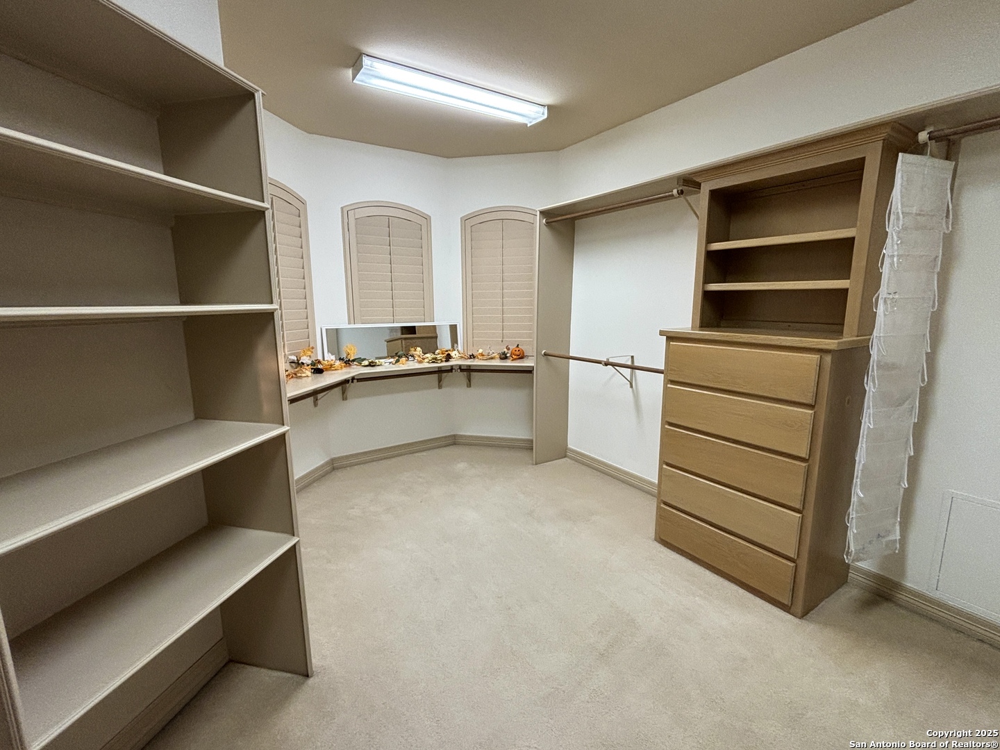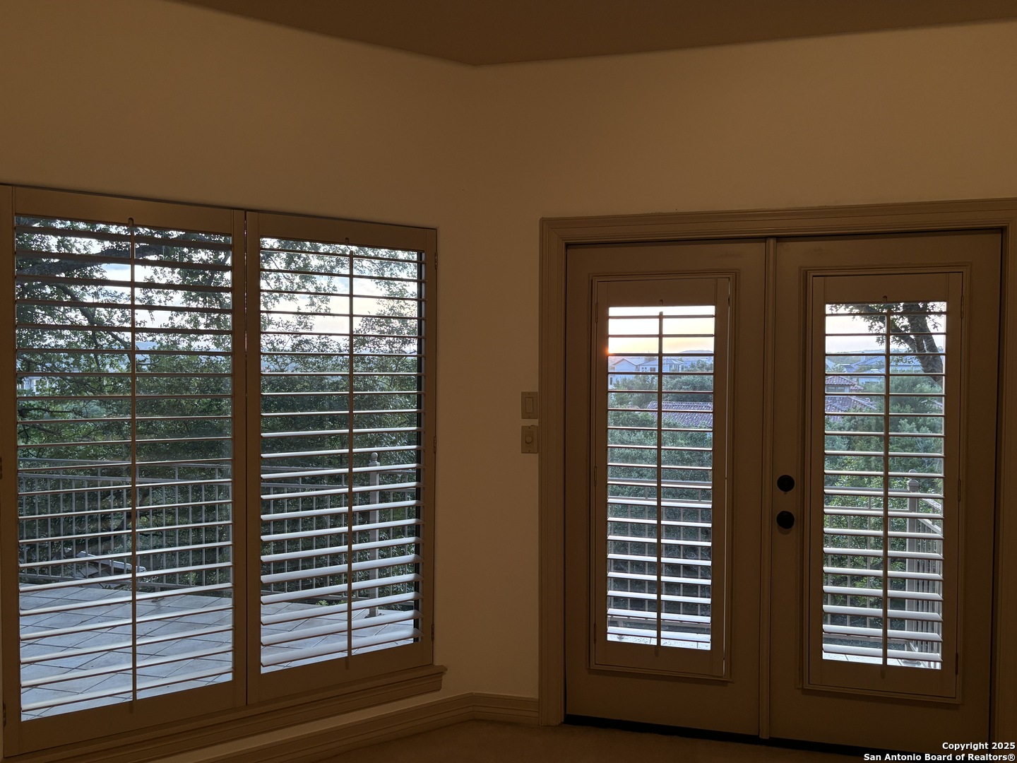 A true standout in the Gardens at the Dominion! This impressive home offers nearly 3,200 sq ft of beautifully designed living space, featuring 3 spacious bedrooms and 3.5 baths. You'll love the flexibility of having two luxurious primary suites-one upstairs, one down-each with private access to its own balcony or patio, perfect for enjoying peaceful mornings or evening breezes. The heart of the home is a stunning island kitchen complete with granite countertops, painted oak cabinetry, and a layout that's both functional and stylish. Custom inlaid flooring, elegant plantation shutters, and an abundance of large windows flood the home with natural light, creating a warm and inviting atmosphere throughout. Step outside to a generously sized patio backing up to a serene greenbelt-ideal for entertaining or simply soaking in the beautiful westerly views. Surrounded by lush landscaping, this home offers privacy, charm, and move-in-ready convenience. Don't miss the opportunity to live in one of the Dominion's most desirable gated communities!