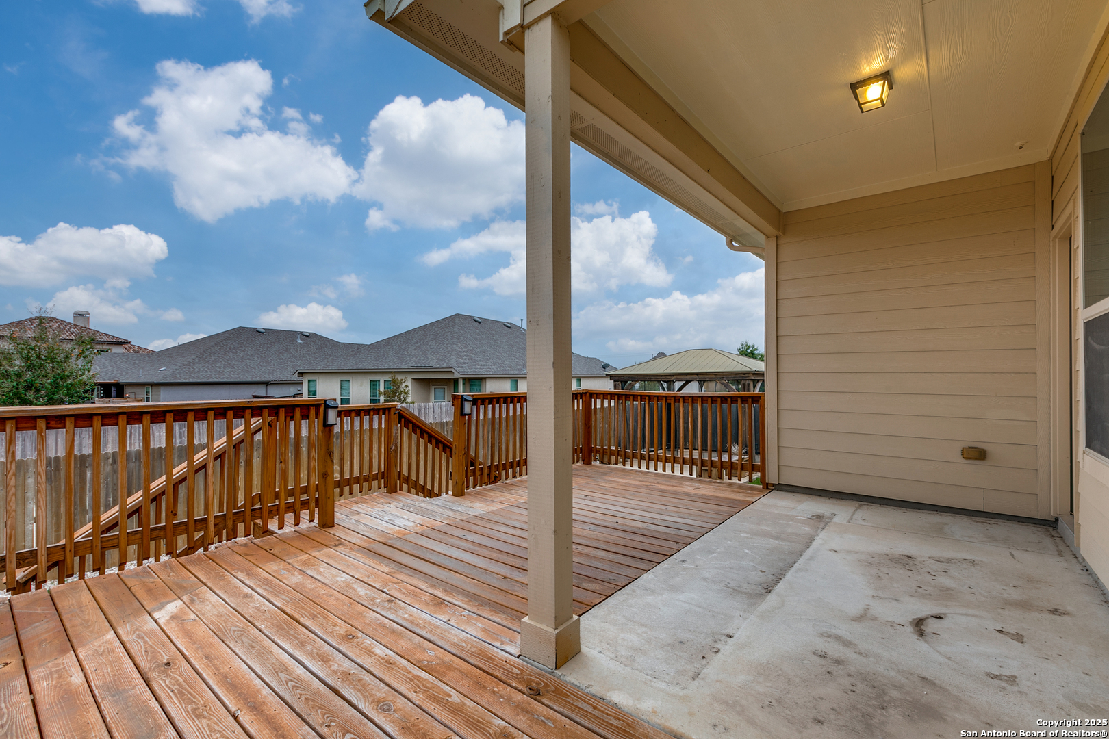 Discover effortless luxury and everyday comfort at 13126 Lattigo Bend - a beautifully crafted Bellaire home tucked inside one of San Antonio's most peaceful, Guarded controlled access Golf communities "Trails at Briggs Ranch" From the moment you step inside, this single-story home welcomes you with high ceilings, warm natural light, and a layout designed for both connection and retreat. The living area anchors the home, opening seamlessly to a chef-inspired kitchen where granite countertops, stainless-steel appliances, gas cooking, and a generous island come together to create the perfect space for gathering, cooking, and entertaining. The primary suite feels like a private escape, featuring a spacious bedroom and a spa-like bath with dual vanities, a soaking tub, a walk-in shower, and a large closet designed to keep life beautifully organized. Two additional bedrooms and a second full bath provide comfort and privacy for guests, family, or a growing household. Outside, the low maintenance backyard becomes your personal retreat. A custom deck with graceful railings leads down to a shaded gazebo and a tranquil lower yard - perfect for morning coffee, evening wine, and everything in between. Thoughtful landscaping and a full sprinkler system keep the space looking pristine year-round. Energy-efficient upgrades, a two-car garage, and an owned water softener add both convenience and peace of mind. And with controlled access, scenic surroundings, and quick routes to major highways, shopping, dining, and Lackland AFB, this location offers the rare blend of serenity and accessibility. 13126 Lattigo Bend is a home where style meets ease, where every space feels intentional, and where life simply flows. Come experience it for yourself.