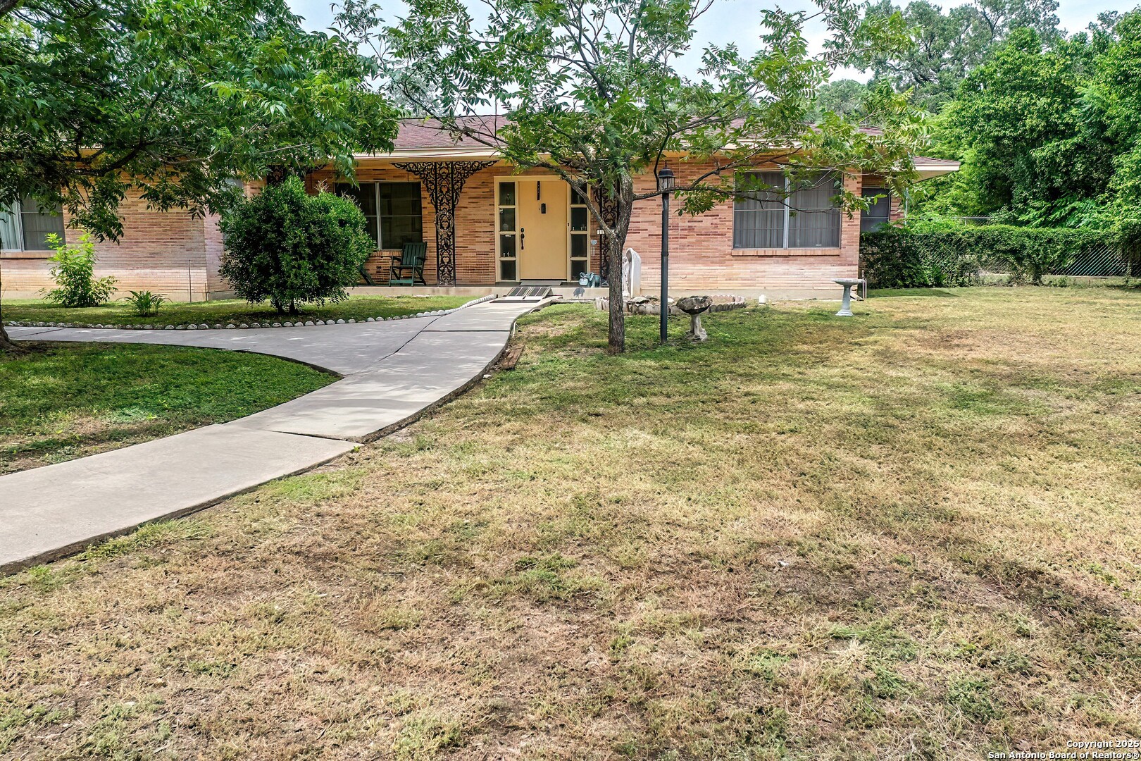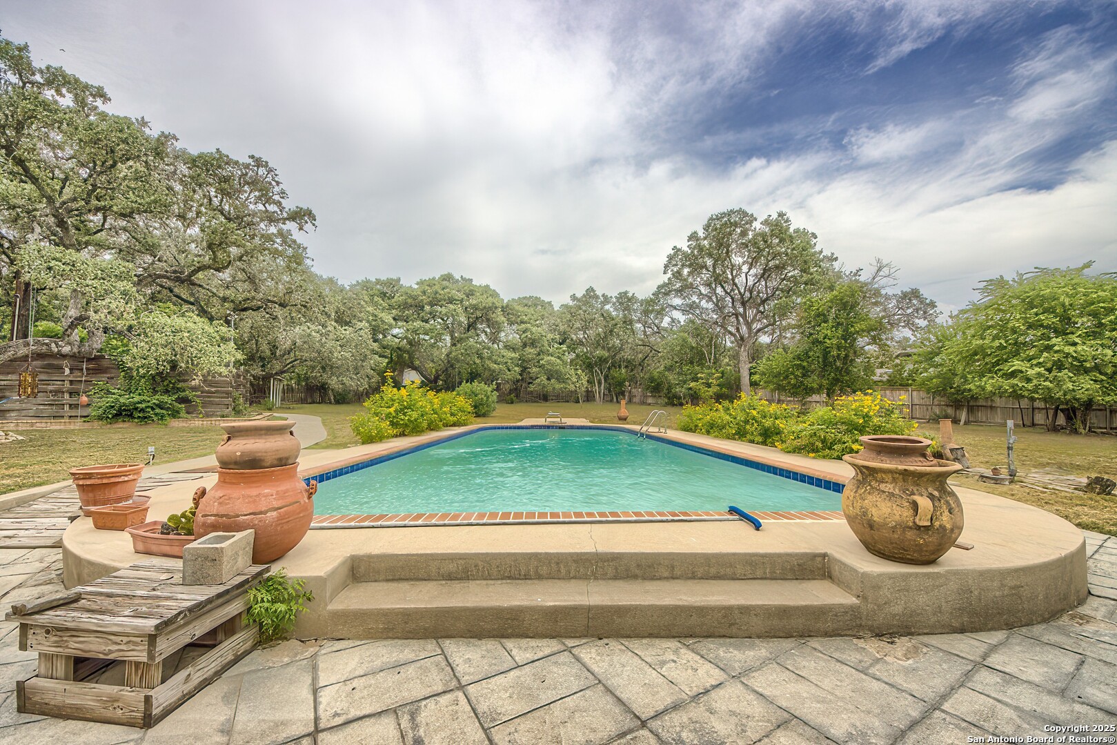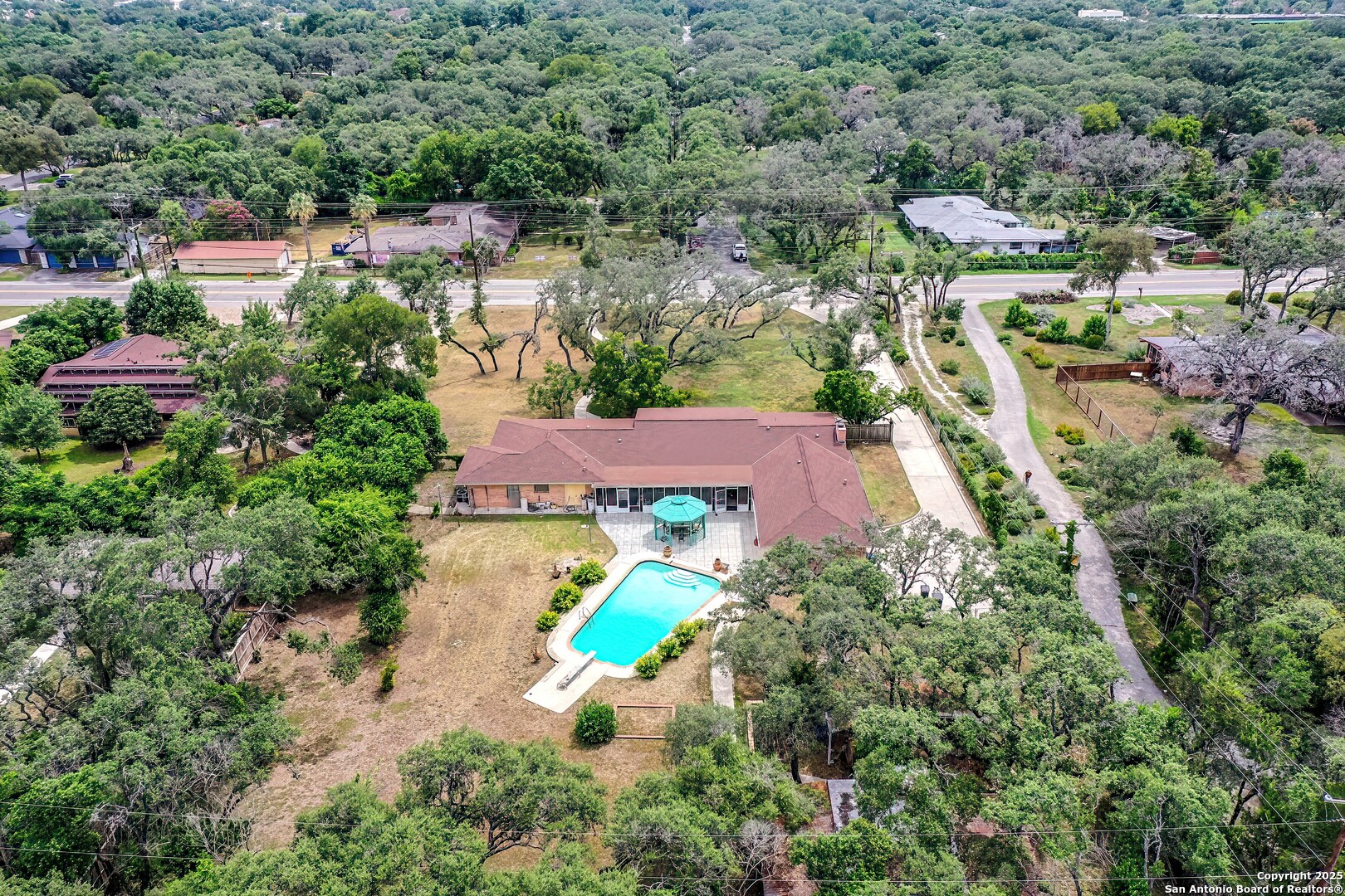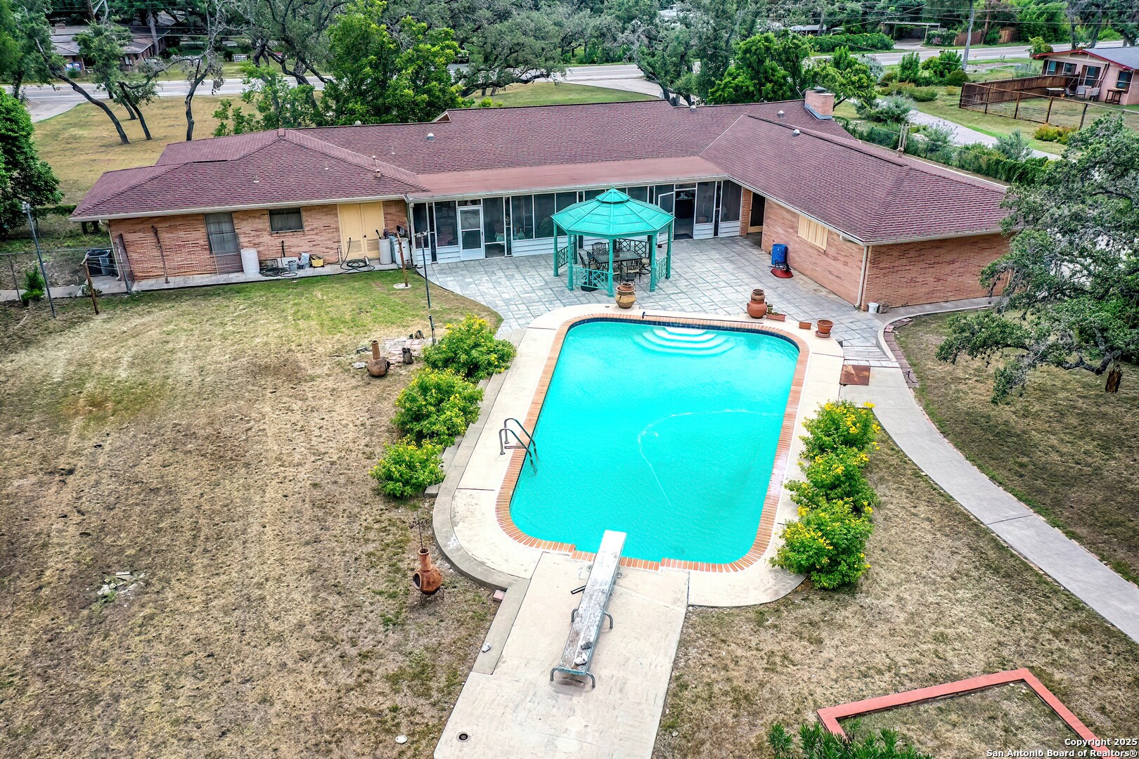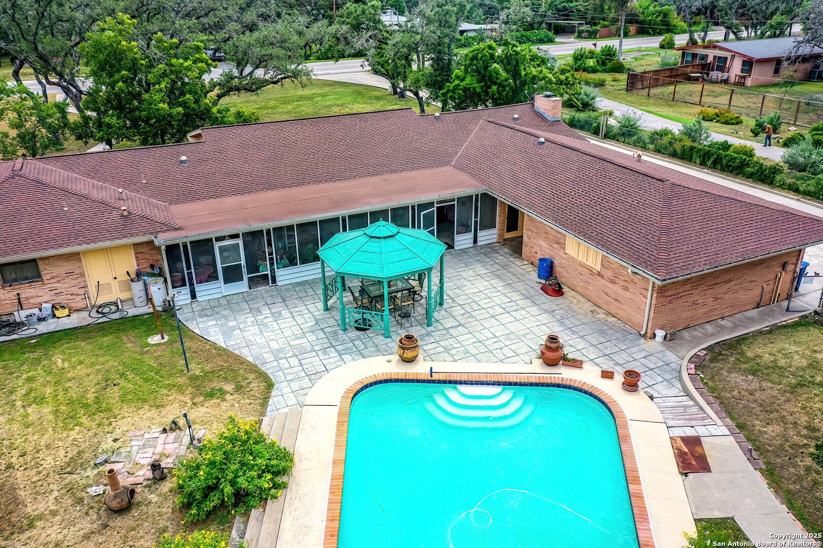RARE FIND - ELEGANT, MID-CENTURY SINGLE STORY ESTATE HOME WITH POOL ON MORE THAN AN ACRE JUST OUTSIDE 410 & ACROSS THE STREET FROM CASTLE HILLS! Oh, if only a home could talk ... step one foot into this amazing residence owned for decades by a world famous musical artist to instantly imagine all the parties she has hosted over the decades and the memories made here. Pull off Lockhill-Selma onto a long driveway past a sweeping lawn dotted with oaks to a sprawling brick rancher that welcomes you in to a space brimming with character. Past a charming front porch, a gracious entry opens into a formal living room with picture window and so many amazing mid century elements including custom lattice shutters. The bookshelf itself is a masterpiece! Straight ahead is a formal dining room that opens past elaborate, decorative lattice doors into an office then into the huge family room ideal for entertaining. Here under beamed ceilings find a brick accent wall and long bar with butler pantry for storage. The kitchen sits in the middle of the home with a sink overlooking the backyard. The adjacent breakfast space under a vintage chandelier offers a cozy space to enjoy a coffee. One wing hosts a large atmospheric primary bedroom awash with natural light and featuring a unique custom wood accent wall. The shared bathroom with beautiful vintage tile on the wall and in tub/shower combo offers plenty of counter space on the vanity along with lots of practical storage. In the opposite wing sits another large secondary bedroom and a guest bathroom with vintage tile walk-in shower with bench and sliding glass doors. The attached, side entry two-car garage has loads of storage closets along one wall. Slip out the back door where the party continues with a massive screened-in porch that runs nearly the length of the house. Head outdoors onto the acreage where a gazebo offers some shade in between frolics in the large, well maintained, recently resurfaced swimming pool deep enough to sport a diving board! An outbuilding that needs work once served as a casita and later an office has plumbing for a full bathroom. Use your imagination on the rest of the remainder of the 1.3 acre, level lot or just enjoy its natural beauty under the shade of mature trees. All this in an incredibly convenient location -- between Northwest Military and Blanco, less than a mile off Loop 410 right in the heart of North San Antonio, peaceful yet surrounded by shopping and restaurants. Get to North Star in 5 minutes, the Pearl and downtown in 15. Currently zoned for popular NEISD schools including Castle Hills Elementary, Eisenhauer Middle and Churchill High. This once-in-lifetime gem is ready for you to revel in her truly original character or to renovate to Mid-Century Modern. See it to believe what an incredible opportunity this home is coupled with an incredible location! Hurry!