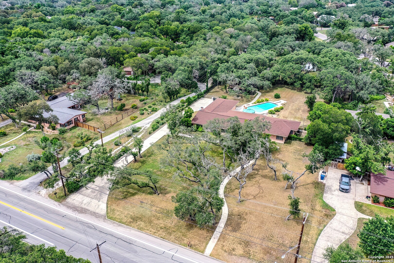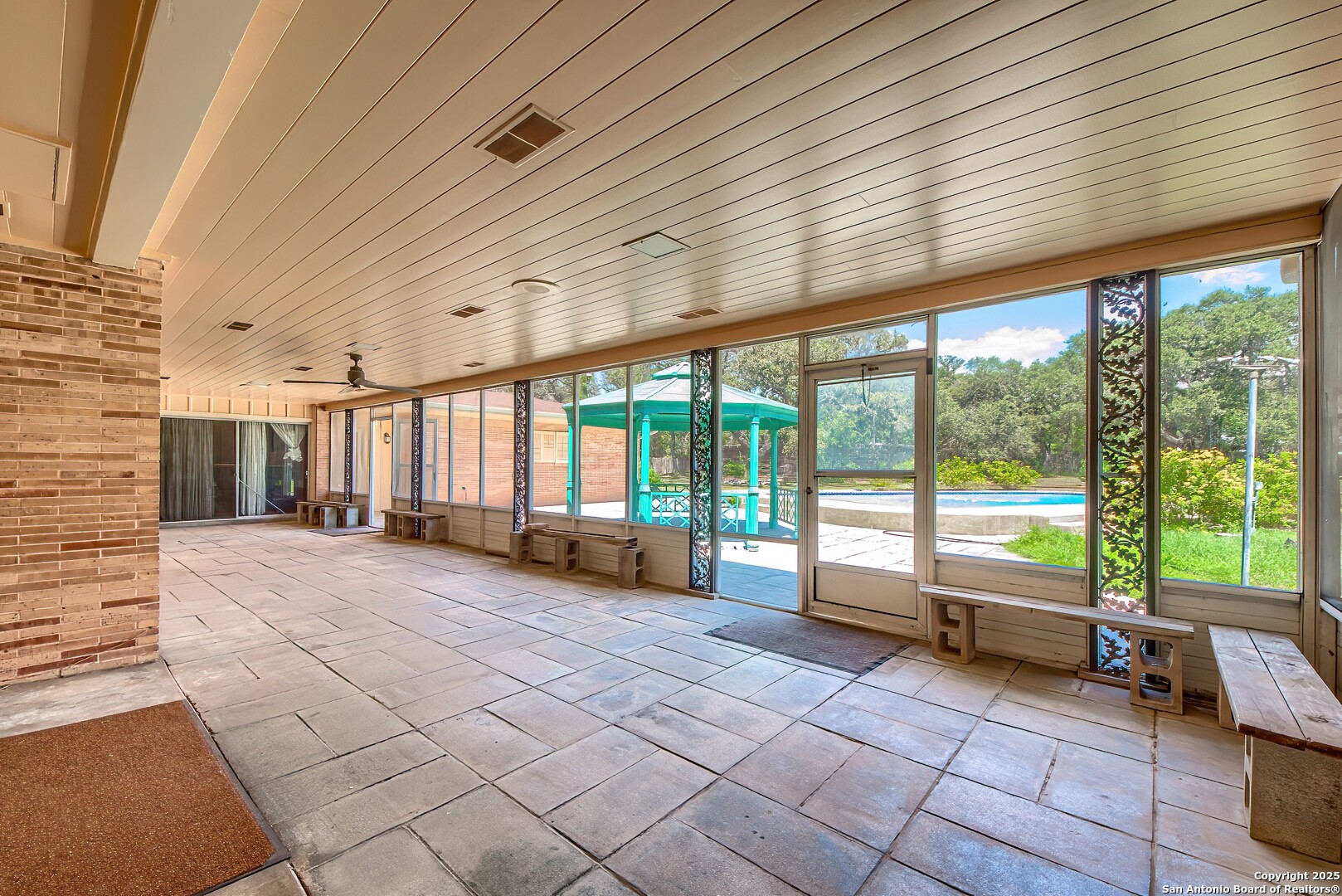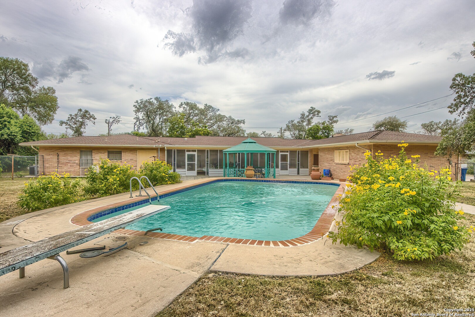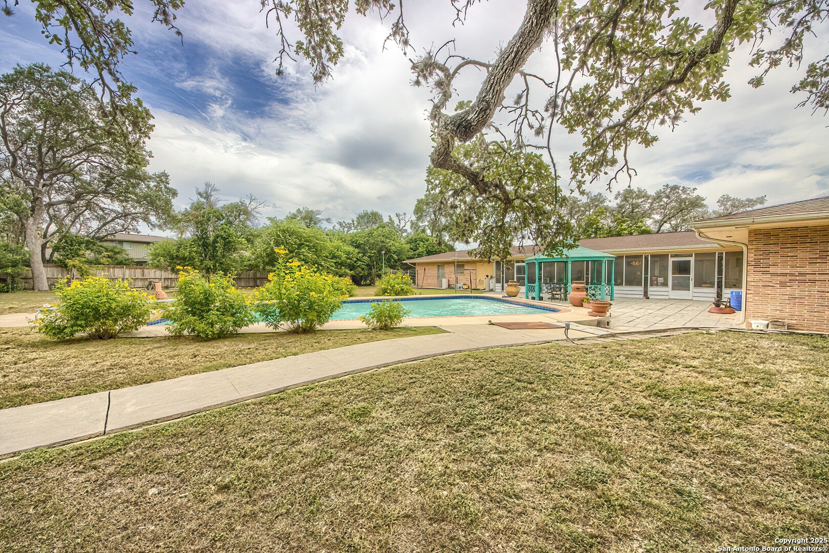 RARE FIND - ELEGANT, MID-CENTURY SINGLE STORY ESTATE HOME WITH POOL ON MORE THAN AN ACRE JUST OUTSIDE 410 & ACROSS THE STREET FROM CASTLE HILLS! Oh, if only a home could talk ... step one foot into this amazing residence owned for decades by a world famous musical artist to instantly imagine all the parties she has hosted over the decades and the memories made here. Pull off Lockhill-Selma onto a long driveway past a sweeping lawn dotted with oaks to a sprawling brick rancher that welcomes you in to a space brimming with character. Past a charming front porch, a gracious entry opens into a formal living room with picture window and so many amazing mid century elements including custom lattice shutters. The bookshelf itself is a masterpiece! Straight ahead is a formal dining room that opens past elaborate, decorative lattice doors into an office then into the huge family room ideal for entertaining. Here under beamed ceilings find a brick accent wall and long bar with butler pantry for storage. The kitchen sits in the middle of the home with a sink overlooking the backyard. The adjacent breakfast space under a vintage chandelier offers a cozy space to enjoy a coffee. One wing hosts a large atmospheric primary bedroom awash with natural light and featuring a unique custom wood accent wall. The shared bathroom with beautiful vintage tile on the wall and in tub/shower combo offers plenty of counter space on the vanity along with lots of practical storage. In the opposite wing sits another large secondary bedroom and a guest bathroom with vintage tile walk-in shower with bench and sliding glass doors. The attached, side entry two-car garage has loads of storage closets along one wall. Slip out the back door where the party continues with a massive screened-in porch that runs nearly the length of the house. Head outdoors onto the acreage where a gazebo offers some shade in between frolics in the large, well maintained, recently resurfaced swimming pool deep enough to sport a diving board! An outbuilding that needs work once served as a casita and later an office has plumbing for a full bathroom. Use your imagination on the rest of the remainder of the 1.3 acre, level lot or just enjoy its natural beauty under the shade of mature trees. All this in an incredibly convenient location -- between Northwest Military and Blanco, less than a mile off Loop 410 right in the heart of North San Antonio, peaceful yet surrounded by shopping and restaurants. Get to North Star in 5 minutes, the Pearl and downtown in 15. Currently zoned for popular NEISD schools including Castle Hills Elementary, Eisenhauer Middle and Churchill High. This once-in-lifetime gem is ready for you to revel in her truly original character or to renovate to Mid-Century Modern. See it to believe what an incredible opportunity this home is coupled with an incredible location! Hurry!