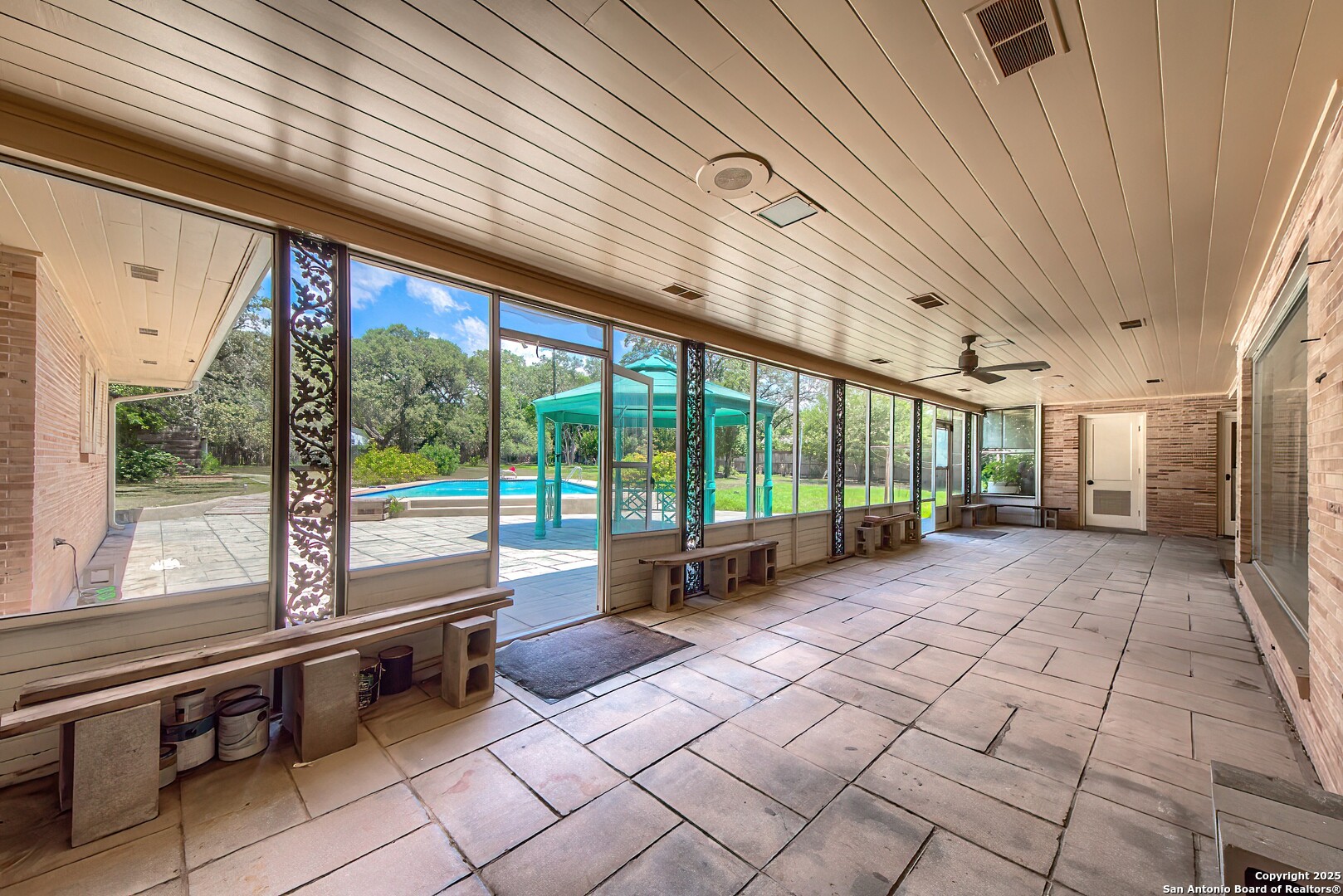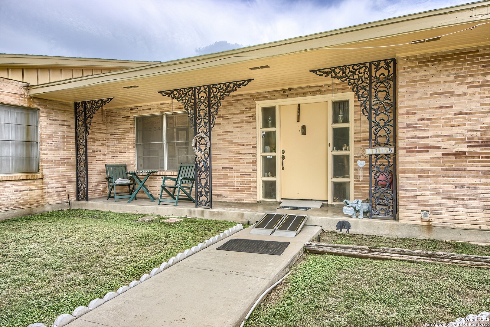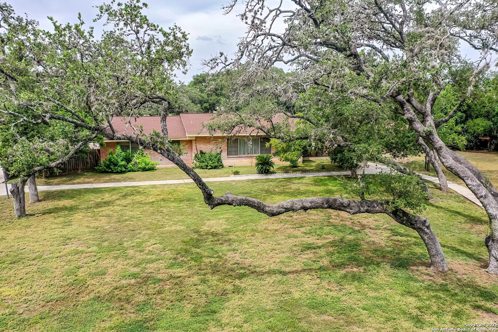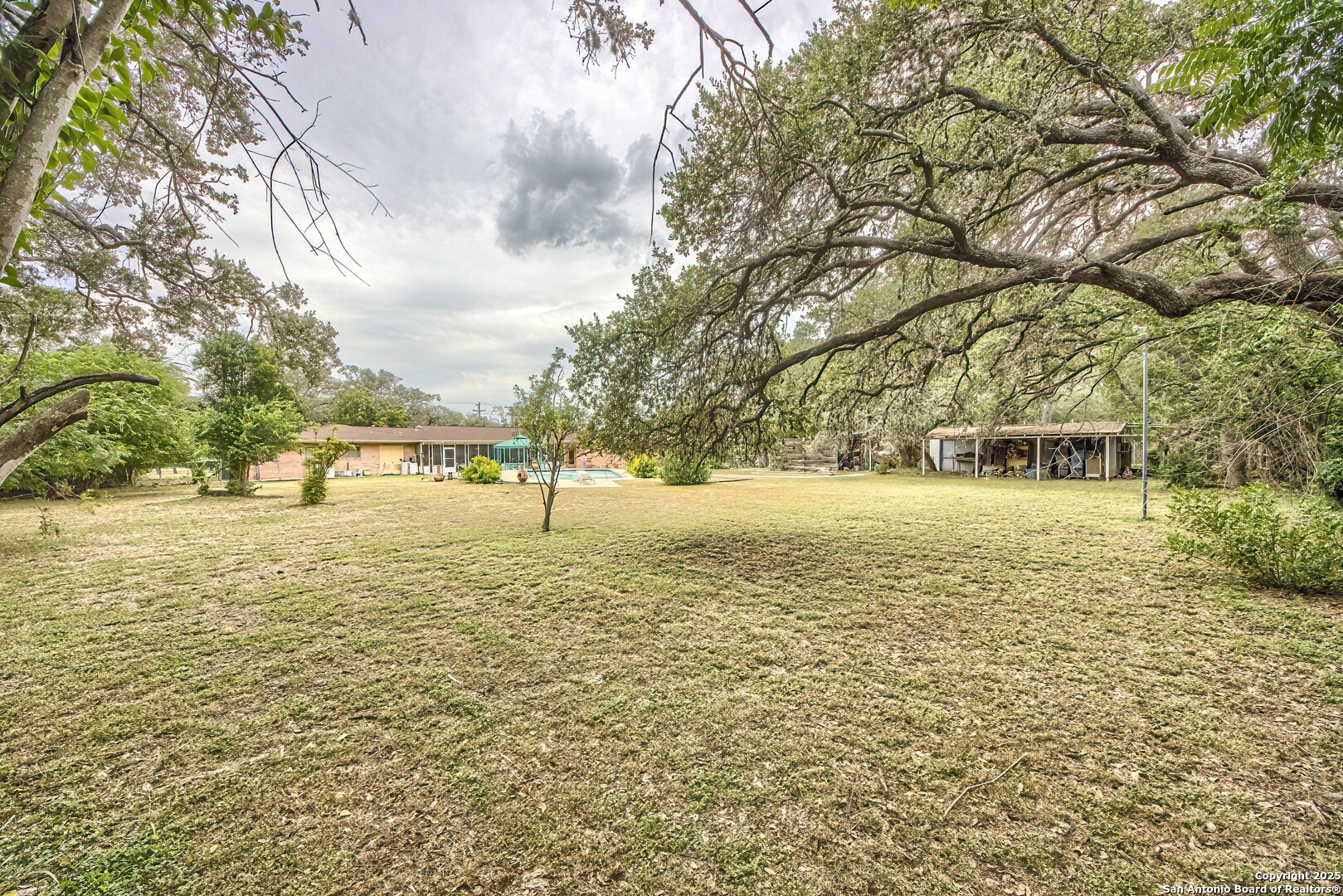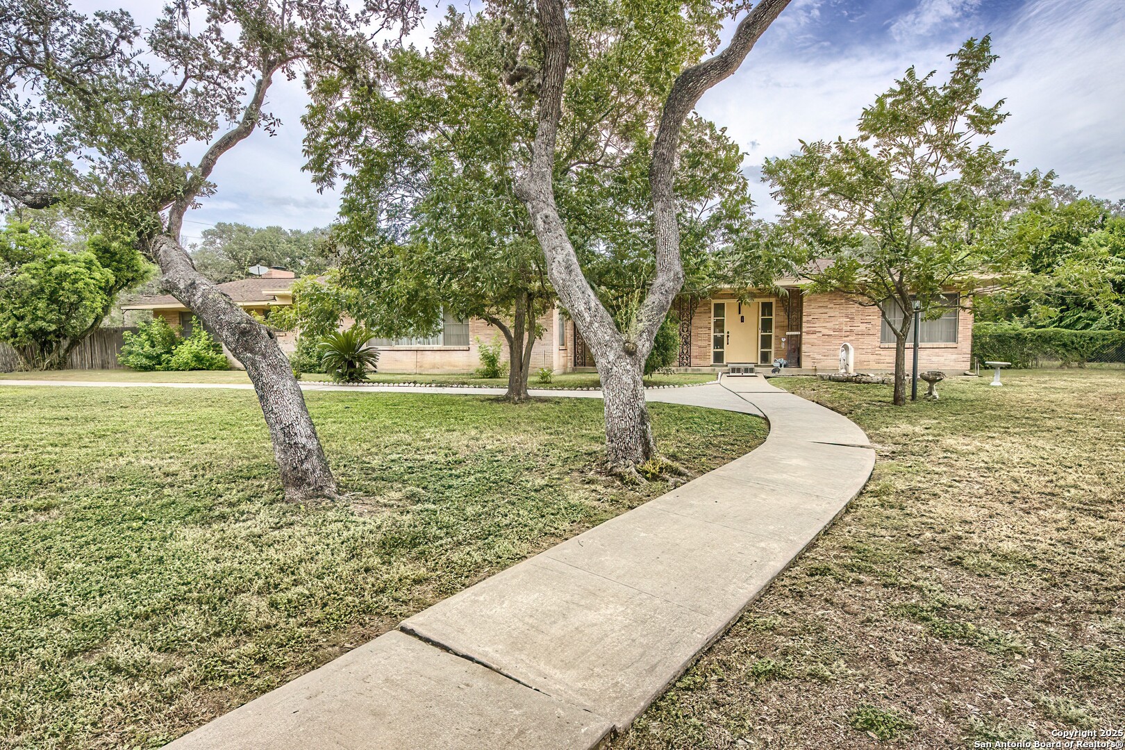 RARE FIND - ELEGANT, MID-CENTURY SINGLE STORY ESTATE HOME WITH POOL ON MORE THAN AN ACRE JUST OUTSIDE 410 & ACROSS THE STREET FROM CASTLE HILLS! Oh, if only a home could talk ... step one foot into this amazing residence owned for decades by a world famous musical artist to instantly imagine all the parties she has hosted over the decades and the memories made here. Pull off Lockhill-Selma onto a long driveway past a sweeping lawn dotted with oaks to a sprawling brick rancher that welcomes you in to a space brimming with character. Past a charming front porch, a gracious entry opens into a formal living room with picture window and so many amazing mid century elements including custom lattice shutters. The bookshelf itself is a masterpiece! Straight ahead is a formal dining room that opens past elaborate, decorative lattice doors into an office then into the huge family room ideal for entertaining. Here under beamed ceilings find a brick accent wall and long bar with butler pantry for storage. The kitchen sits in the middle of the home with a sink overlooking the backyard. The adjacent breakfast space under a vintage chandelier offers a cozy space to enjoy a coffee. One wing hosts a large atmospheric primary bedroom awash with natural light and featuring a unique custom wood accent wall. The shared bathroom with beautiful vintage tile on the wall and in tub/shower combo offers plenty of counter space on the vanity along with lots of practical storage. In the opposite wing sits another large secondary bedroom and a guest bathroom with vintage tile walk-in shower with bench and sliding glass doors. The attached, side entry two-car garage has loads of storage closets along one wall. Slip out the back door where the party continues with a massive screened-in porch that runs nearly the length of the house. Head outdoors onto the acreage where a gazebo offers some shade in between frolics in the large, well maintained, recently resurfaced swimming pool deep enough to sport a diving board! An outbuilding that needs work once served as a casita and later an office has plumbing for a full bathroom. Use your imagination on the rest of the remainder of the 1.3 acre, level lot or just enjoy its natural beauty under the shade of mature trees. All this in an incredibly convenient location -- between Northwest Military and Blanco, less than a mile off Loop 410 right in the heart of North San Antonio, peaceful yet surrounded by shopping and restaurants. Get to North Star in 5 minutes, the Pearl and downtown in 15. Currently zoned for popular NEISD schools including Castle Hills Elementary, Eisenhauer Middle and Churchill High. This once-in-lifetime gem is ready for you to revel in her truly original character or to renovate to Mid-Century Modern. See it to believe what an incredible opportunity this home is coupled with an incredible location! Hurry!