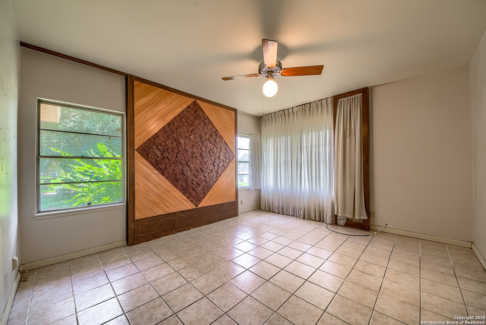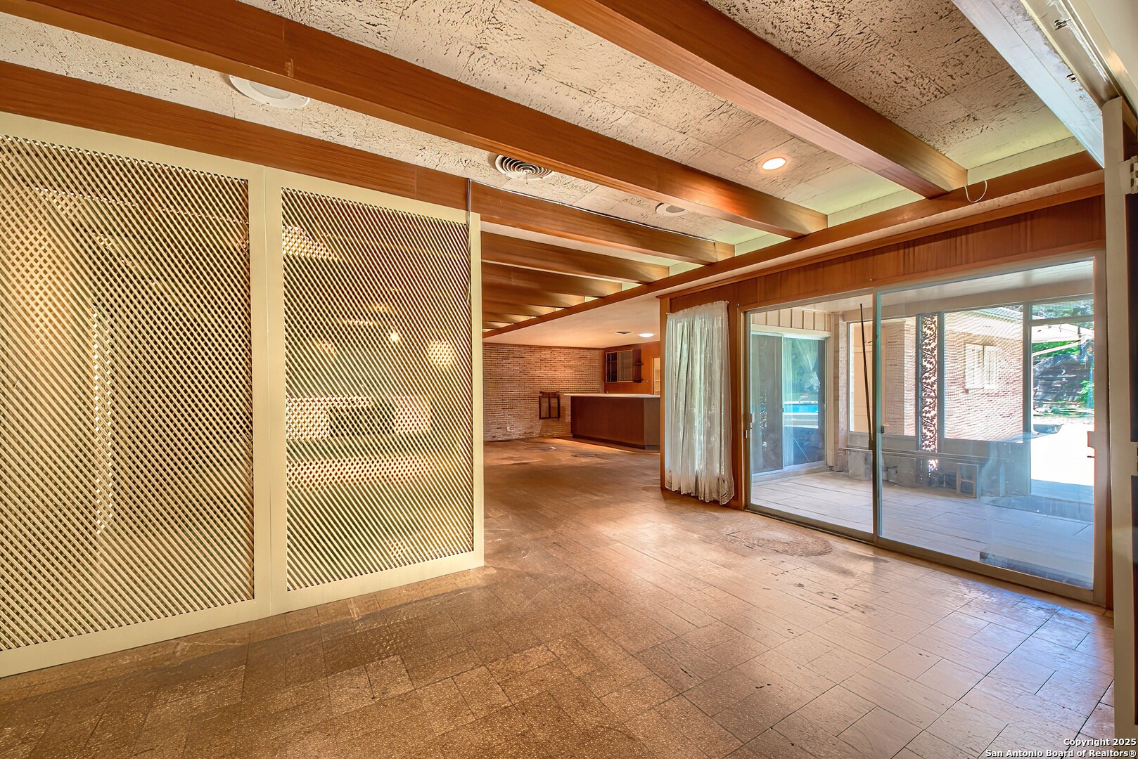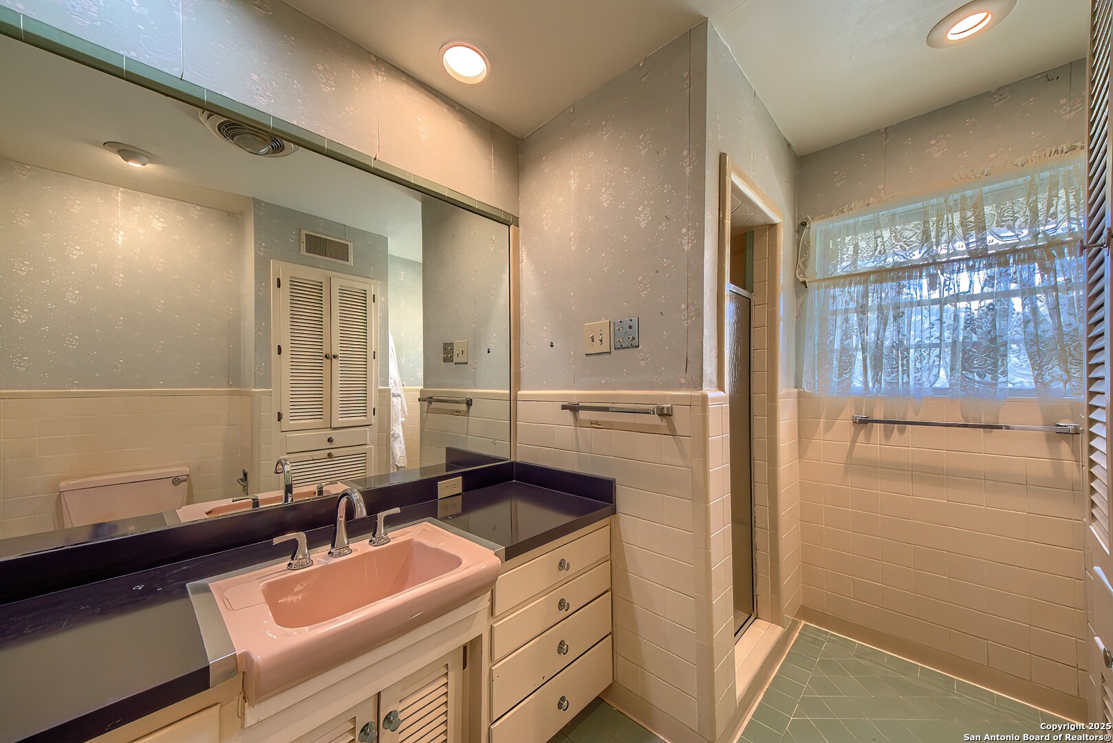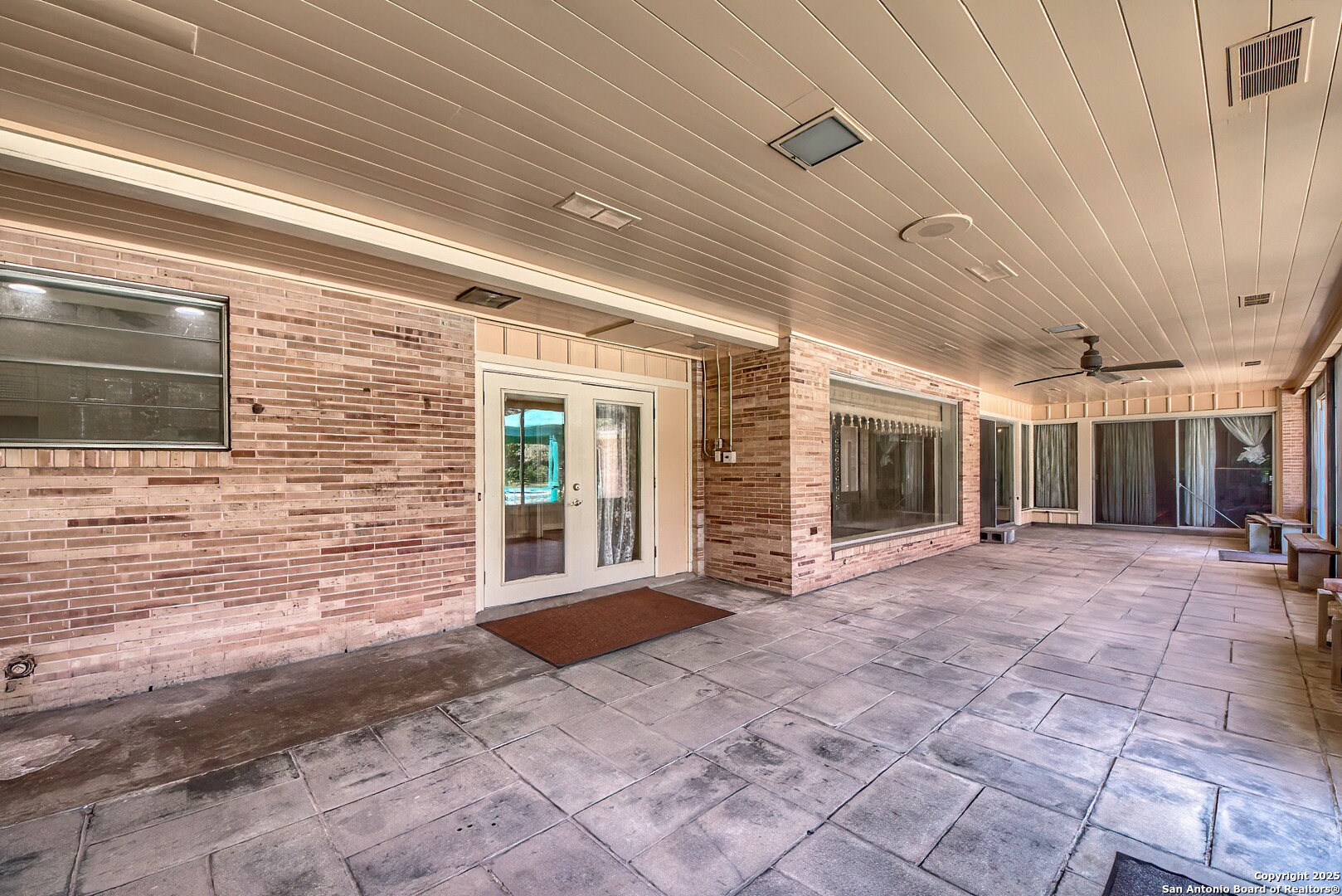RARE FIND - ELEGANT, MID-CENTURY SINGLE STORY ESTATE HOME WITH POOL ON MORE THAN AN ACRE JUST OUTSIDE 410 & ACROSS THE STREET FROM CASTLE HILLS! Oh, if only a home could talk ... step one foot into this amazing residence owned for decades by a world famous musical artist to instantly imagine all the parties she has hosted over the decades and the memories made here. Pull off Lockhill-Selma onto a long driveway past a sweeping lawn dotted with oaks to a sprawling brick rancher that welcomes you in to a space brimming with character. Past a charming front porch, a gracious entry opens into a formal living room with picture window and so many amazing mid century elements including custom lattice shutters. The bookshelf itself is a masterpiece! Straight ahead is a formal dining room that opens past elaborate, decorative lattice doors into an office then into the huge family room ideal for entertaining. Here under beamed ceilings find a brick accent wall and long bar with butler pantry for storage. The kitchen sits in the middle of the home with a sink overlooking the backyard. The adjacent breakfast space under a vintage chandelier offers a cozy space to enjoy a coffee. One wing hosts a large atmospheric primary bedroom awash with natural light and featuring a unique custom wood accent wall. The shared bathroom with beautiful vintage tile on the wall and in tub/shower combo offers plenty of counter space on the vanity along with lots of practical storage. In the opposite wing sits another large secondary bedroom and a guest bathroom with vintage tile walk-in shower with bench and sliding glass doors. The attached, side entry two-car garage has loads of storage closets along one wall. Slip out the back door where the party continues with a massive screened-in porch that runs nearly the length of the house. Head outdoors onto the acreage where a gazebo offers some shade in between frolics in the large, well maintained, recently resurfaced swimming pool deep enough to sport a diving board! An outbuilding that needs work once served as a casita and later an office has plumbing for a full bathroom. Use your imagination on the rest of the remainder of the 1.3 acre, level lot or just enjoy its natural beauty under the shade of mature trees. All this in an incredibly convenient location -- between Northwest Military and Blanco, less than a mile off Loop 410 right in the heart of North San Antonio, peaceful yet surrounded by shopping and restaurants. Get to North Star in 5 minutes, the Pearl and downtown in 15. Currently zoned for popular NEISD schools including Castle Hills Elementary, Eisenhauer Middle and Churchill High. This once-in-lifetime gem is ready for you to revel in her truly original character or to renovate to Mid-Century Modern. See it to believe what an incredible opportunity this home is coupled with an incredible location! Hurry!