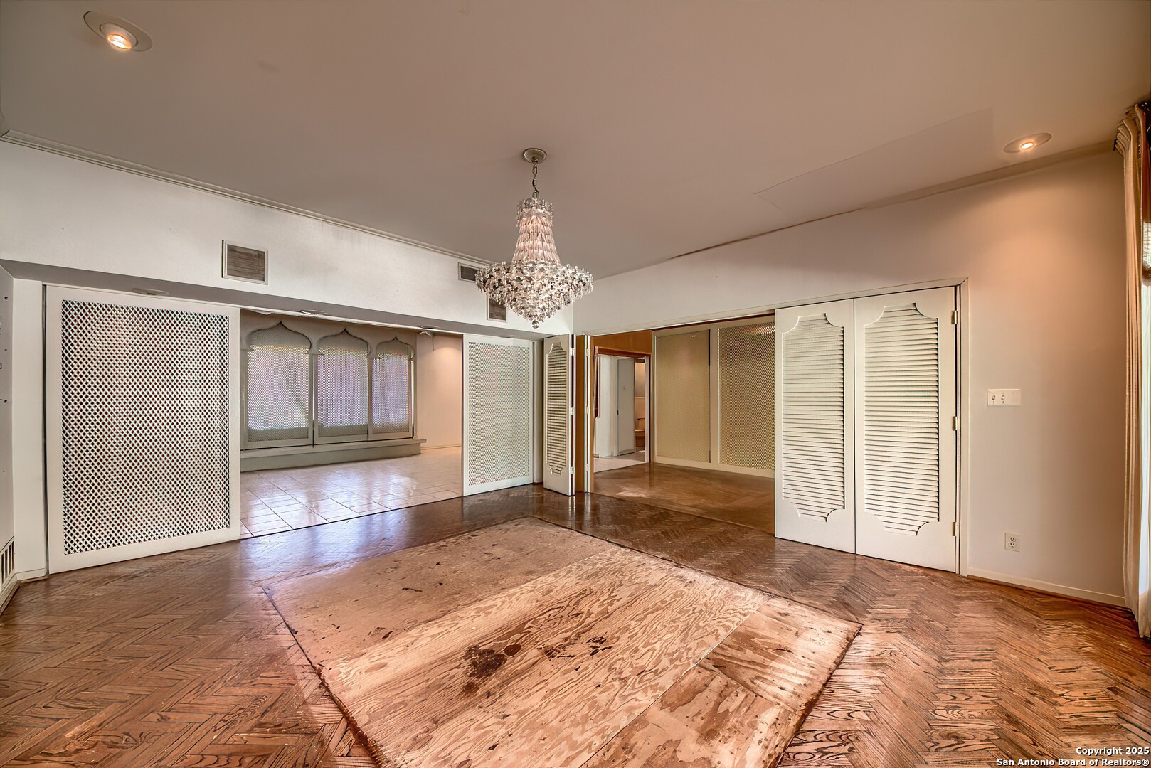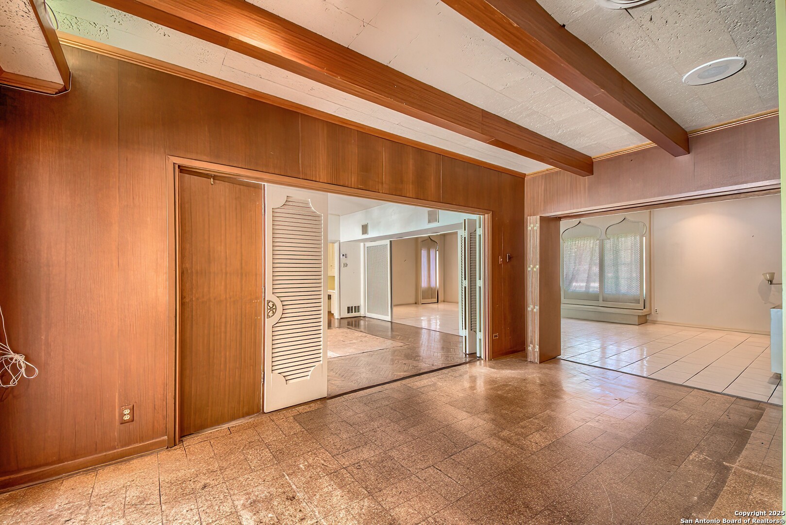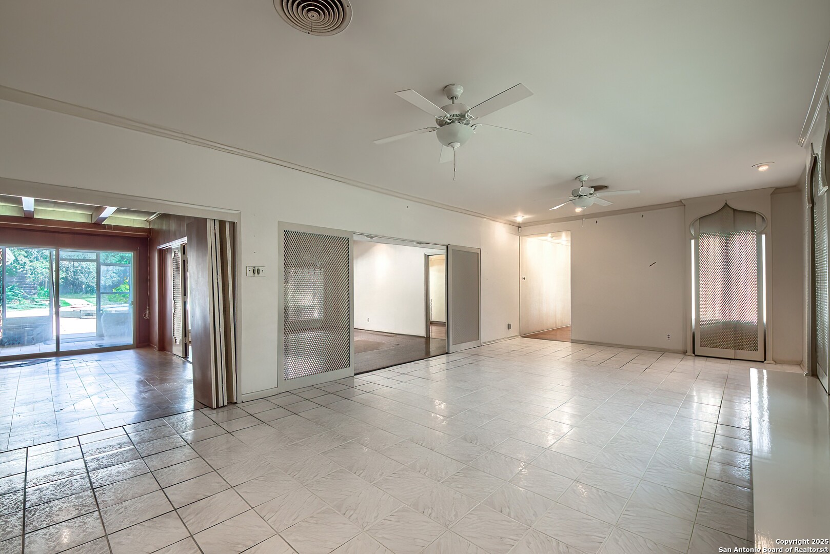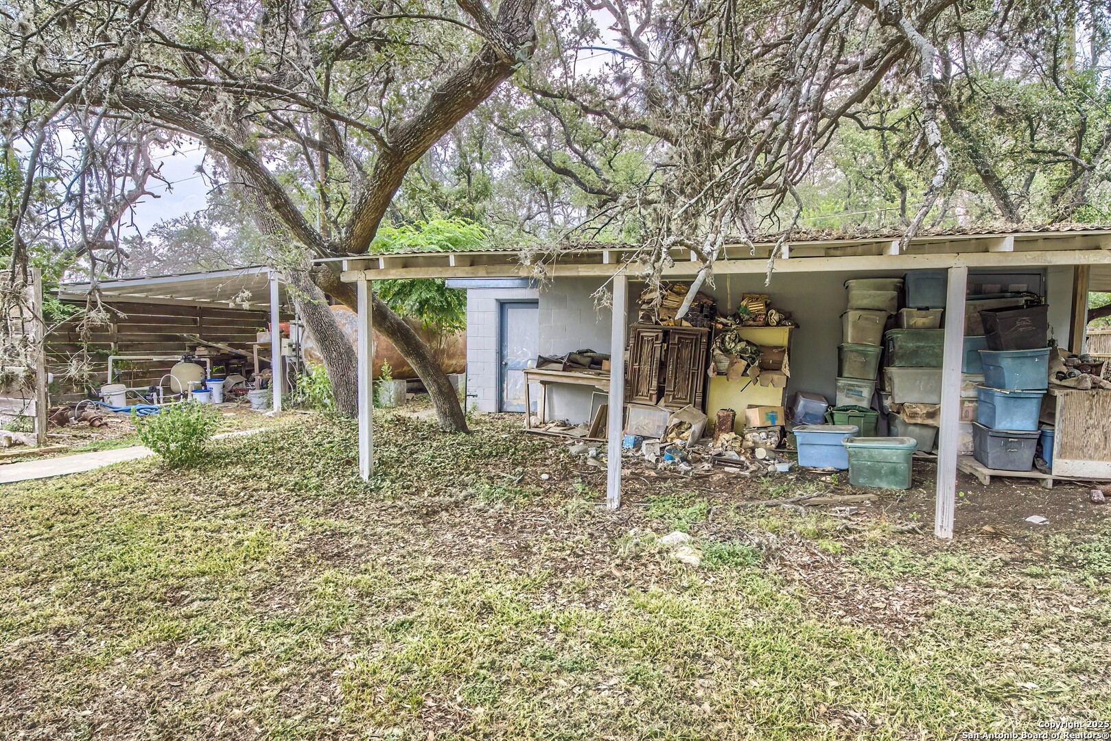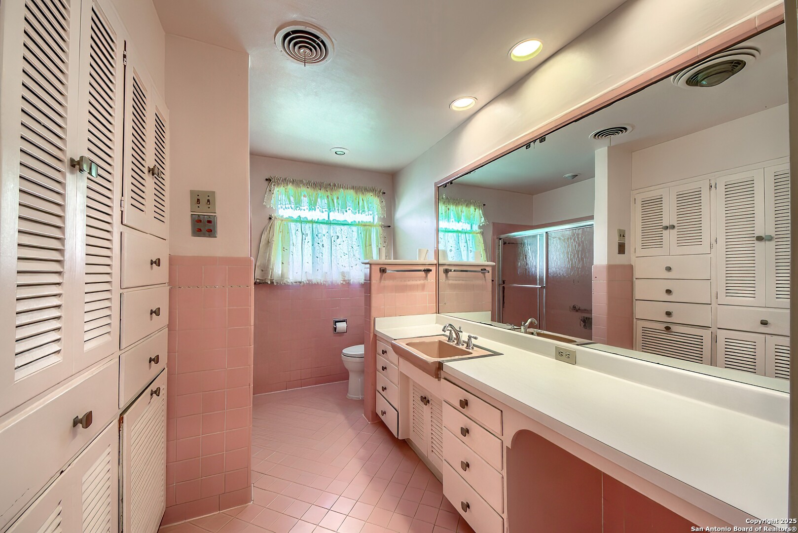 RARE FIND - ELEGANT, MID-CENTURY SINGLE STORY ESTATE HOME WITH POOL ON MORE THAN AN ACRE JUST OUTSIDE 410 & ACROSS THE STREET FROM CASTLE HILLS! Oh, if only a home could talk ... step one foot into this amazing residence owned for decades by a world famous musical artist to instantly imagine all the parties she has hosted over the decades and the memories made here. Pull off Lockhill-Selma onto a long driveway past a sweeping lawn dotted with oaks to a sprawling brick rancher that welcomes you in to a space brimming with character. Past a charming front porch, a gracious entry opens into a formal living room with picture window and so many amazing mid century elements including custom lattice shutters. The bookshelf itself is a masterpiece! Straight ahead is a formal dining room that opens past elaborate, decorative lattice doors into an office then into the huge family room ideal for entertaining. Here under beamed ceilings find a brick accent wall and long bar with butler pantry for storage. The kitchen sits in the middle of the home with a sink overlooking the backyard. The adjacent breakfast space under a vintage chandelier offers a cozy space to enjoy a coffee. One wing hosts a large atmospheric primary bedroom awash with natural light and featuring a unique custom wood accent wall. The shared bathroom with beautiful vintage tile on the wall and in tub/shower combo offers plenty of counter space on the vanity along with lots of practical storage. In the opposite wing sits another large secondary bedroom and a guest bathroom with vintage tile walk-in shower with bench and sliding glass doors. The attached, side entry two-car garage has loads of storage closets along one wall. Slip out the back door where the party continues with a massive screened-in porch that runs nearly the length of the house. Head outdoors onto the acreage where a gazebo offers some shade in between frolics in the large, well maintained, recently resurfaced swimming pool deep enough to sport a diving board! An outbuilding that needs work once served as a casita and later an office has plumbing for a full bathroom. Use your imagination on the rest of the remainder of the 1.3 acre, level lot or just enjoy its natural beauty under the shade of mature trees. All this in an incredibly convenient location -- between Northwest Military and Blanco, less than a mile off Loop 410 right in the heart of North San Antonio, peaceful yet surrounded by shopping and restaurants. Get to North Star in 5 minutes, the Pearl and downtown in 15. Currently zoned for popular NEISD schools including Castle Hills Elementary, Eisenhauer Middle and Churchill High. This once-in-lifetime gem is ready for you to revel in her truly original character or to renovate to Mid-Century Modern. See it to believe what an incredible opportunity this home is coupled with an incredible location! Hurry!
