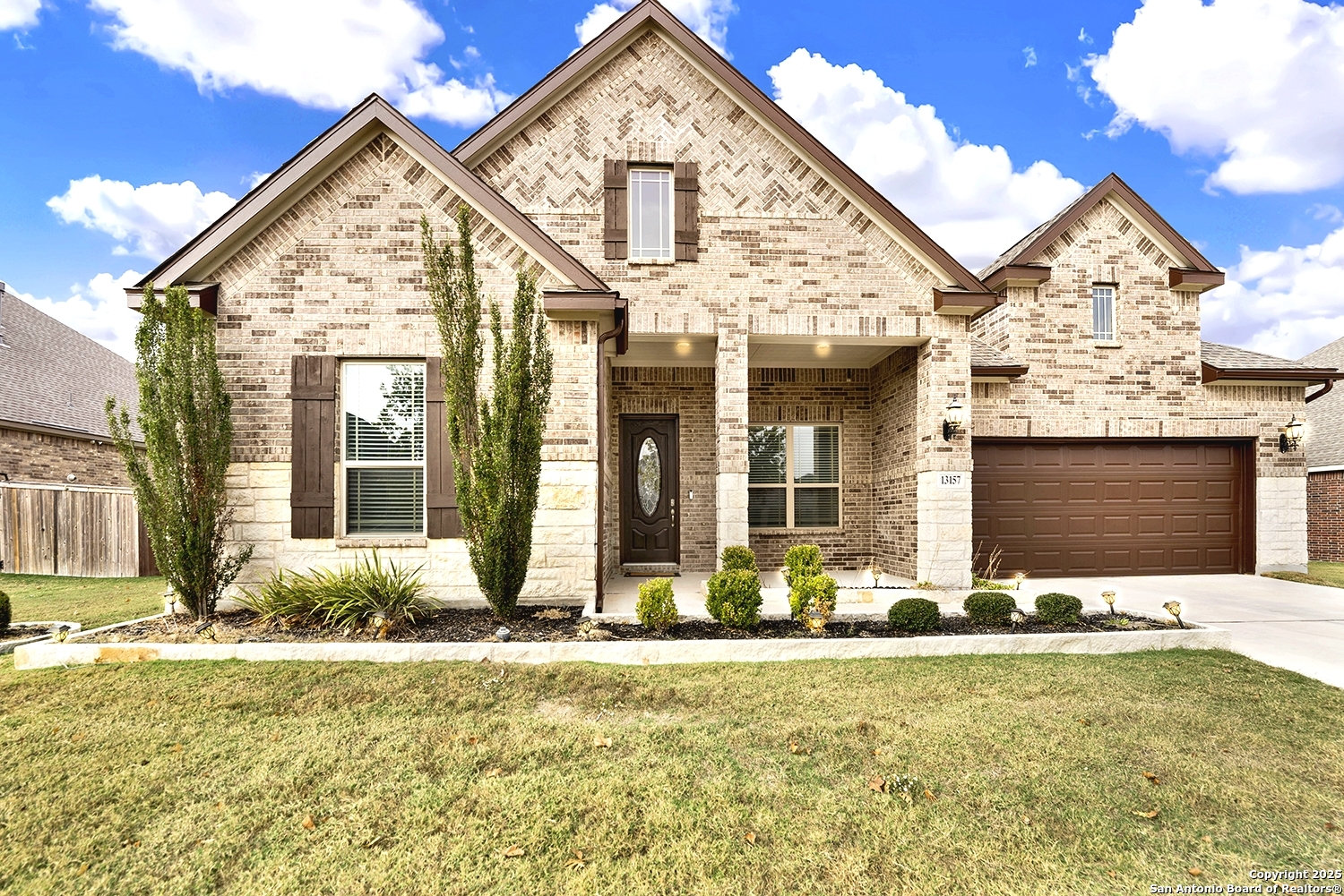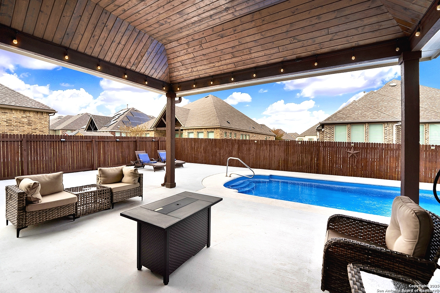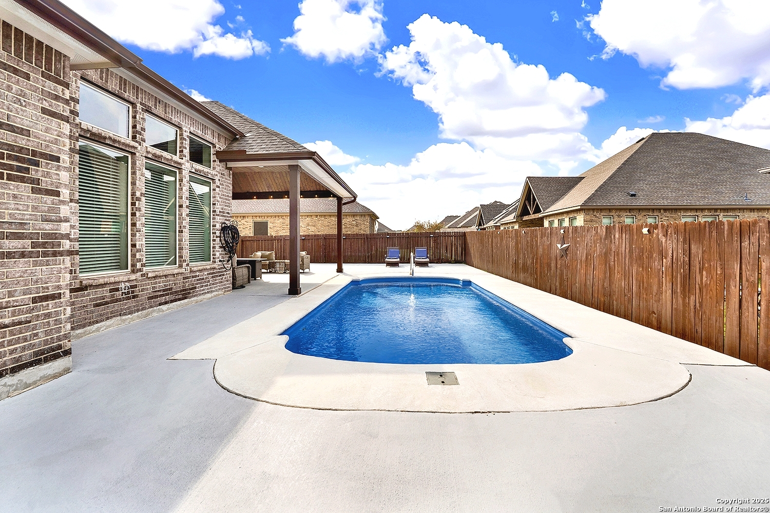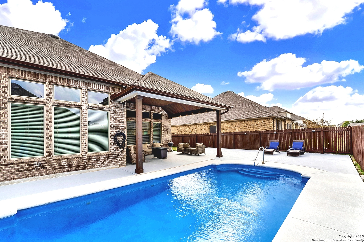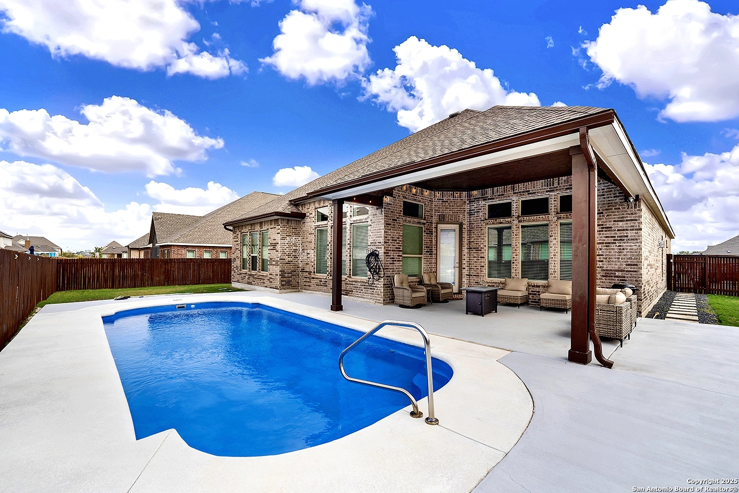 Pool! One story! Common sense layout and amazing upgrades, all in one home! This pheonomenal Gehan plan offers 3 generously- sized bedrooms, a flex space, 2.5 baths, and a 2-car garage complete with a water softener and refrigerator. Inside, thoughtfully customized upgrades elevate every room, complemented by walk-in closets throughout and two elegant fireplaces that add warmth and charm. The oversized covered patio-with its beautiful cedar plank ceiling-overlooks the sparkling pool, creating an ideal setting for outdoor living. The expansive primary suite also enjoys serene pool views and features a luxurious bath with a double split vanity, garden tub, and a walk-in shower with a bench. A secondary bathroom includes its own walk-in shower for added convenience. With low HOA dues and exceptional interior and exterior features, like wall paneling, decorative tray celings, and a custom pathway to the back yard, this home blends comfort, style, and value in every detail. Ideally located close to downtown San Antonio, Randolph Air Force Base, and offering easy access to Lackland Air Force Base and Fort Sam Houston, this property delivers unmatched convenience for work, travel, and entertainment. Come find your comfort within an awesome community!