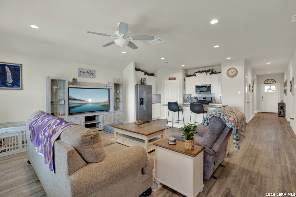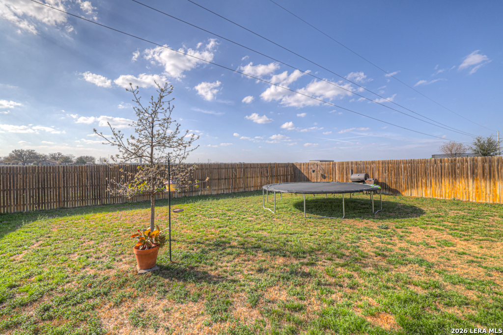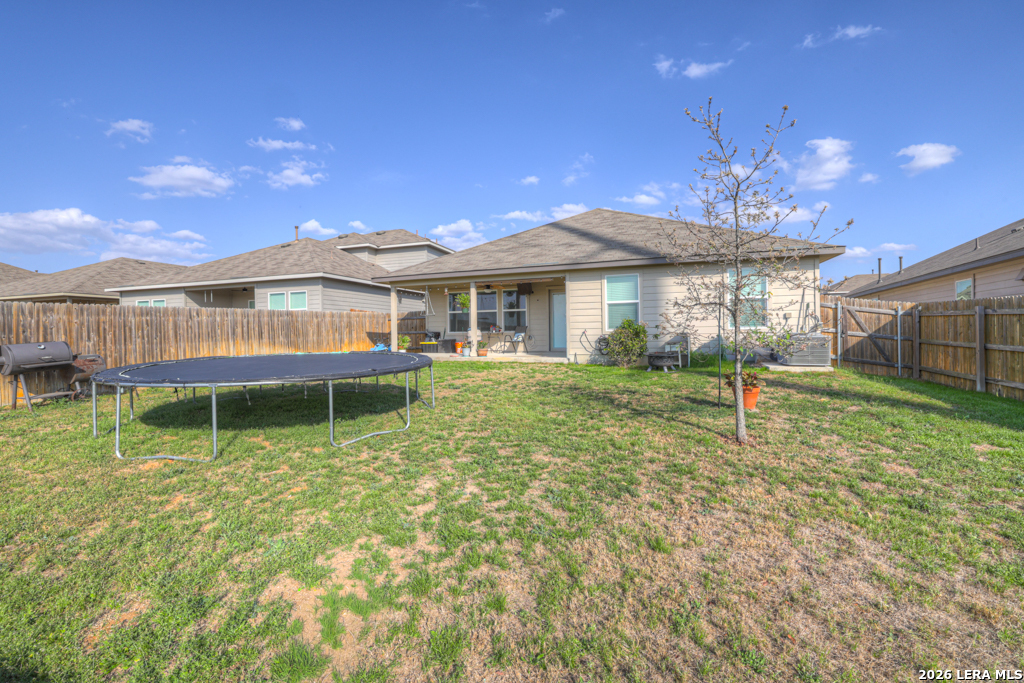 Welcome home to one of the builder's largest single-story floor plans, thoughtfully designed for both entertaining and everyday comfort. This spacious 4-bedroom, 2-bath residence offers an ideal split-bedroom layout, providing privacy for the primary suite while keeping everyone connected. The private primary retreat is tucked just off the expansive open-concept living area, creating a peaceful escape with convenient access. The bright living room flows seamlessly into the well-appointed kitchen and dining area, making gatherings effortless and inviting. The kitchen features generous counter space, abundant cabinetry, and an open design that allows the cook to stay part of the conversation. From here, you'll enjoy clear views of the oversized backyard - perfect for entertaining, play, or simply relaxing. Backing to a greenbelt, the outdoor space offers added privacy and room to spread out. Secondary bedrooms are comfortably sized and share a well-designed bathroom with ample storage. A large laundry room provides additional storage space to keep everything organized and out of sight. Ideally located within walking distance of the brand-new Navarro South Elementary, this home combines space, functionality, and a prime setting. Don't miss your opportunity to make it yours today!