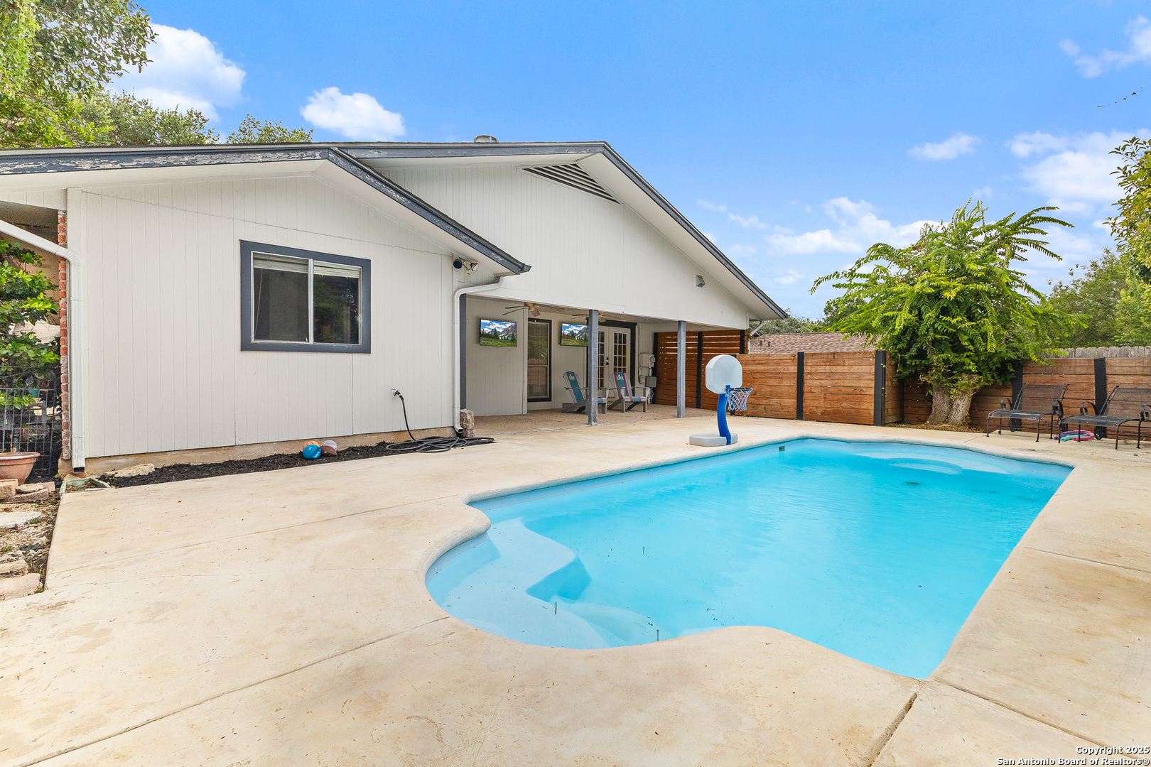 Stop by and see this freshly painted 3 bedrooms with 2 baths including an inground pool! Primary room has french doors leading to your private backyard with a pool. The backyard has been completely redone including new fence, resurfaced entire pool, new cement around the pool, new pool pump, and all new plumbing to pool from the pump/Filter. Nice size shed to store pool supplies. Not to mention the roof and gutters were both replaced in 2019!! Great location with HEB and Walmart within walking distance. Easy access to 1604 and IH 35. Also 10 minutes from Randolph Air Force Base and The Forum.