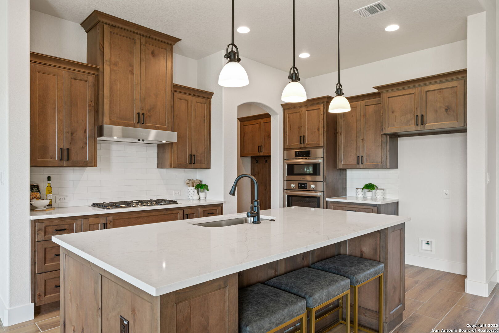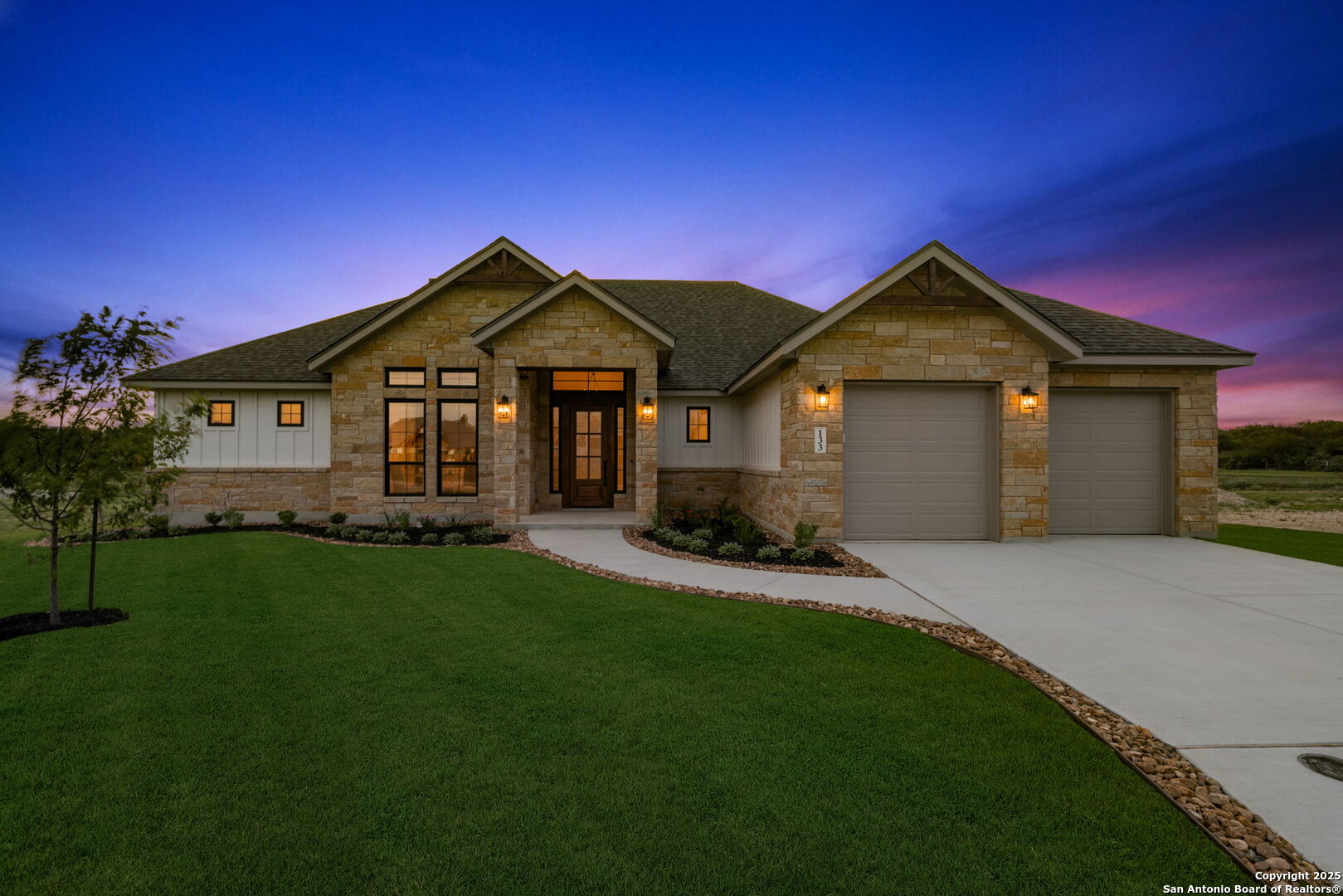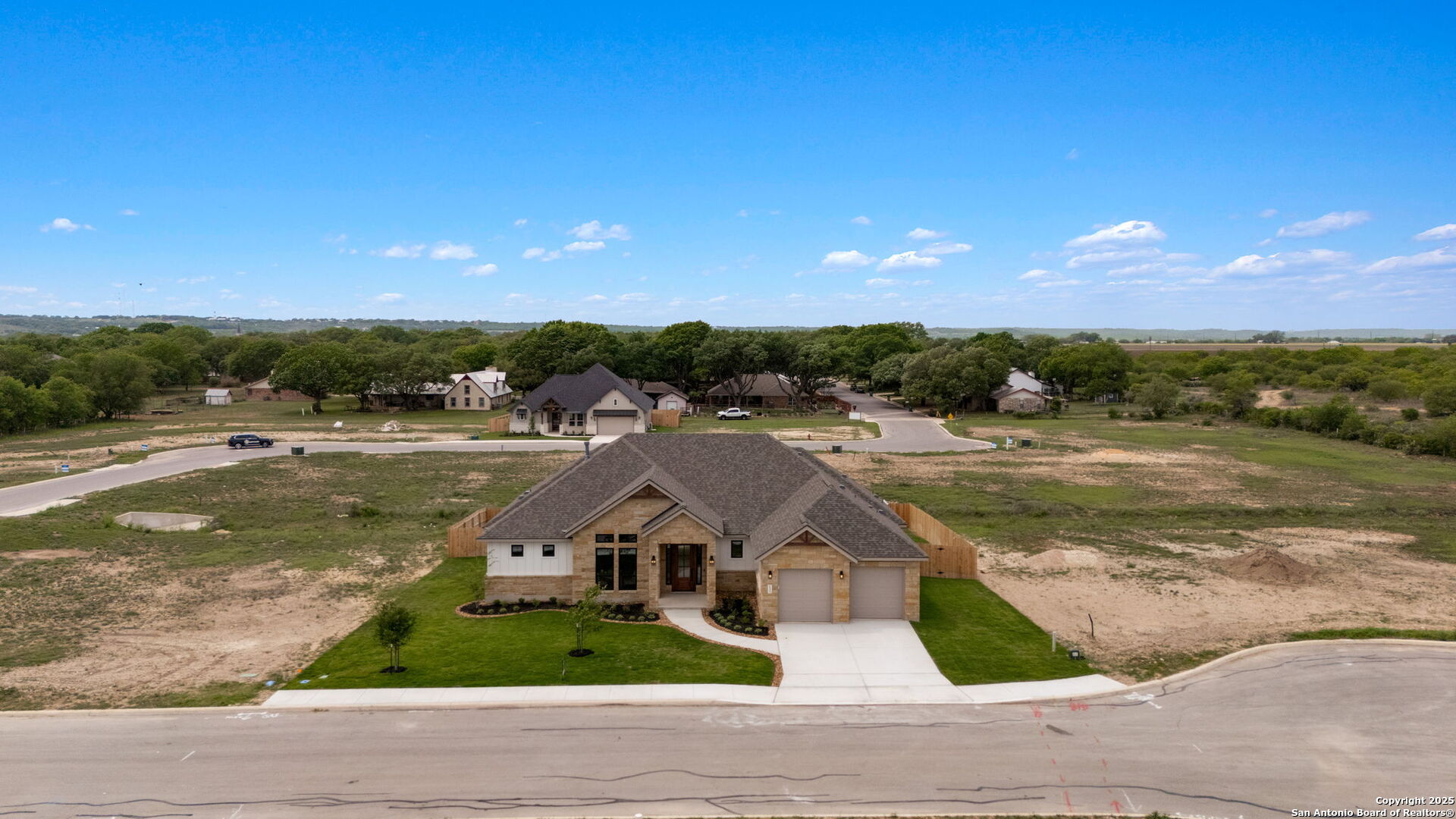 Welcome to luxury living at its finest, nestled within the serene and prestigious Country Village Estates in charming Castroville, TX. This newly constructed masterpiece by renowned builder Etter Custom Homes sets a new standard of elegance and craftsmanship. The single-story custom residence boasts 2,535 sq ft of meticulously designed living space, including 3 spacious bedrooms and 2.5 luxurious baths. As you enter, you're greeted by stunning 8-foot shaker panel solid core doors, high ceilings accentuated by custom wood beams, and refined judges panel and shiplap wall treatments. The thoughtfully chosen designer Sherwin Williams paint and sophisticated quartz countertops add a touch of contemporary elegance throughout. At the heart of the home, discover a chef's kitchen equipped with upgraded stainless steel Bosch appliances, beautifully crafted cabinetry with dovetail drawers, hidden hinges, soft-close doors, pull-out racks, and custom pantry cabinets designed for both storage and style. The kitchen seamlessly connects to a spacious dining and expansive living room adorned with a striking full-height stone fireplace, ideal for entertaining or relaxed evenings at home. The private primary suite serves as a tranquil retreat, featuring an exquisite master bath with a freestanding oval tub, separate vanities, and upgraded fixtures. The home's innovative design continues to impress with a dedicated flex room that can be used as either a fourth bedroom or office and meticulously planned utility spaces. Built to exceed industry standards, this home showcases exceptional energy efficiency, including closed-cell spray foam insulation, Energy Star-certified windows, a fresh air ventilation system, and an efficient mechanical system for maximum comfort and savings. Safety and convenience are paramount with the hard-wired security system, emergency shut-off valves, and structural wiring throughout. Step outdoors to a beautifully landscaped yard featuring native plants, a lush Bermuda lawn, full irrigation, and elegant rock exterior details crafted from random laid lueders stone. Enjoy tranquility and privacy from the spacious covered patio or welcoming front porch. Don't miss your opportunity to experience the epitome of luxurious country living, located conveniently close to amenities, yet nestled in a peaceful and scenic community. Schedule your viewing today and fall in love with everything this remarkable home offers.