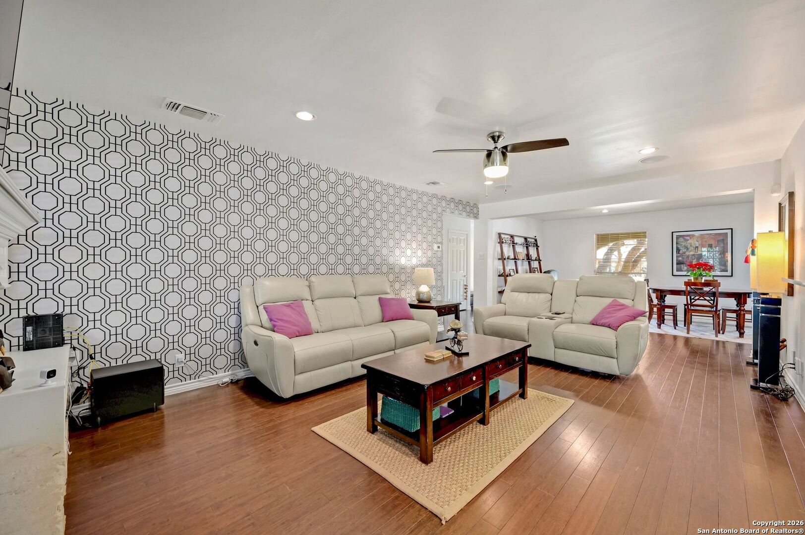 Tastefully updated single-story home in sought-after Hollywood Park, offering the rare combination of meticulous maintenance, a functional layout, and move-in with a spacious, well-maintained backyard. The open floor plan features 4 bedrooms, 2 baths, two living areas, and a separate dining area ideal for both everyday living and entertaining. Recent improvements include fresh interior paint, beautiful wood flooring, and an upgraded kitchen with granite countertops, stainless steel appliances, and a double oven. The expansive backyard includes a covered patio, gazebo, recent landscaping, mature trees that provide shade and privacy, and a full privacy fence with partial new sections. Additional highlights include a two-car garage with ample storage, an outdoor shed, and front and back sprinkler systems.A rare find in Hollywood Park!