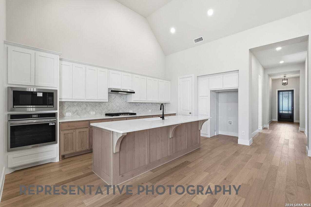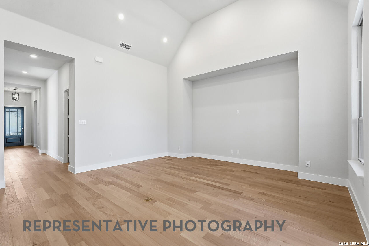 This ONE level home features a home office, fireplace, built in cabinets on each side of Fireplace and upper row of cabinets in Kitchen. This home is located on a Greenbelt. Home under construction with estimated September completion.
