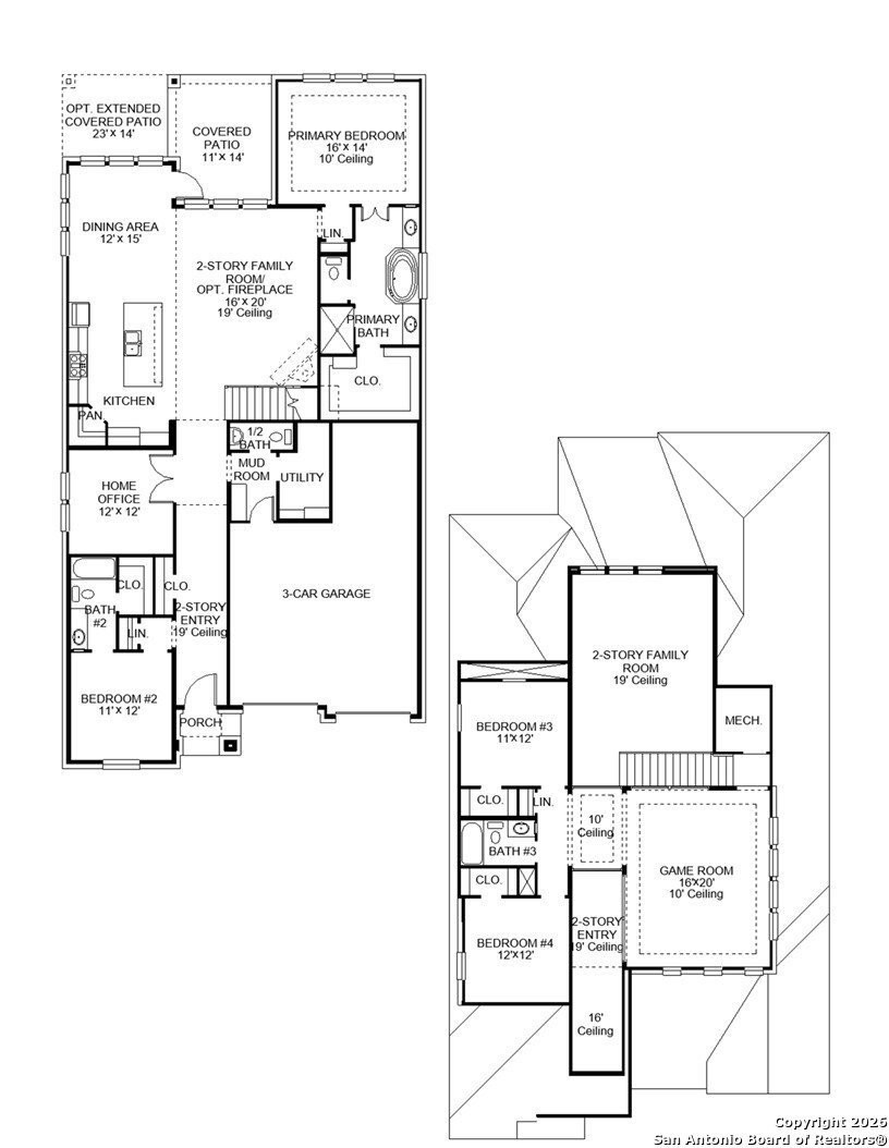 Home office with French doors set along one side of two-story entry. Kitchen and dining area open to two-story family room. Kitchen features corner walk-in pantry, a 5-burner gas cooktop and generous island with built-in seating space. Two-story family room features wall of windows. First-floor primary suite includes bedroom with 10-foot ceiling. Double doors lead to primary bath with dual vanities, freestanding tub, separate glass-enclosed shower and large walk-in closet. First-floor guest suite offers private bath. Game room and two secondary bedrooms are upstairs. Extended covered backyard patio. Mud room off three-car garage.