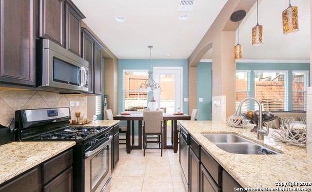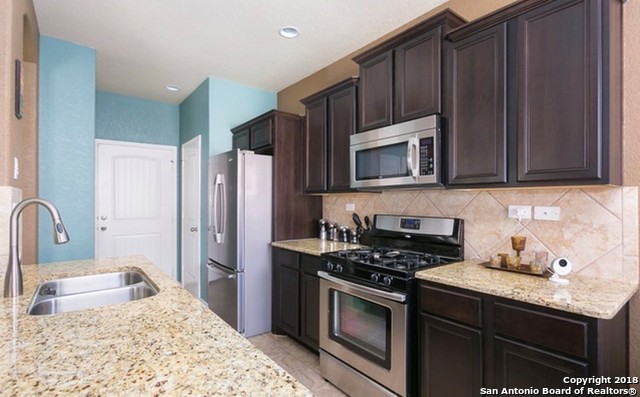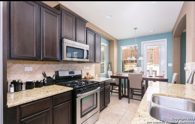 Stone Oak Beauty! Upgrades Galore! Gated Community! This 3 bedroom 2.5 bath home features oversized tile, gas range, granite countertops, stainless steel appliances, custom plantation shutters, crown moulding in family room, iron spindles on staircase, 8' front and rear doors, and upgraded fixtures. Wood deck....bonus room... Too many upgrades to list!