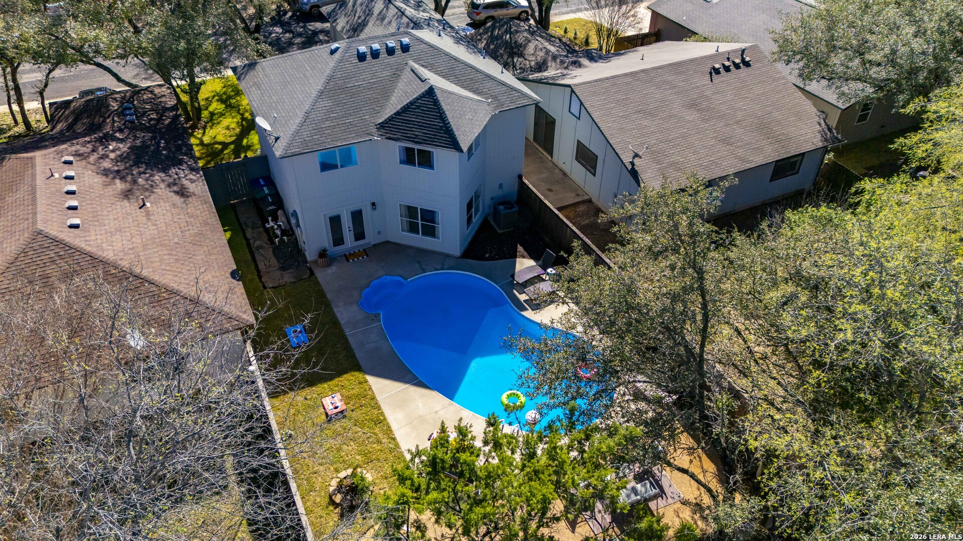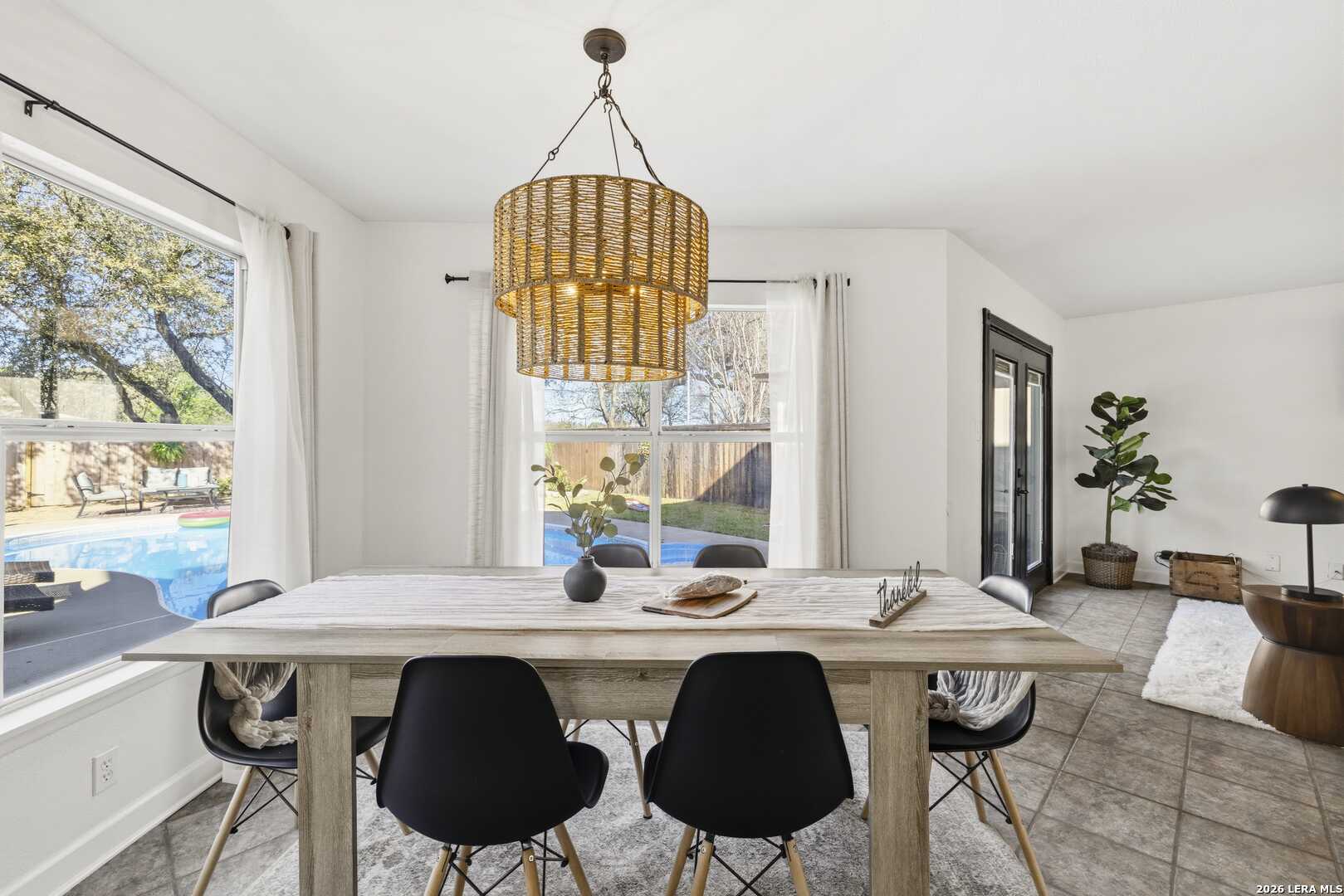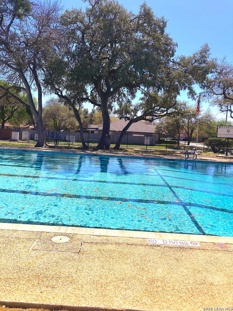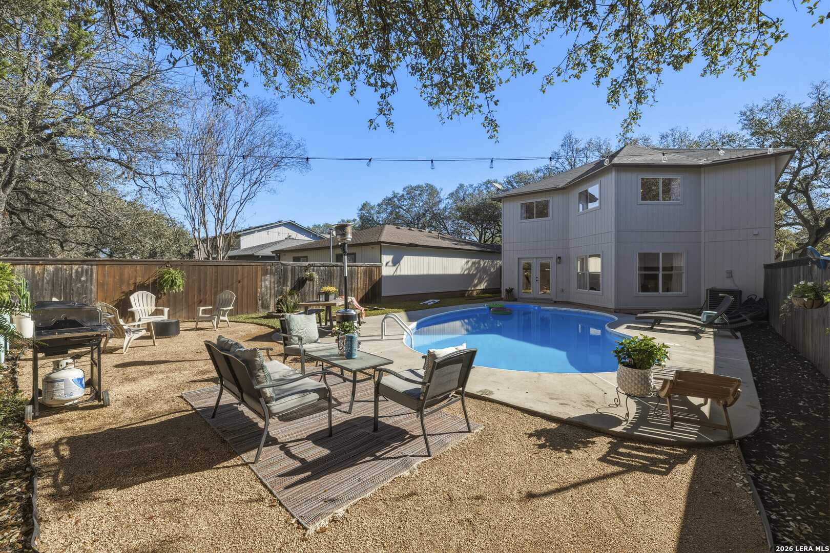 This beautifully updated home offers the perfect blend of comfort, functionality, and inviting outdoor living. Inside, you'll find a spacious dream pantry and laundry room with abundant storage, and large walk-in closets designed to make everyday living effortless. The kitchen showcases new granite countertops, a large farmhouse sink, and freshly updated cabinetry with modern hardware. The open living and dining area overlooks the backyard pool, creating a bright and welcoming space, while the fireplace adds the perfect cozy touch for relaxing evenings. The primary suite is a true retreat, featuring a huge bedroom with plenty of space for a comfortable sitting area or sofa, creating a relaxing private escape at the end of the day. The first floor features easy-to-maintain tile flooring, while the upstairs offers warm and durable luxury wood-look vinyl flooring. Enjoy peace of mind with major recent upgrades, including a brand-new A/C system, new plumbing, a new water heater, updated fixtures, fresh interior and exterior paint, a coated garage floor, and newly installed sod. Step outside to your private, fully fenced backyard retreat. The space features a sparkling swimming pool, crushed granite patio, fire-pit area, mature trees, and charming string lights-perfect for entertaining guests or unwinding under the Texas sky. It's the ideal place to enjoy your morning coffee by the pool or relax in the evening with a glass of wine. A unique highlight is the private backyard gate providing direct access to nearby trails and park amenities, including jogging and walking paths, a sports park, fitness park, playground, and library. The neighborhood also offers wonderful community amenities, including a community pool, playground, picnic area and clubhouse, all just a short walk away. Conveniently located near UTSA, Valero, The Rim, USAA, LaCantera and the Medical Center and surrounded by shopping, dining, and recreation, this home offers both tranquility and easy access to everything the area has to offer.