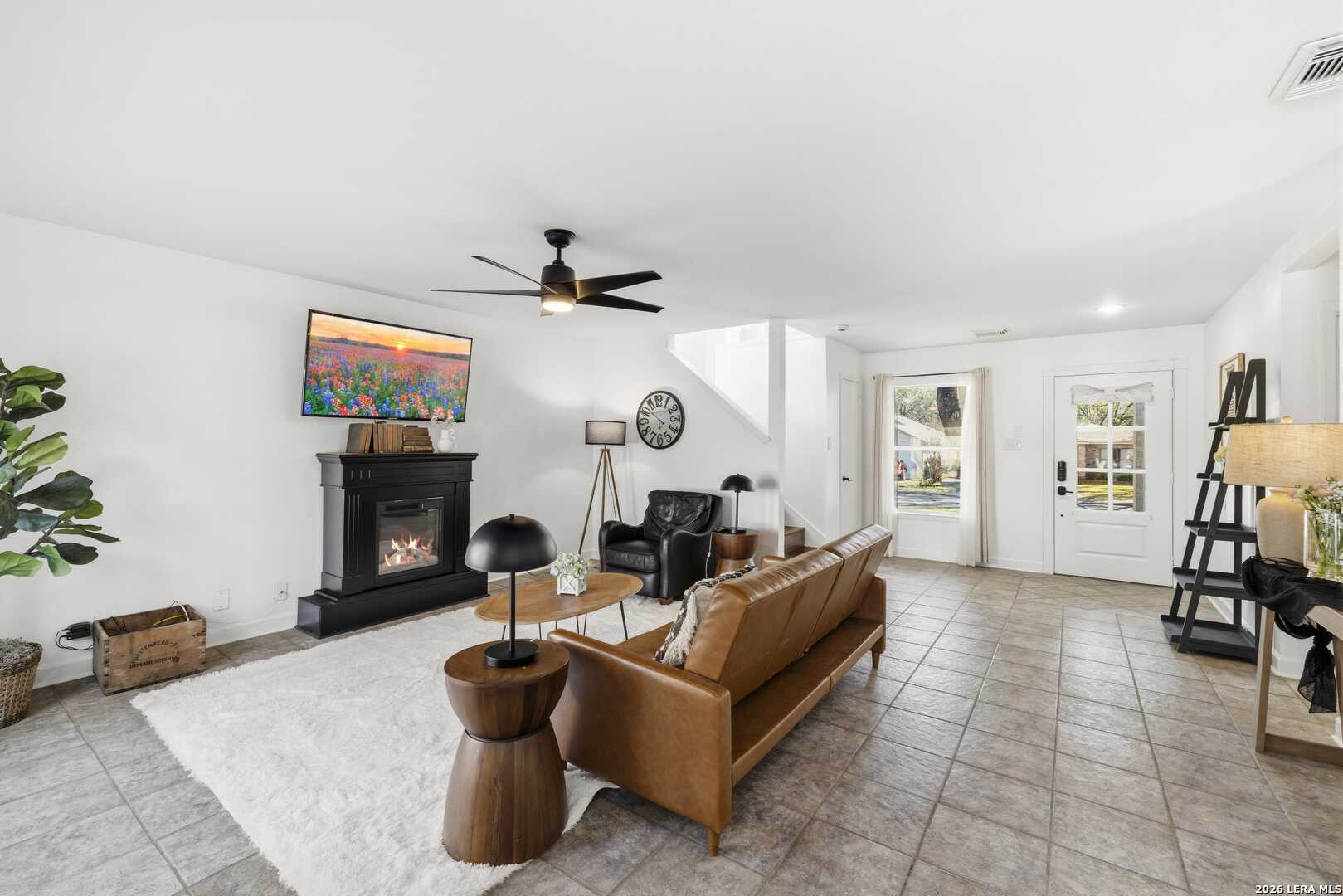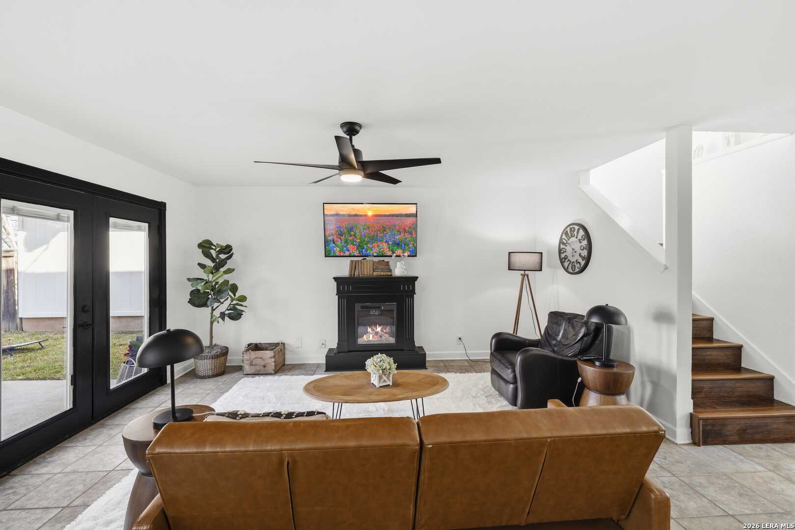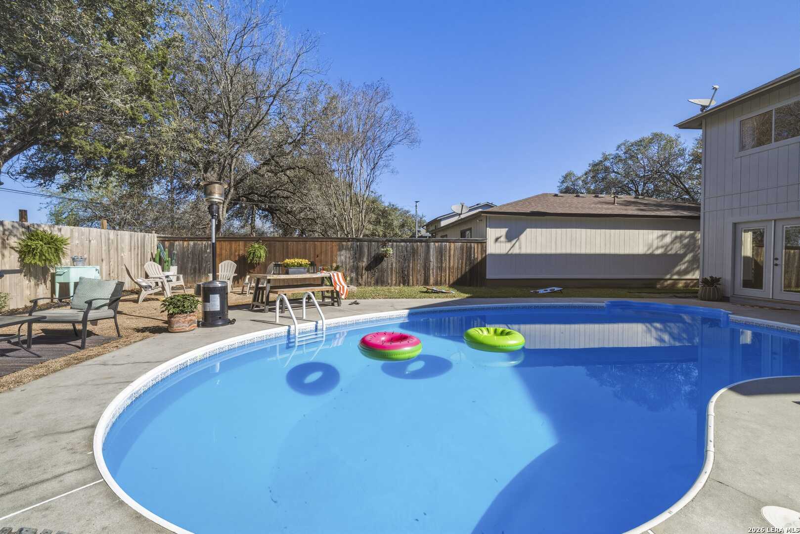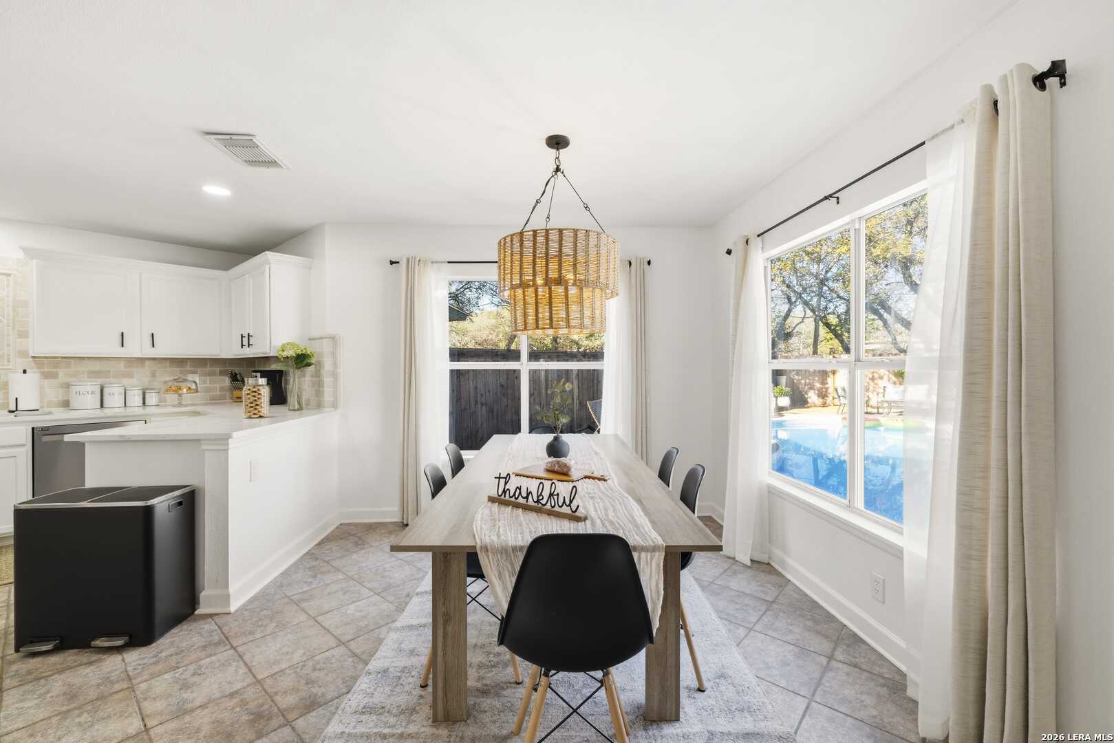 This beautifully updated home offers the perfect blend of comfort, functionality, and inviting outdoor living. Inside, you'll find a spacious dream pantry and laundry room with abundant storage, and large walk-in closets designed to make everyday living effortless. The kitchen showcases new granite countertops, a large farmhouse sink, and freshly updated cabinetry with modern hardware. The open living and dining area overlooks the backyard pool, creating a bright and welcoming space, while the fireplace adds the perfect cozy touch for relaxing evenings. The primary suite is a true retreat, featuring a huge bedroom with plenty of space for a comfortable sitting area or sofa, creating a relaxing private escape at the end of the day. The first floor features easy-to-maintain tile flooring, while the upstairs offers warm and durable luxury wood-look vinyl flooring. Enjoy peace of mind with major recent upgrades, including a brand-new A/C system, new plumbing, a new water heater, updated fixtures, fresh interior and exterior paint, a coated garage floor, and newly installed sod. Step outside to your private, fully fenced backyard retreat. The space features a sparkling swimming pool, crushed granite patio, fire-pit area, mature trees, and charming string lights-perfect for entertaining guests or unwinding under the Texas sky. It's the ideal place to enjoy your morning coffee by the pool or relax in the evening with a glass of wine. A unique highlight is the private backyard gate providing direct access to nearby trails and park amenities, including jogging and walking paths, a sports park, fitness park, playground, and library. The neighborhood also offers wonderful community amenities, including a community pool, playground, picnic area and clubhouse, all just a short walk away. Conveniently located near UTSA, Valero, The Rim, USAA, LaCantera and the Medical Center and surrounded by shopping, dining, and recreation, this home offers both tranquility and easy access to everything the area has to offer.