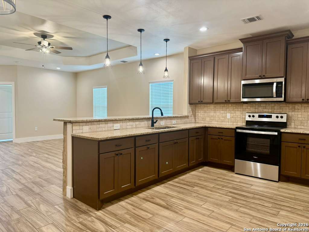 Experience Modern Country Living. This stunning, custom-built 4-bedroom ranch combines the serenity of rural life with the polished finish of a luxury home. Nestled on a fully fenced 1-acre lot, this property offers unparalleled privacy and "room to breathe" just minutes from city amenities. Inside, the open-concept design is anchored by premium vinyl flooring and a gourmet kitchen featuring stainless steel appliances and a magnificent stone-accented breakfast bar. The primary retreat is a true sanctuary, boasting a spacious walk-in closet and a sleek, modern stand-up shower. With a full-sized washer and dryer included and a gorgeous stone facade that curb appeal dreams are made of, this move-in-ready gem is perfect for those who value quality craftsmanship and wide-open views.