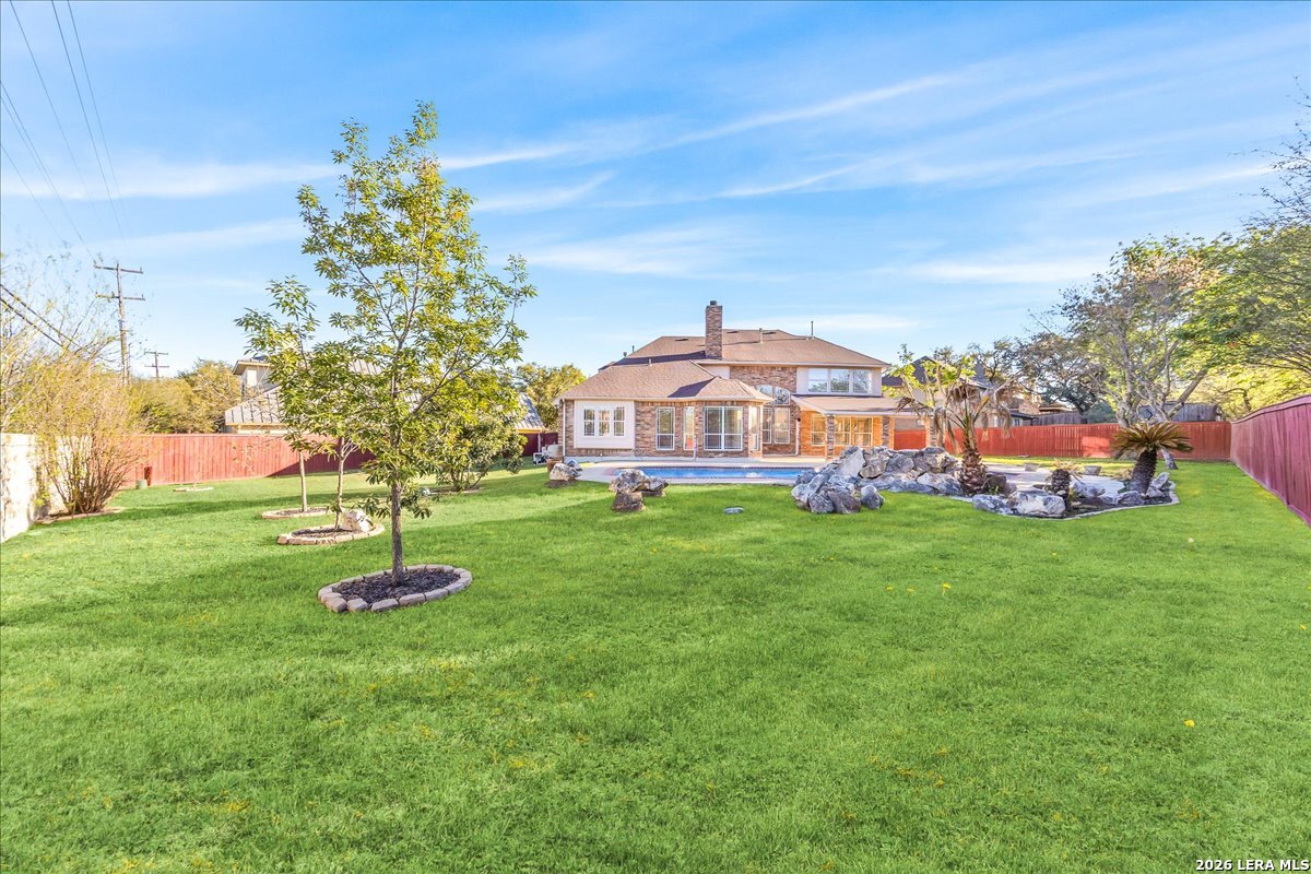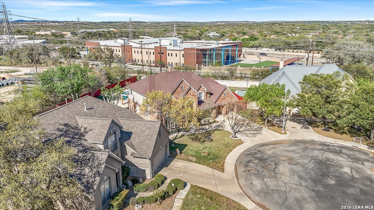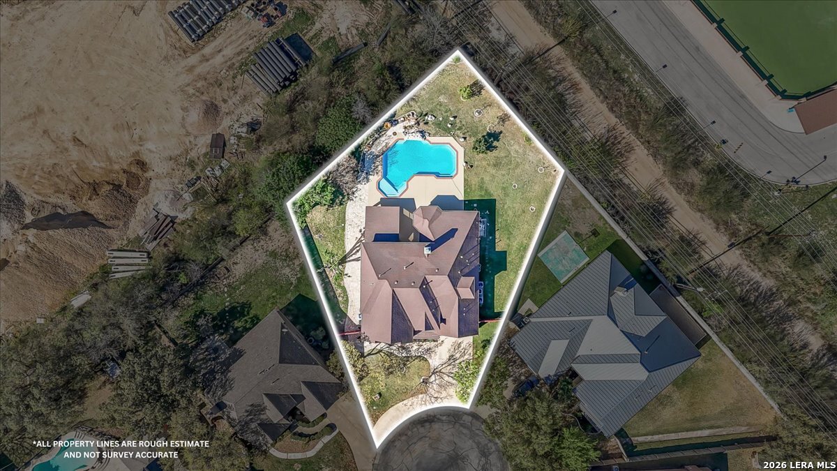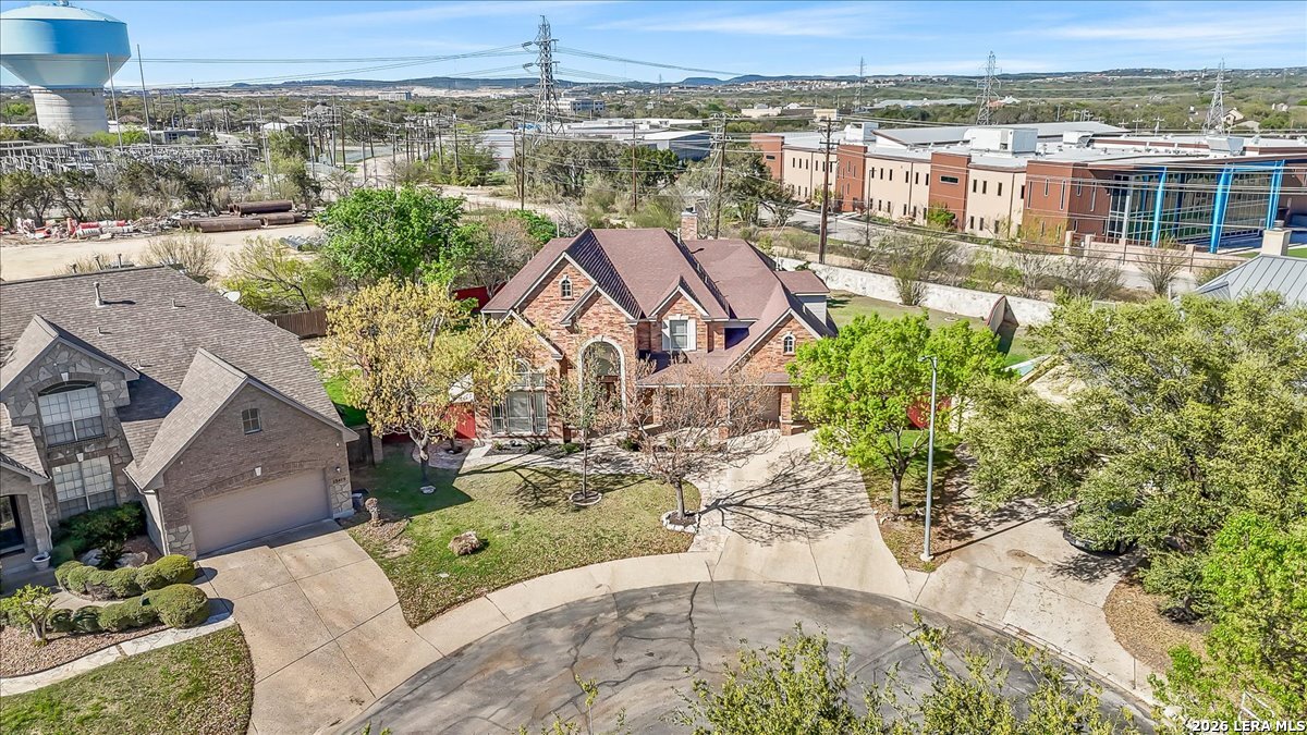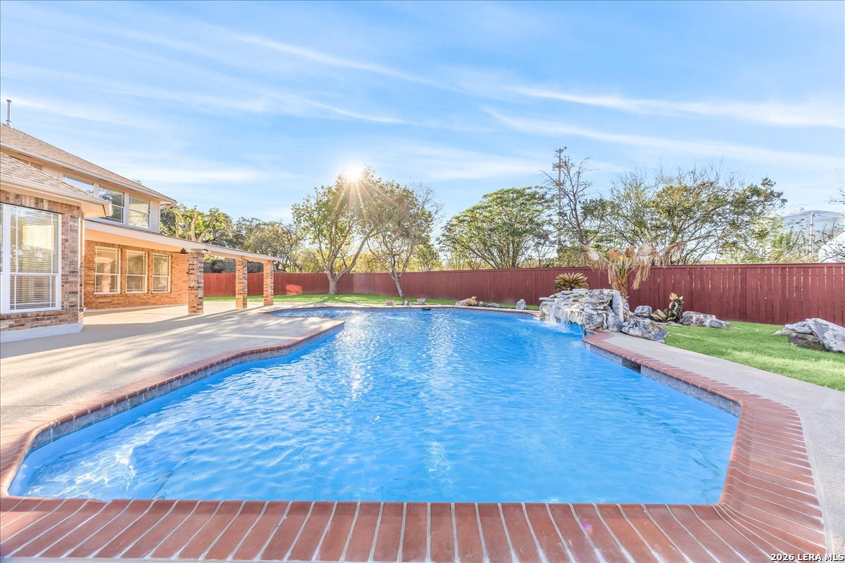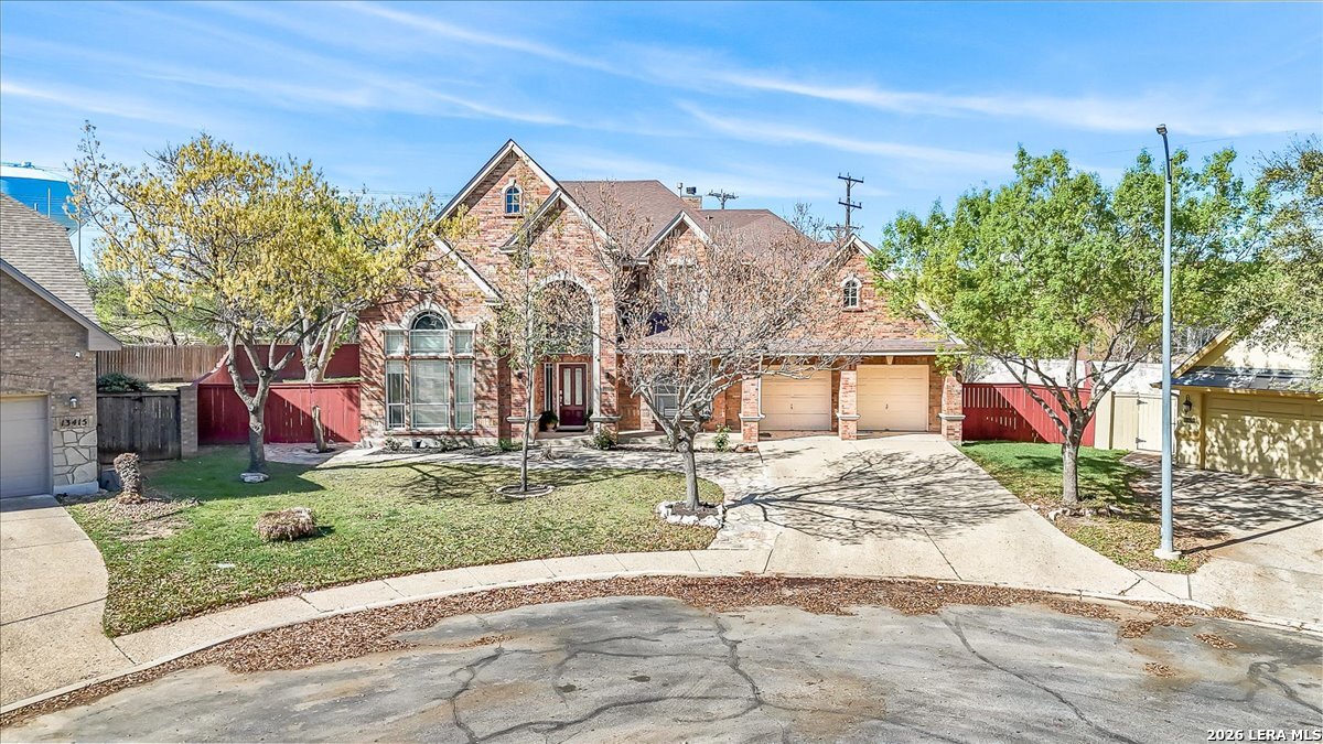 Rare opportunity to own a spacious two-story home with over 3,900 square feet, located on a quiet cul-de-sac and sitting on an oversized .32+ acre lot in Shavano Heights. Fresh interior paint and wood and tile flooring throughout (no carpet) make this home move-in ready while still offering plenty of opportunity to make it your own. The main level features a large living and dining room, a private office with French doors, and a spacious family room with high ceilings and a cozy fireplace that opens to the kitchen. The kitchen includes a large island with breakfast bar, abundant counter space, and a separate eat-in area. The downstairs primary suite offers plenty of space with a sitting area, along with a large bathroom featuring two separate vanities, a garden tub, separate shower, and an expansive walk-in closet. A half bath, laundry room, and separate storage room are also located on the main level. Upstairs, two bedrooms share a Jack-and-Jill bathroom with separate vanities. Across an open walkway overlooking the living space below is another bedroom, a full hall bath, and an additional flexible room that could serve as a game room, media room, or fifth bedroom. Step outside to enjoy the large backyard featuring a sparkling pool with waterfall, covered patio, and plenty of yard space for outdoor activities. Located within highly regarded schools and offering convenient access to Loop 1604, I-10, Highway 281, the South Texas Medical Center, UTSA, and shopping and dining at The Shops at La Cantera. Homes with this much space, a pool, and a large cul-de-sac lot don't come along often-come take a look and see the possibilities for yourself.