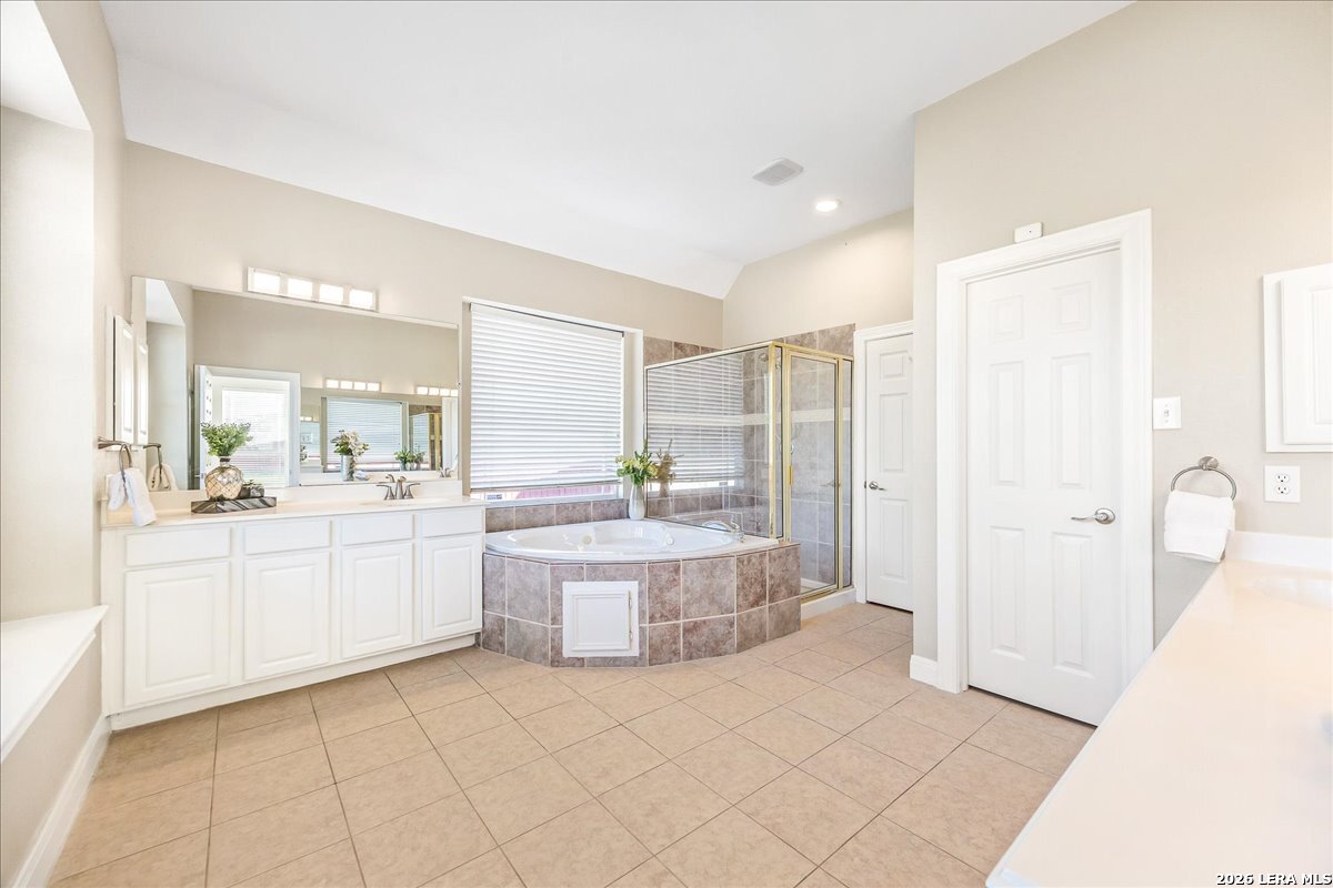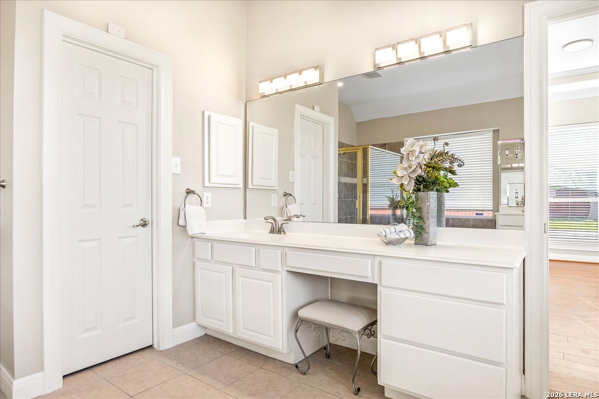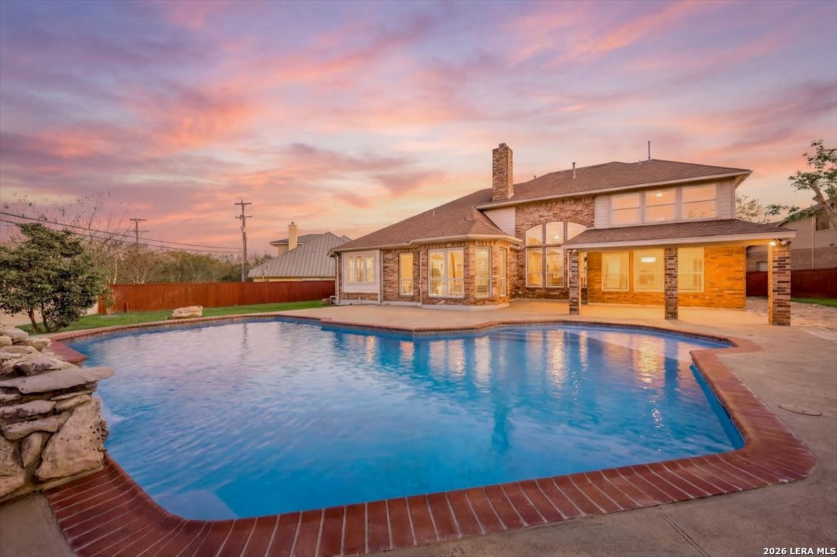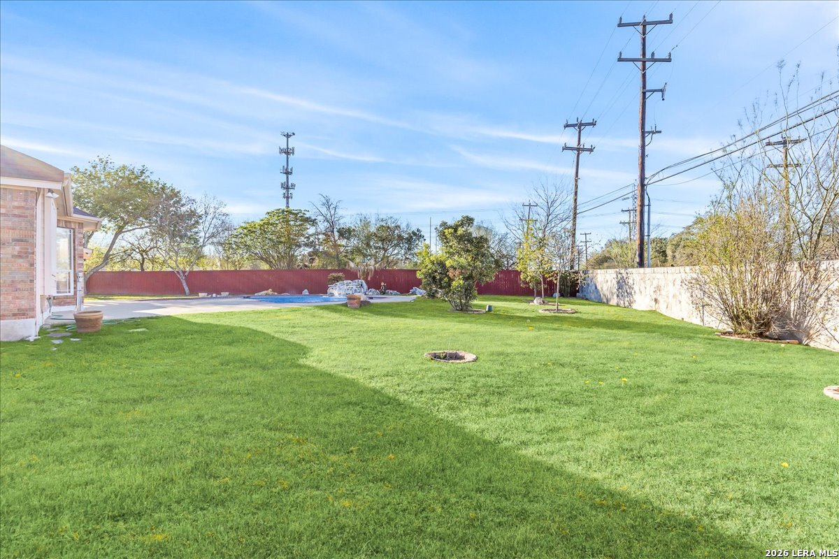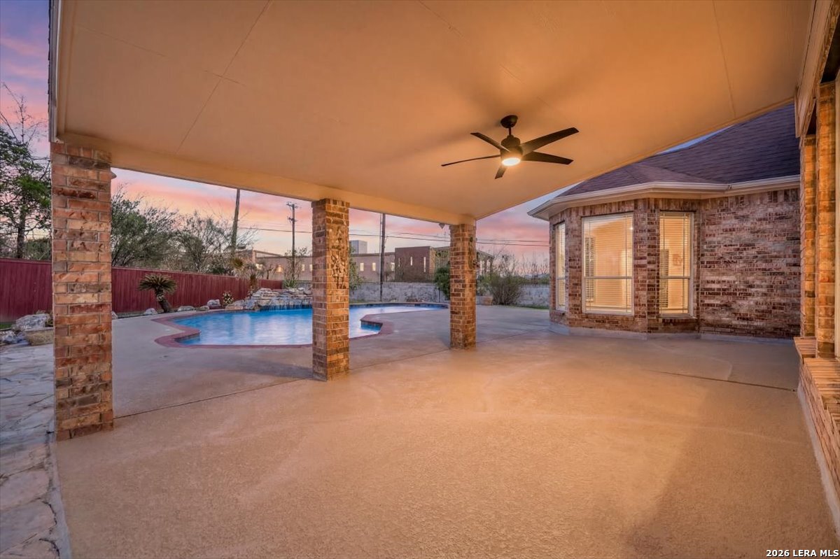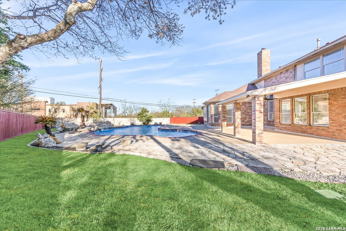 Rare opportunity to own a spacious two-story home with over 3,900 square feet, located on a quiet cul-de-sac and sitting on an oversized .32+ acre lot in Shavano Heights. Fresh interior paint and wood and tile flooring throughout (no carpet) make this home move-in ready while still offering plenty of opportunity to make it your own. The main level features a large living and dining room, a private office with French doors, and a spacious family room with high ceilings and a cozy fireplace that opens to the kitchen. The kitchen includes a large island with breakfast bar, abundant counter space, and a separate eat-in area. The downstairs primary suite offers plenty of space with a sitting area, along with a large bathroom featuring two separate vanities, a garden tub, separate shower, and an expansive walk-in closet. A half bath, laundry room, and separate storage room are also located on the main level. Upstairs, two bedrooms share a Jack-and-Jill bathroom with separate vanities. Across an open walkway overlooking the living space below is another bedroom, a full hall bath, and an additional flexible room that could serve as a game room, media room, or fifth bedroom. Step outside to enjoy the large backyard featuring a sparkling pool with waterfall, covered patio, and plenty of yard space for outdoor activities. Located within highly regarded schools and offering convenient access to Loop 1604, I-10, Highway 281, the South Texas Medical Center, UTSA, and shopping and dining at The Shops at La Cantera. Homes with this much space, a pool, and a large cul-de-sac lot don't come along often-come take a look and see the possibilities for yourself.