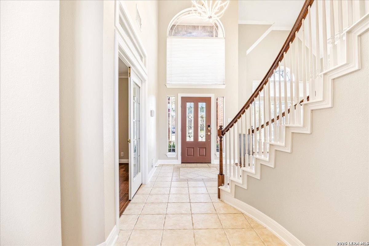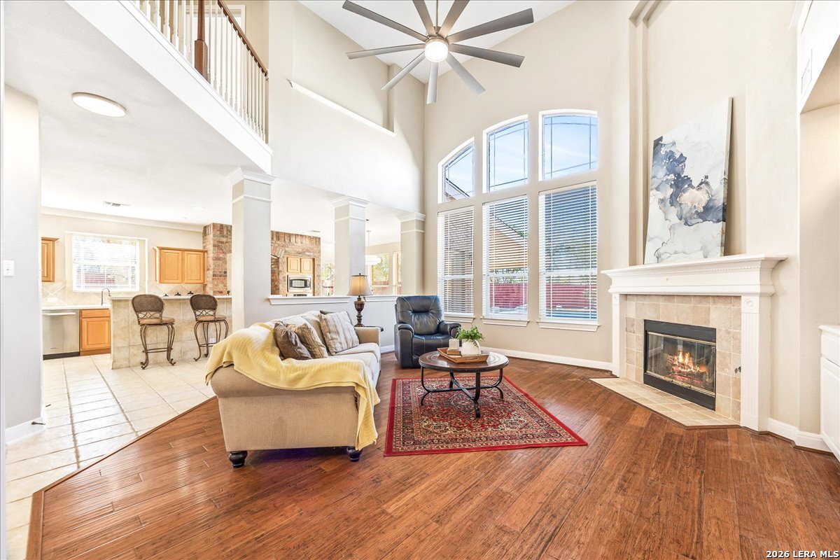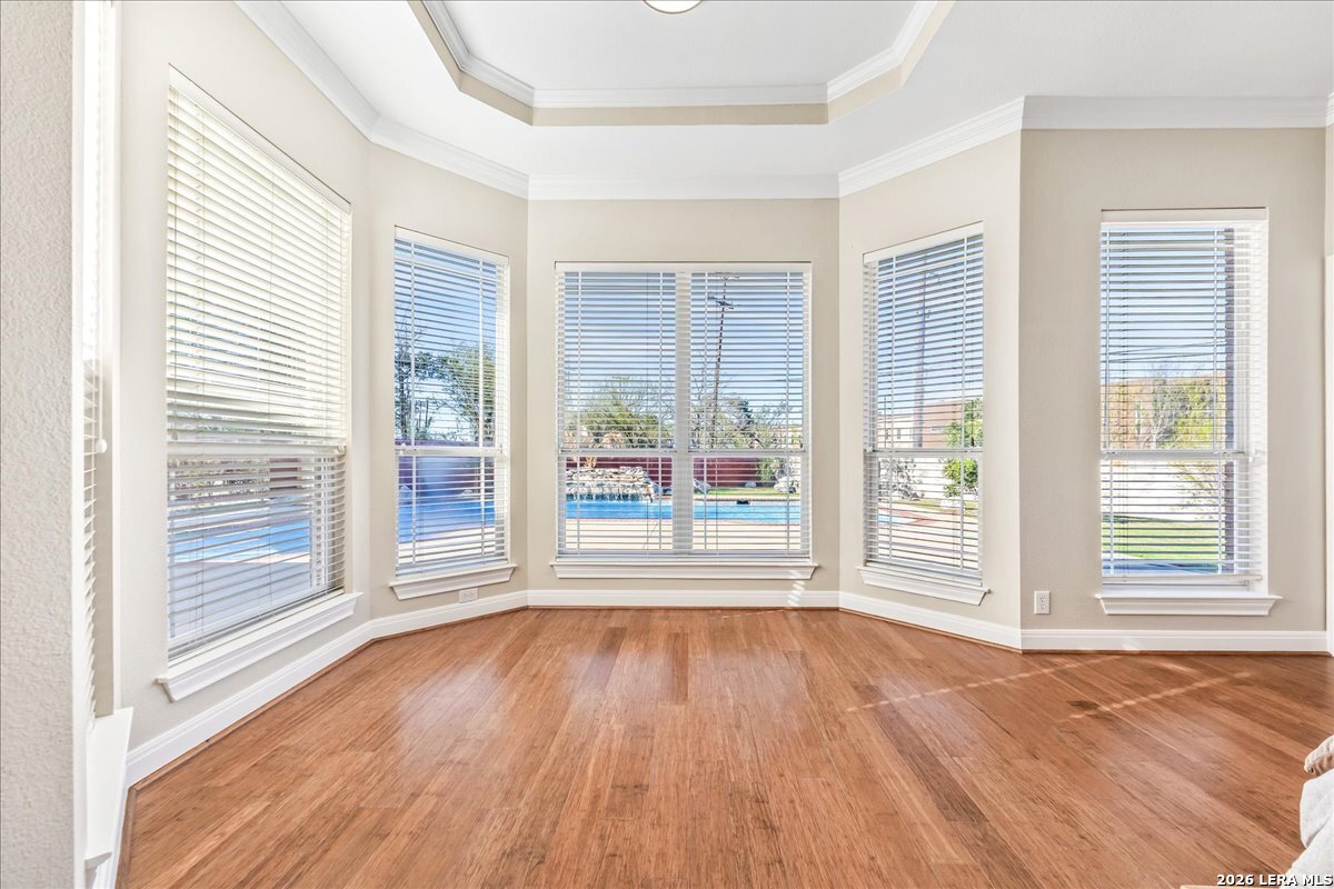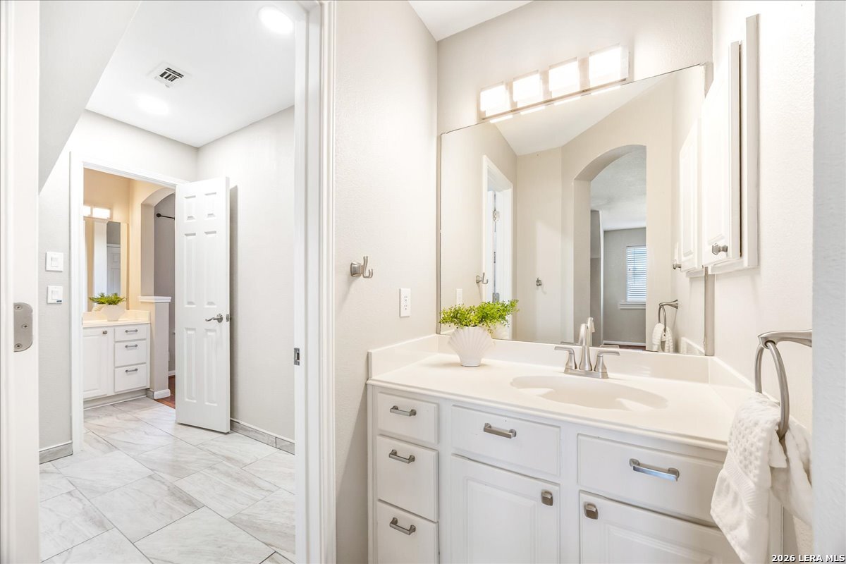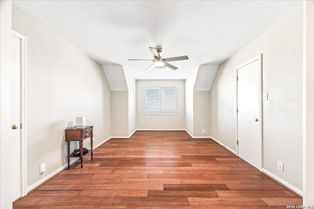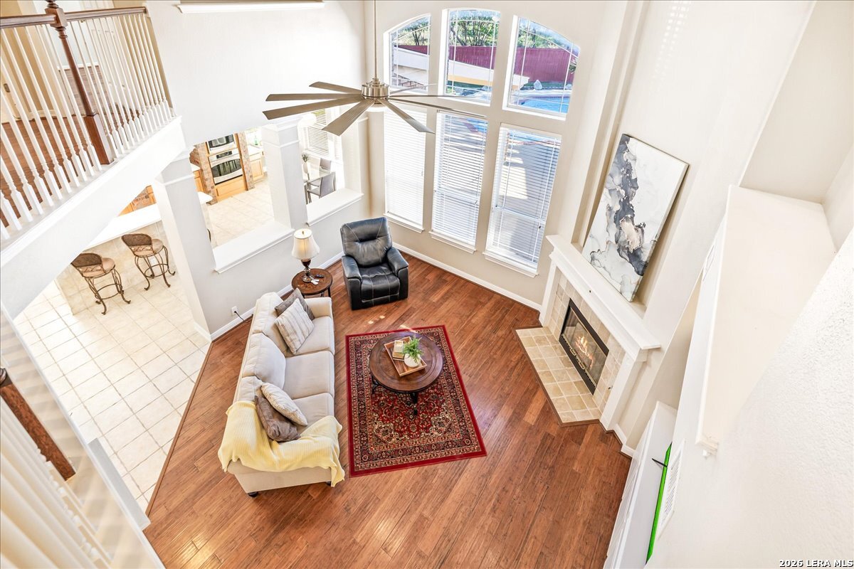 Rare opportunity to own a spacious two-story home with over 3,900 square feet, located on a quiet cul-de-sac and sitting on an oversized .32+ acre lot in Shavano Heights. Fresh interior paint and wood and tile flooring throughout (no carpet) make this home move-in ready while still offering plenty of opportunity to make it your own. The main level features a large living and dining room, a private office with French doors, and a spacious family room with high ceilings and a cozy fireplace that opens to the kitchen. The kitchen includes a large island with breakfast bar, abundant counter space, and a separate eat-in area. The downstairs primary suite offers plenty of space with a sitting area, along with a large bathroom featuring two separate vanities, a garden tub, separate shower, and an expansive walk-in closet. A half bath, laundry room, and separate storage room are also located on the main level. Upstairs, two bedrooms share a Jack-and-Jill bathroom with separate vanities. Across an open walkway overlooking the living space below is another bedroom, a full hall bath, and an additional flexible room that could serve as a game room, media room, or fifth bedroom. Step outside to enjoy the large backyard featuring a sparkling pool with waterfall, covered patio, and plenty of yard space for outdoor activities. Located within highly regarded schools and offering convenient access to Loop 1604, I-10, Highway 281, the South Texas Medical Center, UTSA, and shopping and dining at The Shops at La Cantera. Homes with this much space, a pool, and a large cul-de-sac lot don't come along often-come take a look and see the possibilities for yourself.
