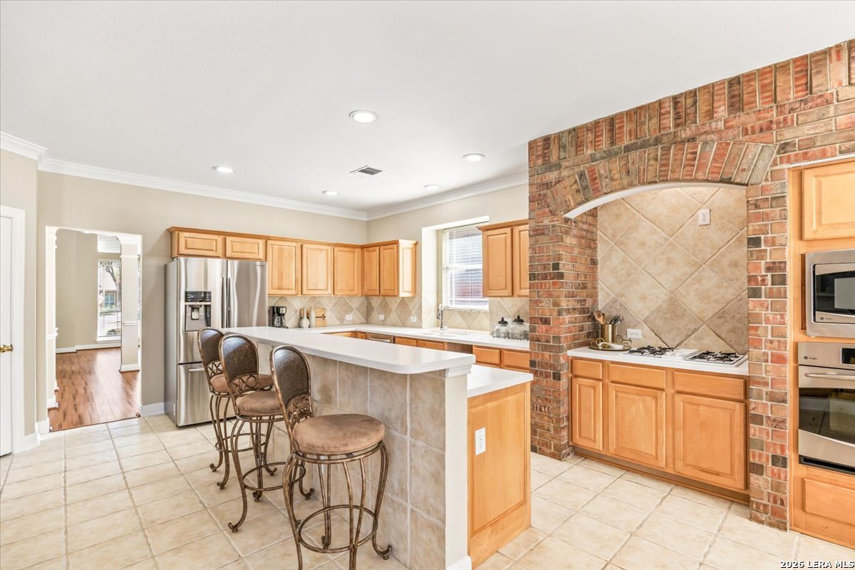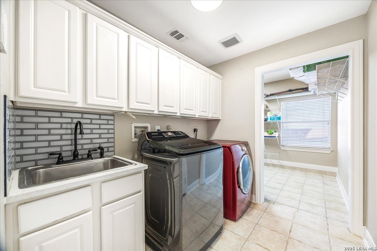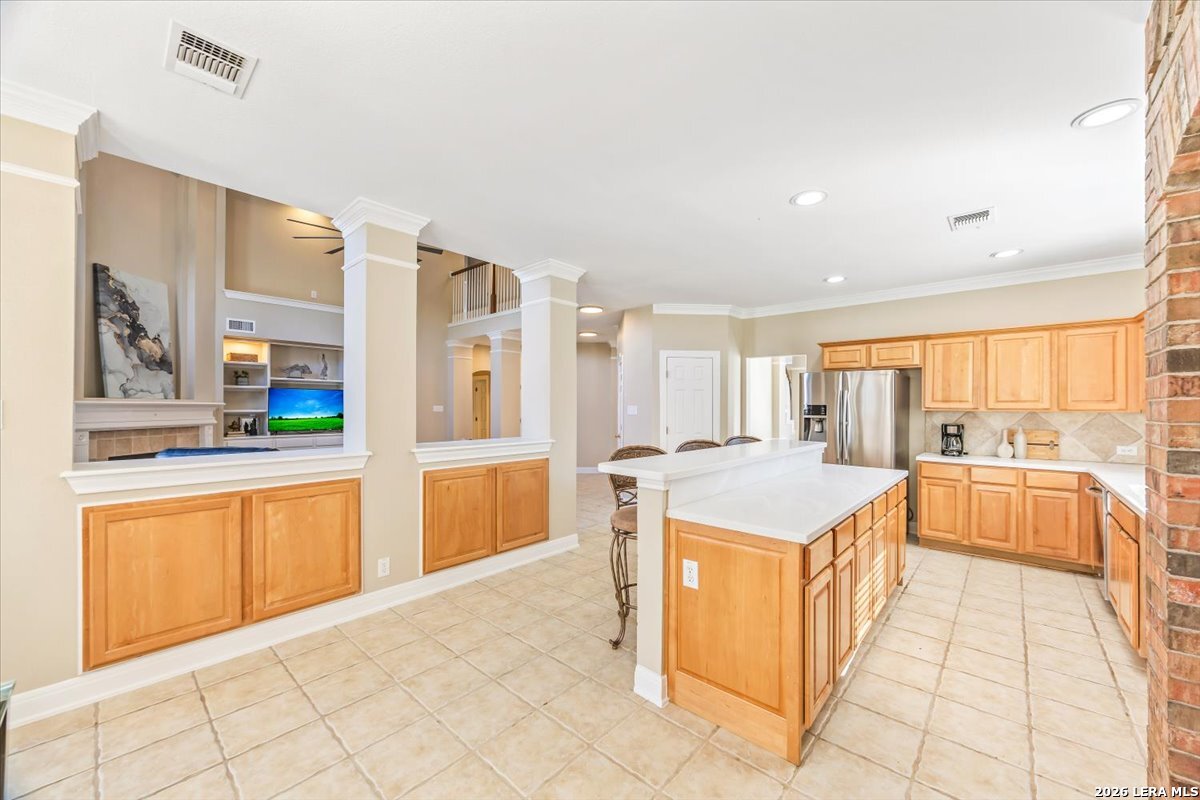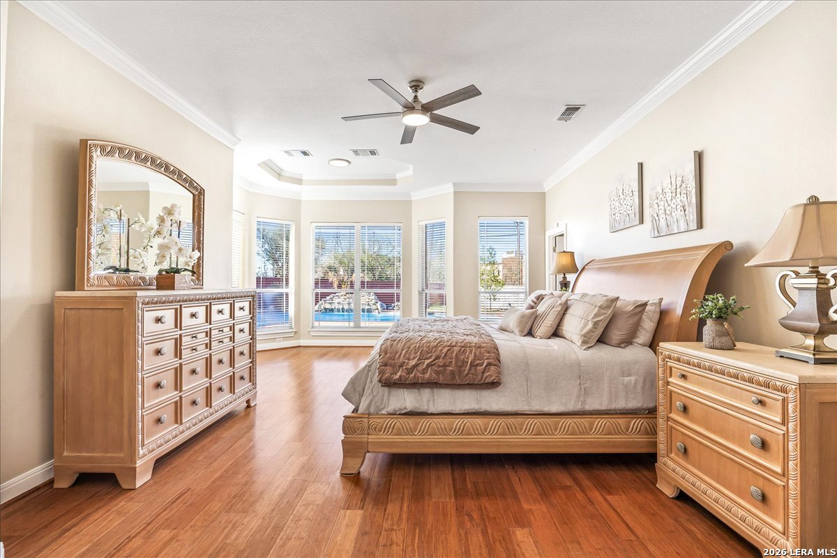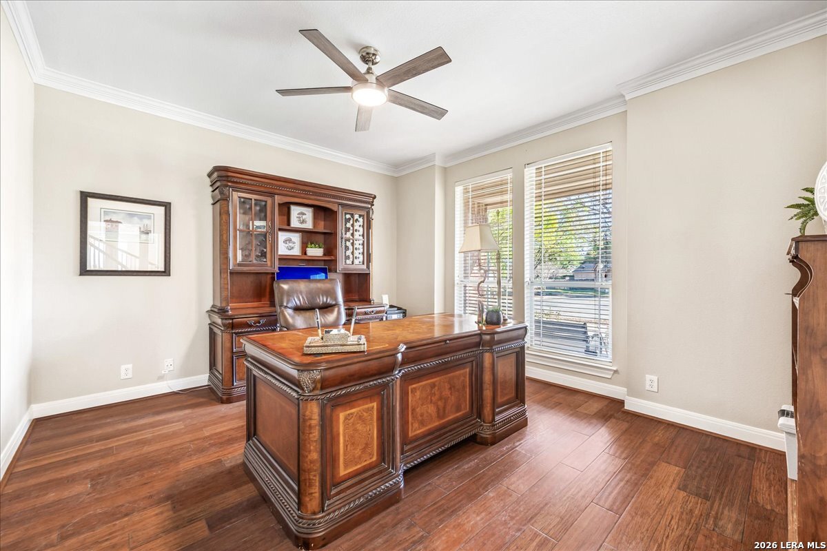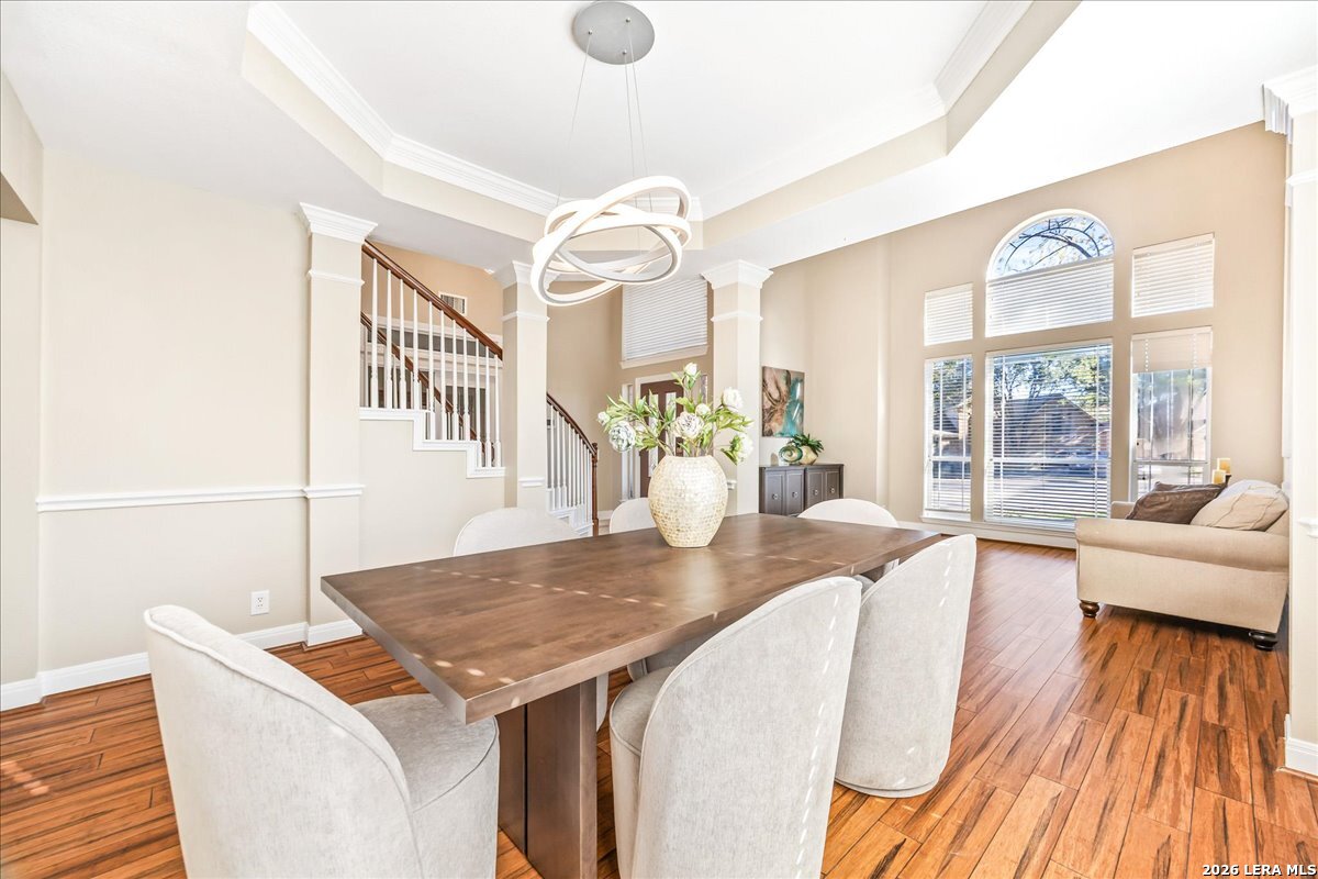 Rare opportunity to own a spacious two-story home with over 3,900 square feet, located on a quiet cul-de-sac and sitting on an oversized .32+ acre lot in Shavano Heights. Fresh interior paint and wood and tile flooring throughout (no carpet) make this home move-in ready while still offering plenty of opportunity to make it your own. The main level features a large living and dining room, a private office with French doors, and a spacious family room with high ceilings and a cozy fireplace that opens to the kitchen. The kitchen includes a large island with breakfast bar, abundant counter space, and a separate eat-in area. The downstairs primary suite offers plenty of space with a sitting area, along with a large bathroom featuring two separate vanities, a garden tub, separate shower, and an expansive walk-in closet. A half bath, laundry room, and separate storage room are also located on the main level. Upstairs, two bedrooms share a Jack-and-Jill bathroom with separate vanities. Across an open walkway overlooking the living space below is another bedroom, a full hall bath, and an additional flexible room that could serve as a game room, media room, or fifth bedroom. Step outside to enjoy the large backyard featuring a sparkling pool with waterfall, covered patio, and plenty of yard space for outdoor activities. Located within highly regarded schools and offering convenient access to Loop 1604, I-10, Highway 281, the South Texas Medical Center, UTSA, and shopping and dining at The Shops at La Cantera. Homes with this much space, a pool, and a large cul-de-sac lot don't come along often-come take a look and see the possibilities for yourself.