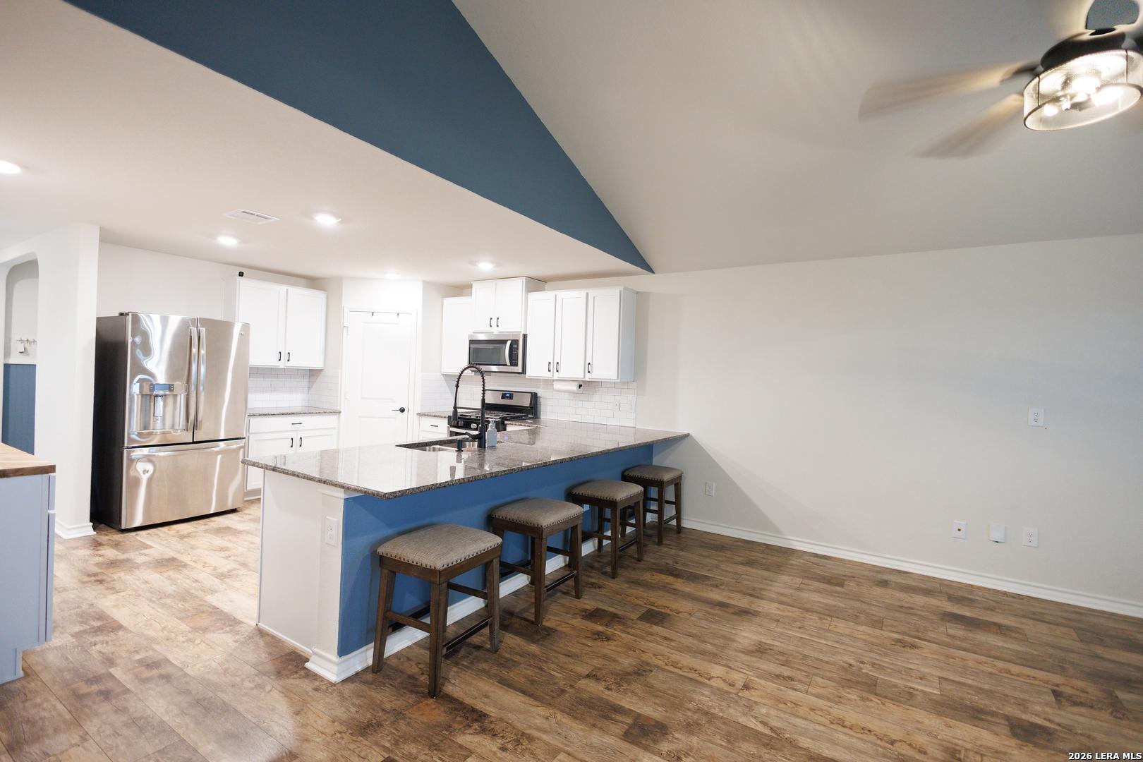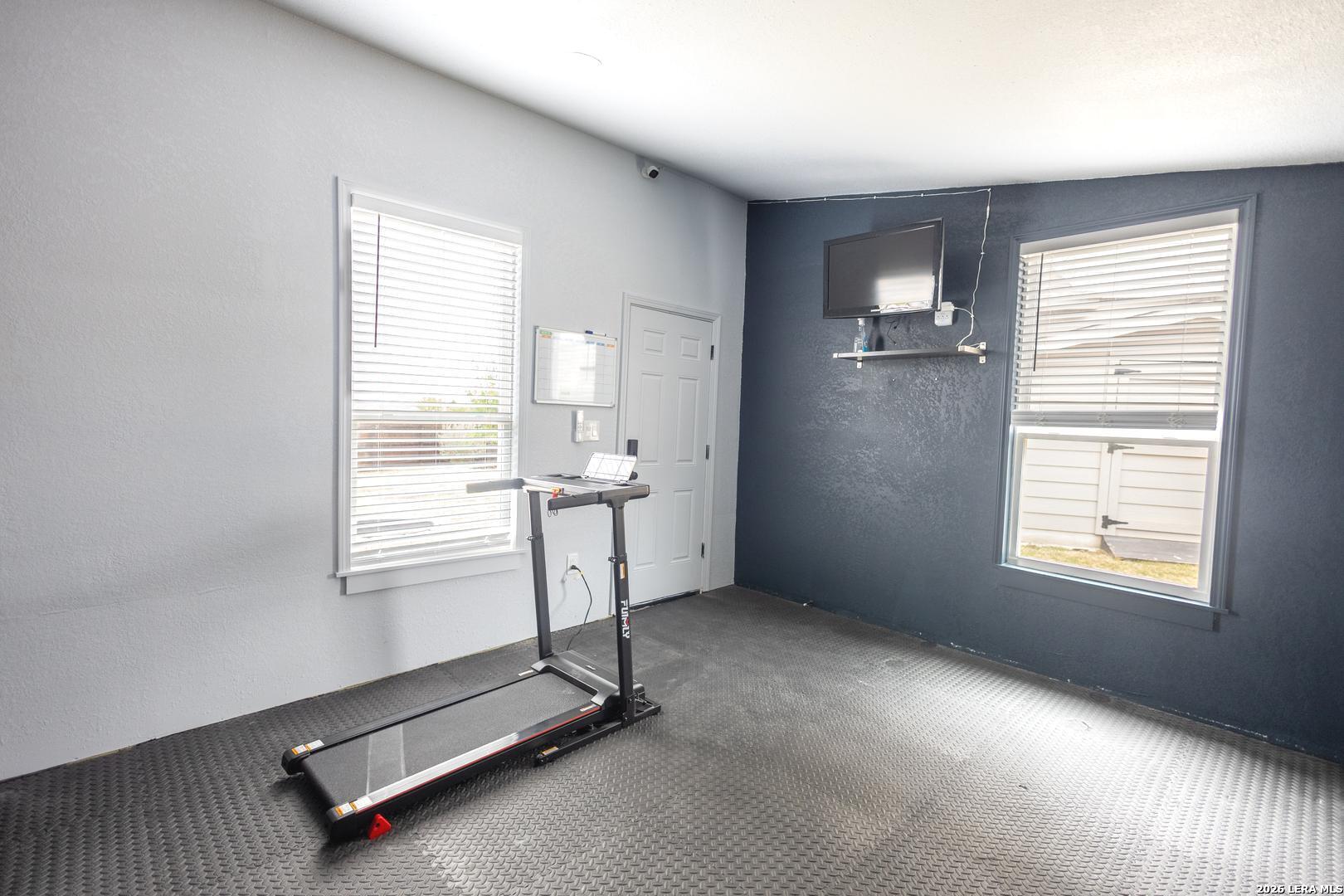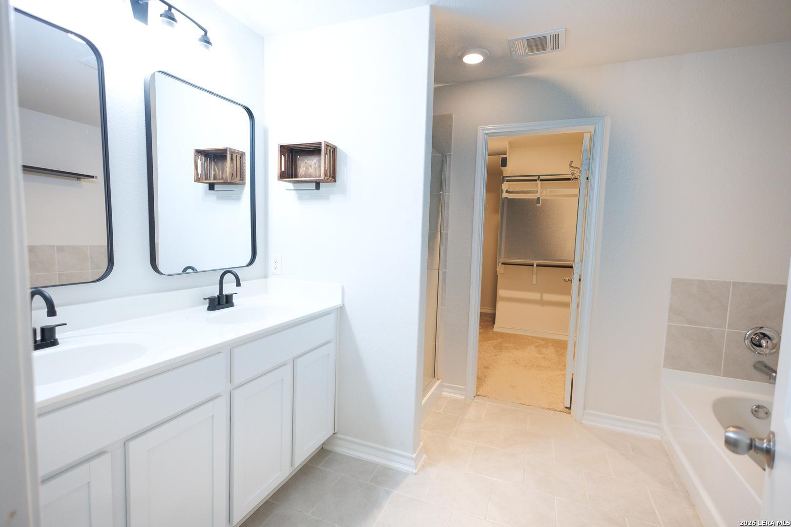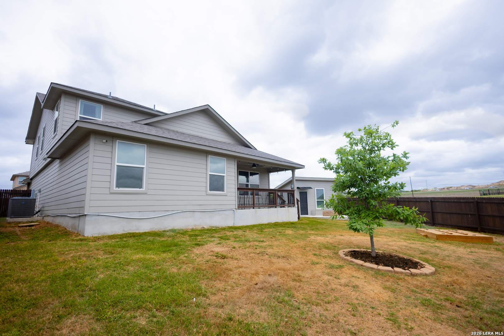 Welcome to this beautifully designed 4 bedroom 2.5 bath home located in the desirable Whisper Falls Subdivision in San Antonio - off Hwy 90 near Castroville. This spacious two-story home is located on a cul-de-sac and is also on a greenbelt! It offers an open and functional layout perfect for modern living. The kitchen is a true highlight, featuring stainless steel appliances, a dedicated coffee bar area, a large pantry and a over-sized counter to area perfect for serving and/or a eat in kitchen area that opens up to a spacious living room - perfect for entertaining! The primary suite is located on the main floor and offers a private retreat with a generous layout, dual sinks, a separate shower and soaking tub, and an expansive walk-in closet. Upstairs, you'll find a large second living area, perfect for a game room or media space, along with 3 additional bedrooms and second full bath. Additional features include an upgraded laundry room with additional cabinetry and storage. Outside you have a large privacy fenced back yard, up-graded covered patio with seating and TV hook-up - detached work out room with AC, patio slab with Fire Pit- also an additional storage shed with Electric! This home combines comfort, space, and thoughtful upgrades, a great location close to neighborhood pool and park - don't miss this opportunity to make it yours!