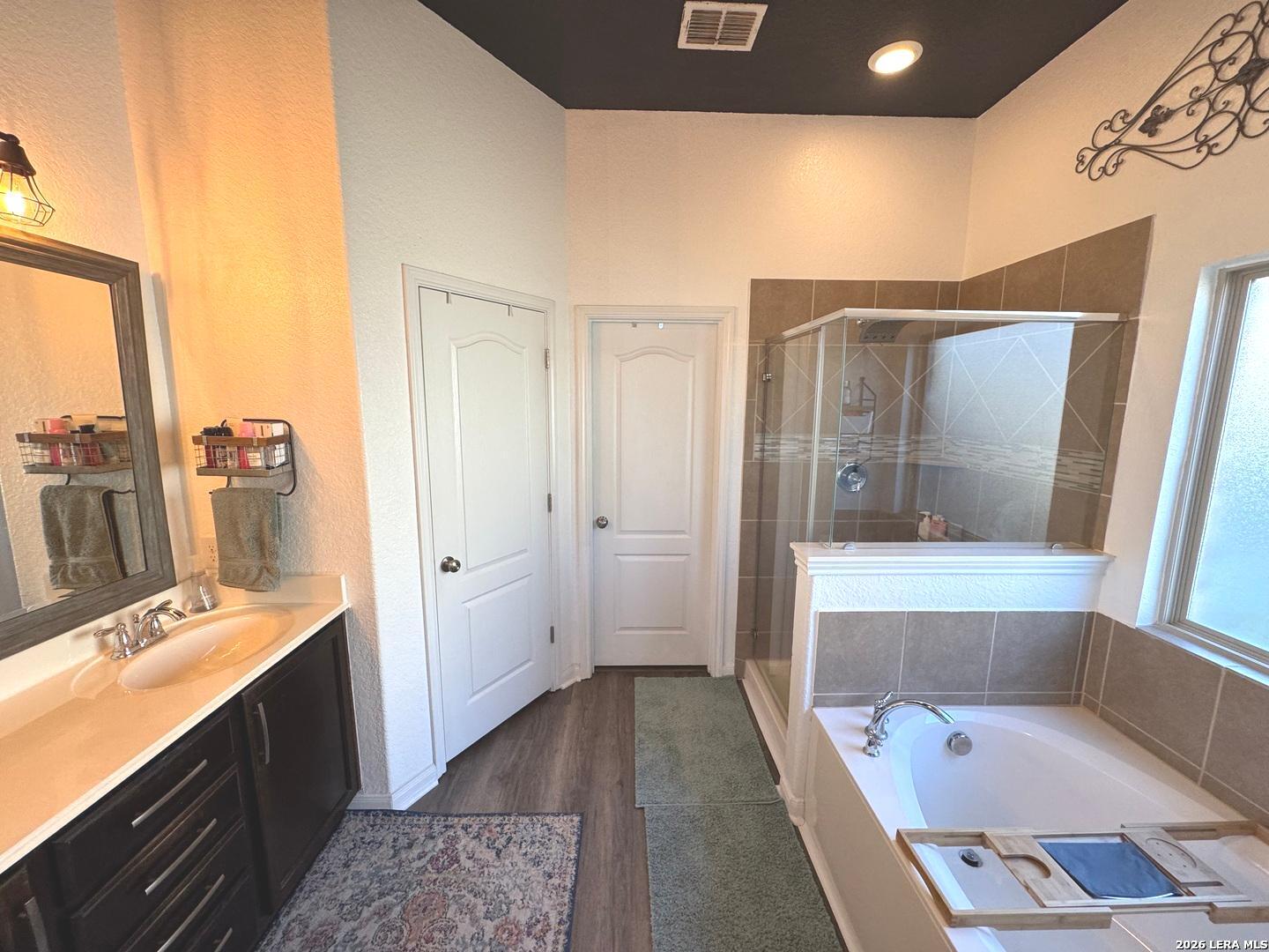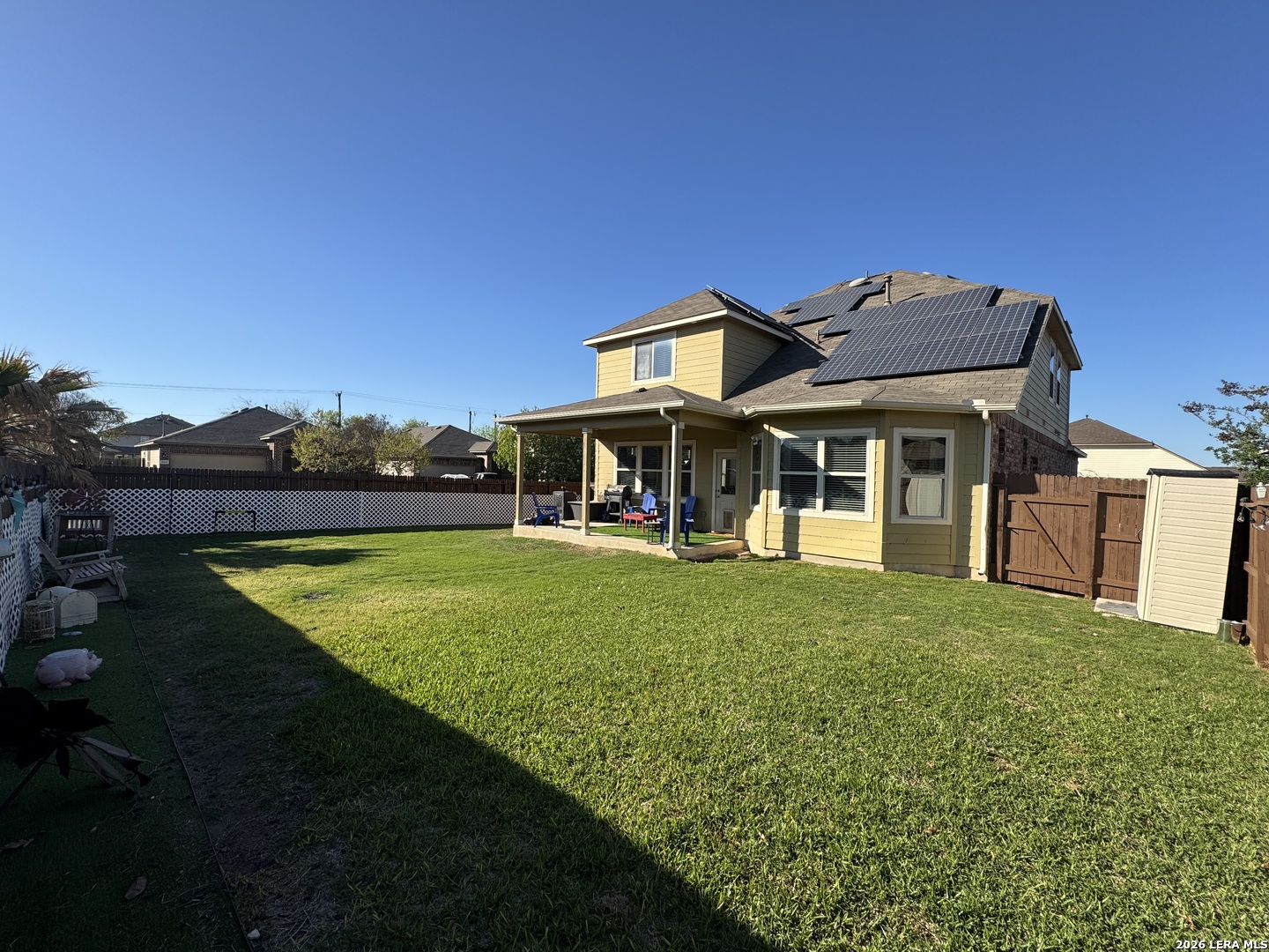 Welcome to this spacious two-story home, perfectly situated on a large corner lot and designed with energy efficiency in mind-complete with moneysaving solar panels. From the moment you step inside, you're greeted by an inviting atmosphere and a layout that simply makes sense. The open concept floor plan seamlessly connects the bright living and dining areas to a chef's kitchen featuring granite countertops, a generous island, gas stove, and abundant cabinetry-ideal for both entertaining and everyday living. The downstairs primary suite offers comfort and convenience with a sizable walk-in closet, ample shelving, and a bathroom complete with dual sinks, granite vanity, walk-in shower, and separate soaking tub. Upstairs, newly installed durable LVP flooring with a lifetime transferable warranty. Remaining three bedrooms, and additional living area are all located on the second level. Upgrades include a widened driveway and several concrete slabs perfect for a shed, grill, or trash bins. Step outside to a covered patio overlooking an oversized backyard, with a dog run, an ideal space for play, gardening, or even a future pool. This home blends style, comfort, and thoughtful updates, offering peace of mind and room to grow.