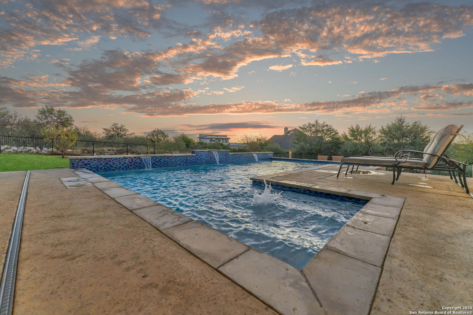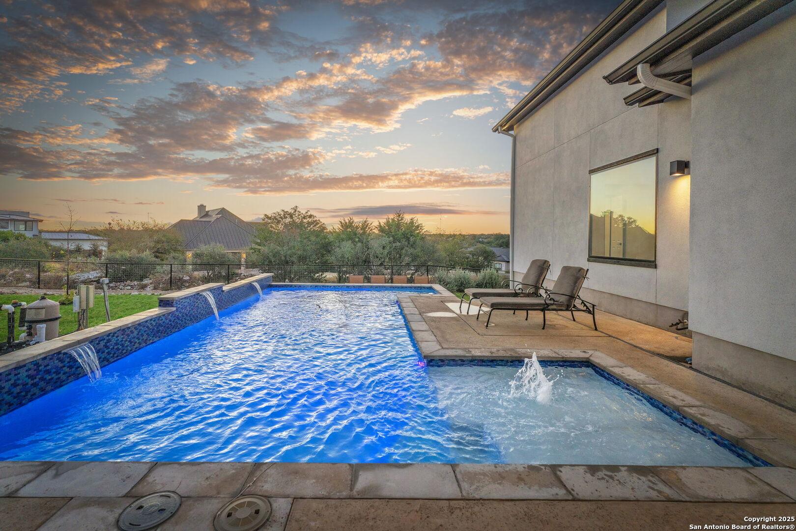Discover the perfect blend of sophistication and Hill Country charm at 1347 Bordeaux Lane, an exquisite custom home nestled in the prestigious Vintage Oaks community of New Braunfels, Texas. Built in 2022 by CKC Customs, this property offers resort-style living on 1.5 acres, 4 bedrooms, 4 baths, 3-car garage with a private pool, hot tub, and exceptional outdoor entertaining space. Step inside and experience open-concept living with soaring high ceilings, natural light, and premium finishes throughout. The heart of the home is the gourmet kitchen, designed for culinary enthusiasts and entertainers alike, featuring a 48" Dual Wolf range, 48" GE Cafe refrigerator, custom cabinetry, double ovens, island kitchen with Calcatta Classique countertops and a walk-in pantry. An installed ice maker, wine fridge, and built-in hidden safe convey with the home. The spacious layout includes a separate dining room, private study/office, and a dedicated media room-ideal for movie nights or game-day gatherings. The primary suite is a serene retreat featuring a luxurious spa-inspired bath with a rain shower head, and you can enjoy soaking in the jetted garden tub. A guest suite located downstairs provides privacy for visitors or extended family members. Enjoy evenings by one of the home's two fireplaces, watching the stars shimmer and deer cross the backyard, then awaken to peaceful mornings as the sun rises over the back patio-perfect for sipping coffee or tea and taking in the serene Hill Country views. The property also features a gym, water softener, generator, tankless water heater, gutters, electric blinds, and Polk Audio surround sound system with four indoor speakers and two outdoor speakers, providing seamless entertainment. Step outdoors to your private sanctuary-complete with a pool, hot tub, gas grill, and plenty of room to unwind beneath the Texas sky. This home provides the ideal balance of privacy and convenience. You'll enjoy easy access to: Gruene Historic District - dining, live music, and boutique shopping, Canyon Lake - boating, fishing, and water recreation just minutes away, Downtown New Braunfels - charming restaurants, coffee shops, and markets, the Shops at Creekside - Top Golf, Sprouts, Farmers Market, Home Goods, San Marcos Outlet (Victoria Secrets, Nike, Pottery Barn, Burberry, Dolce Gabbana, Gucci, Jimmy Choo, restaurants, and entertainment, Austin and San Antonio - quick access via Hwy 46, I-35 and HWY 281, Military Installations - convenient commute to JBSA Randolph AFB and Fort Sam Houston. This home offers proximity to everything you need while still capturing the peace and scenic beauty of the Texas Hill Country. From its modern features and timeless craftsmanship to its unbeatable location, this stunning property delivers an exceptional lifestyle experience. Whether relaxing poolside, entertaining friends, or exploring New Braunfels' vibrant community, this home truly has it all. Schedule your private showing with me today and experience the beauty for yourself.
