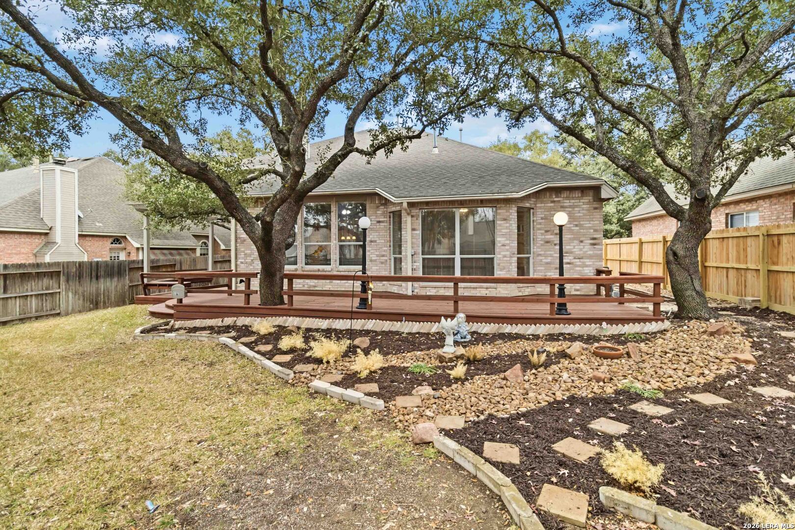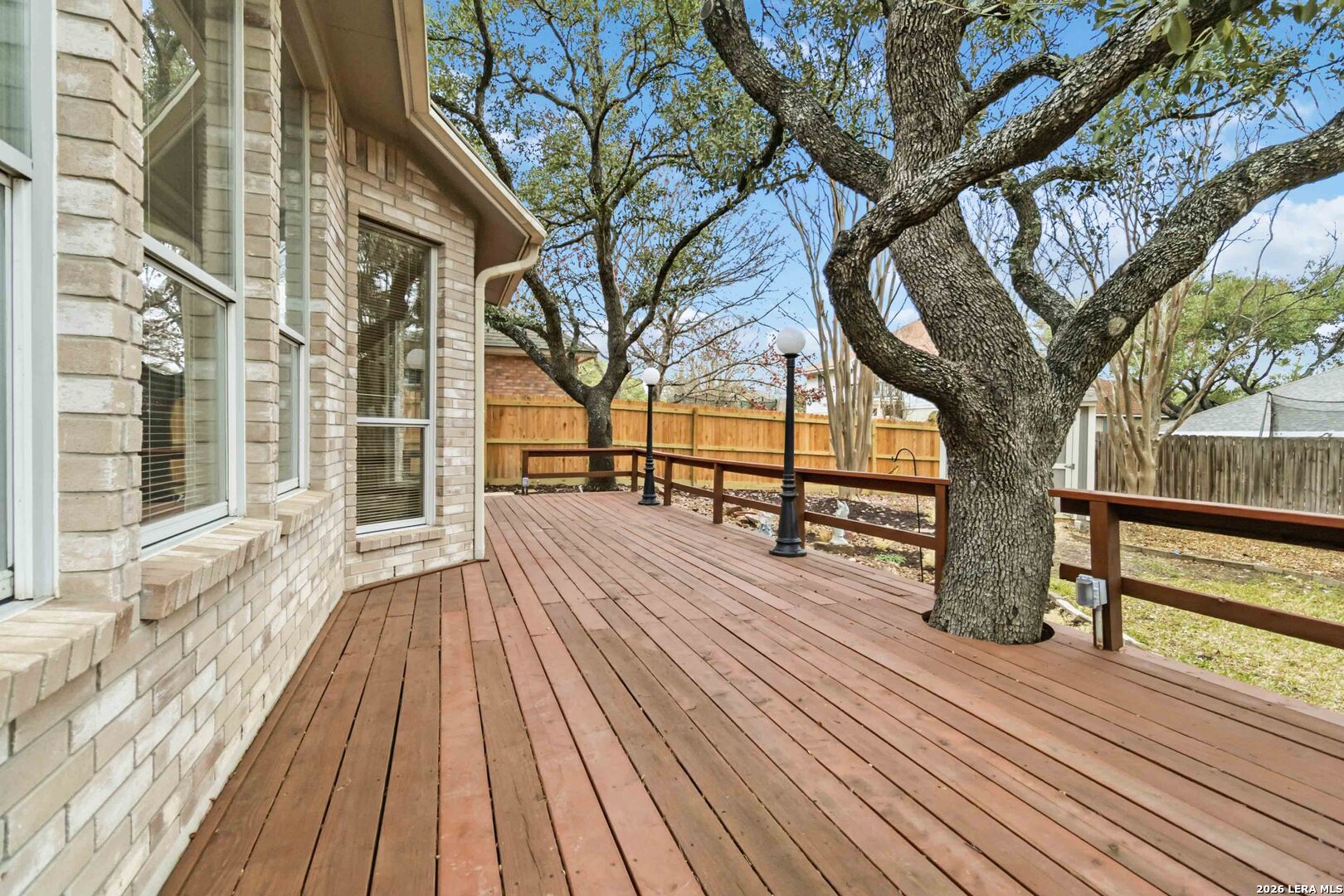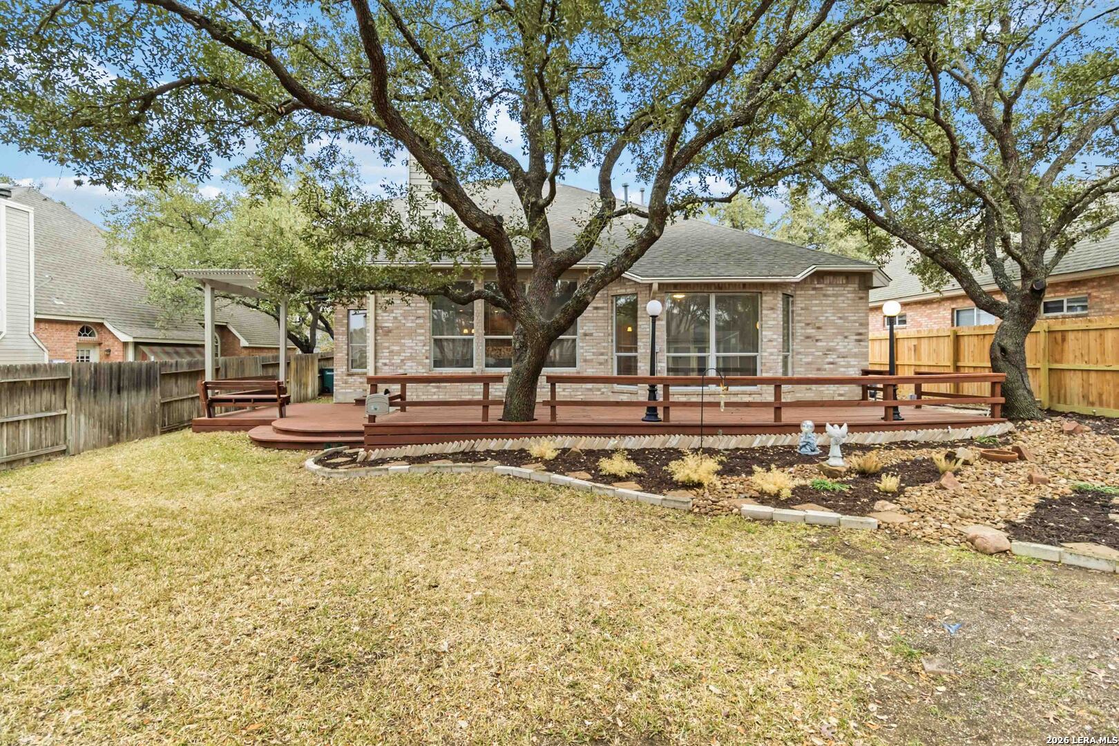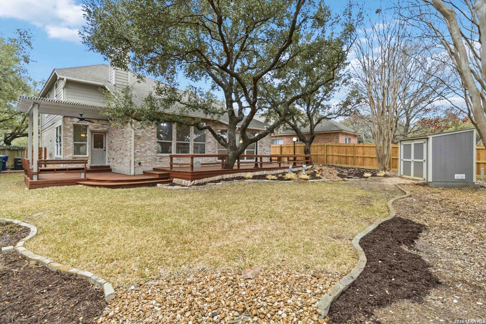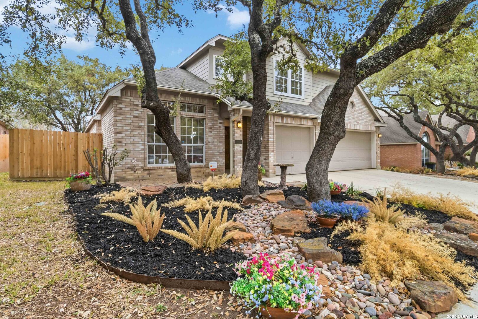 As you approach this home nestled beneath majestic oak trees in Santa Fe Trails, you immediately feel its timeless charm and welcoming presence. Stepping through the front door, your eyes are drawn upward to the soaring ceilings that create an open, airy, and light-filled atmosphere. Gorgeous wood floors guide you through the main living areas, adding warmth, character, and a seamless flow from room to room. To your left, the first living area feels perfect for conversation or quiet relaxation, while straight ahead the second expansive living space invites you to gather, entertain, or simply unwind in comfort. As you move toward the heart of the home, the beautifully updated kitchen shines - featuring custom cabinetry, gleaming granite countertops, and a stainless-steel refrigerator that conveys with the sale. You can easily imagine cooking, hosting, and making memories in this bright and functional space. Tucked away on the main level, the primary suite offers a peaceful retreat with charming bay window views overlooking the backyard. Inside, the refreshed spa-like walk-in shower and oversized closet make this space feel both luxurious and practical. Heading upstairs, you discover three additional bedrooms plus two flexible living areas - ideal for a home office, library, game room, study space, or cozy sitting area. New carpet, fresh paint, and updated ceiling fans make this entire level feel crisp and move-in ready. Back downstairs and out the back door, the home continues to impress with a relaxing pergola deck, a spacious yard, and a storage shed for extra convenience - perfect for outdoor living and entertaining. A three-car garage paired with a level driveway provides abundant parking and storage options. With added energy-efficient features like a tankless water heater, water softener, Seal & Insulate TAP Pest Control attic insulation, and a full sprinkler system, this home blends beauty, comfort, and smart living.