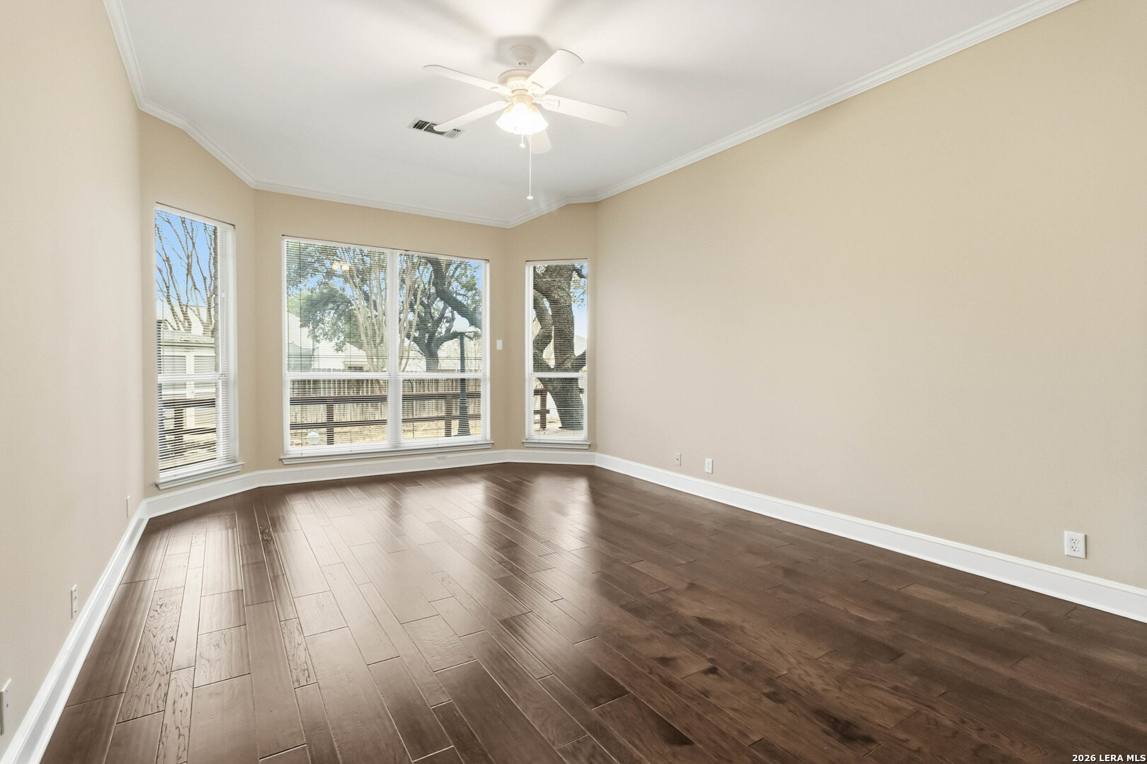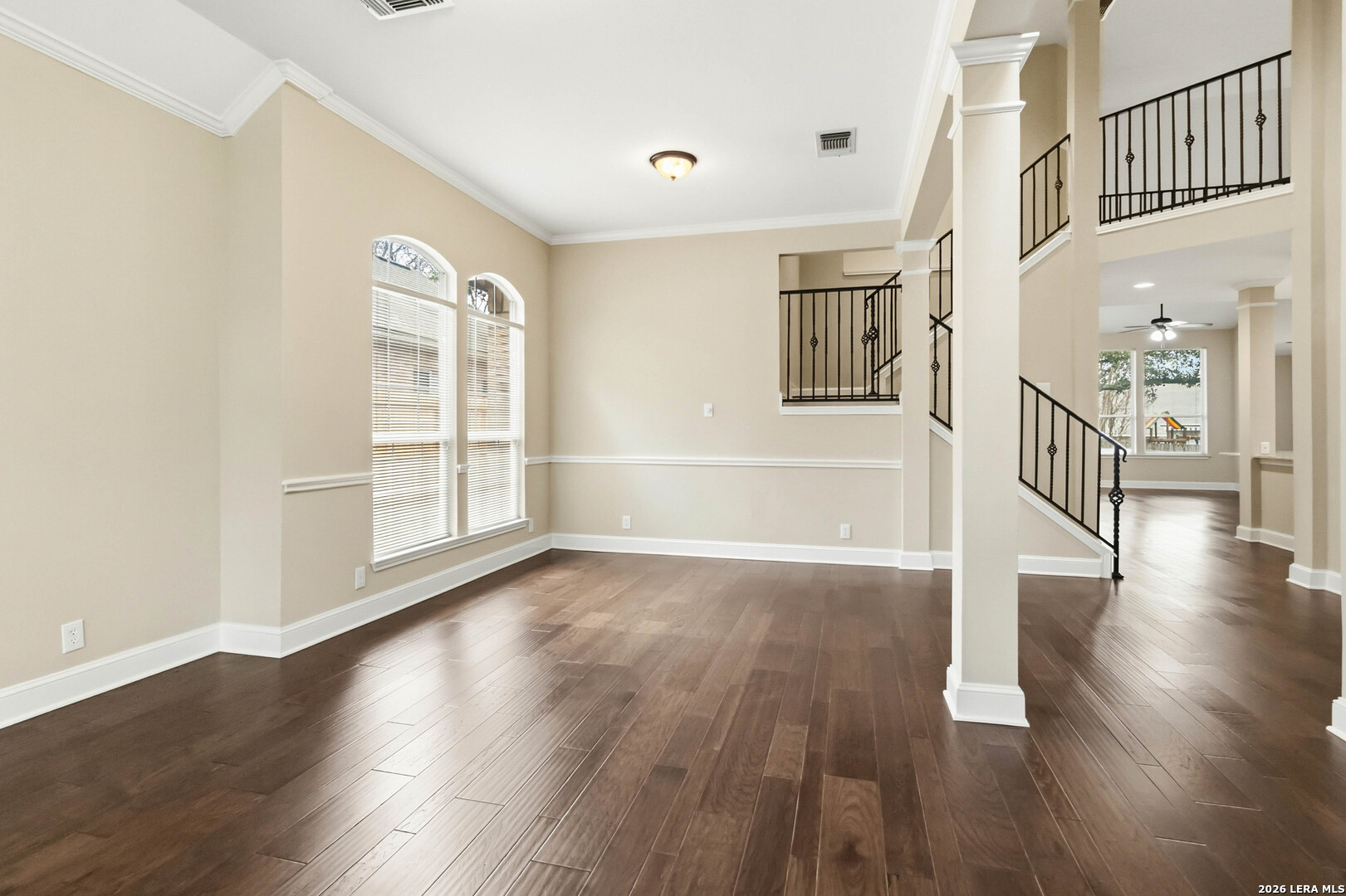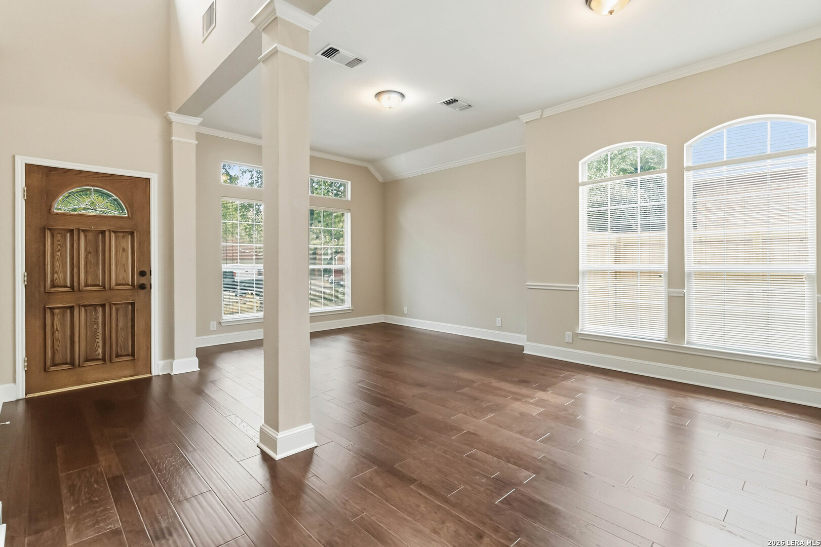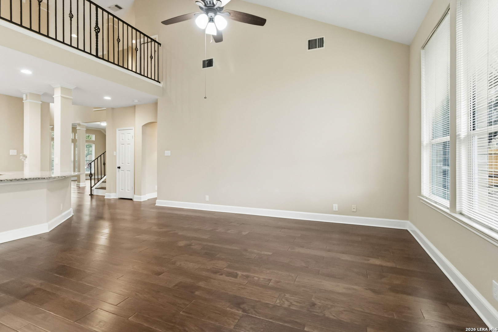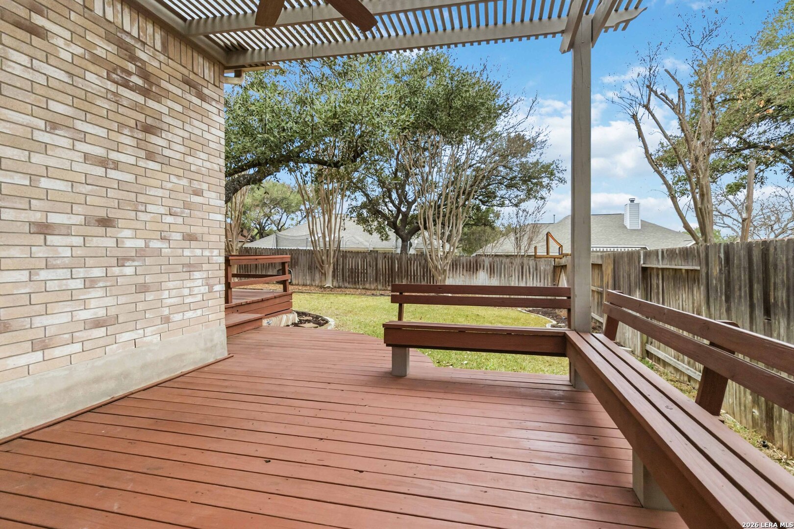 As you approach this home nestled beneath majestic oak trees in Santa Fe Trails, you immediately feel its timeless charm and welcoming presence. Stepping through the front door, your eyes are drawn upward to the soaring ceilings that create an open, airy, and light-filled atmosphere. Gorgeous wood floors guide you through the main living areas, adding warmth, character, and a seamless flow from room to room. To your left, the first living area feels perfect for conversation or quiet relaxation, while straight ahead the second expansive living space invites you to gather, entertain, or simply unwind in comfort. As you move toward the heart of the home, the beautifully updated kitchen shines - featuring custom cabinetry, gleaming granite countertops, and a stainless-steel refrigerator that conveys with the sale. You can easily imagine cooking, hosting, and making memories in this bright and functional space. Tucked away on the main level, the primary suite offers a peaceful retreat with charming bay window views overlooking the backyard. Inside, the refreshed spa-like walk-in shower and oversized closet make this space feel both luxurious and practical. Heading upstairs, you discover three additional bedrooms plus two flexible living areas - ideal for a home office, library, game room, study space, or cozy sitting area. New carpet, fresh paint, and updated ceiling fans make this entire level feel crisp and move-in ready. Back downstairs and out the back door, the home continues to impress with a relaxing pergola deck, a spacious yard, and a storage shed for extra convenience - perfect for outdoor living and entertaining. A three-car garage paired with a level driveway provides abundant parking and storage options. With added energy-efficient features like a tankless water heater, water softener, Seal & Insulate TAP Pest Control attic insulation, and a full sprinkler system, this home blends beauty, comfort, and smart living.